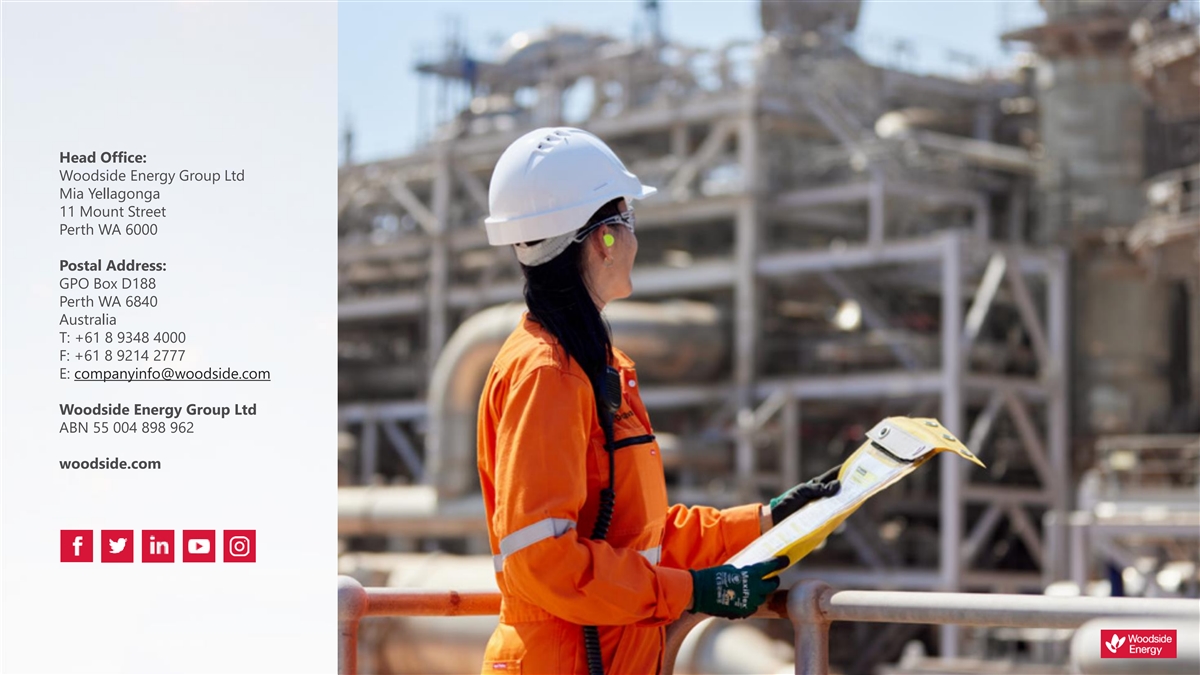 Head Office: Woodside Energy Group Ltd Mia Yellagonga 11 Mount Street Perth WA 6000 Postal Address: GPO Box D188 Perth WA 6840 Australia T: +61 8 9348 4000 F: +61 8 9214 2777 E: companyinfo@woodside.com Woodside Energy Group Ltd ABN 55 004 898 962 woodside.com