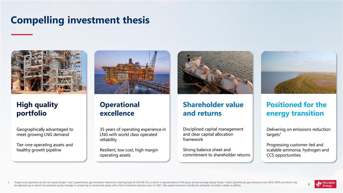 Unique portfolio of global high quality LNG and deepwater oil assets Western Australia LNG operating 1 Market capitalisation experience 326 Mboe/d ~$ East coast Australia 35 years 35 billion 47 Mboe/d Houston 2 3 Production LNG sales > Mboe/d 500 263 Mboe/d Gulf of Mexico 91 Mboe/d 1 Perth Global employees Annualised dividend yield Trinidad & Tobago > 4,500 % 7.3 25 Mboe/d Production, all Gas Oil 3 figures in Mboe/d 1. Calculated based on Woodside’s closing share price on 28 June 2024 of A$28.21 and a USD/AUD exchange rate of 0.67. 2. 2024 Full-Year production guidance is 505-533 Mboe/day. 5 3. 2024 Half-Year Results.