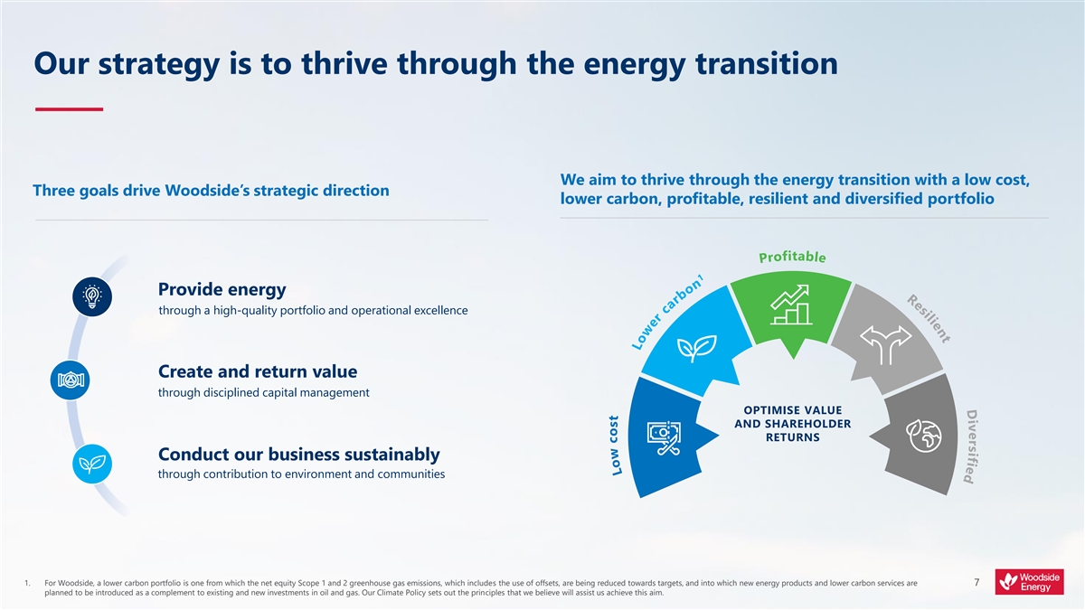 d e i f i s r e v i D t n e i l i s e R e l b a t Our strategy is to thrive through the energy transition We aim to thrive through the energy transition with a low cost, Three goals drive Woodside’s strategic direction lower carbon, profitable, resilient and diversified portfolio Provide energy through a high-quality portfolio and operational excellence Create and return value through disciplined capital management OPTIMISE VALUE AND SHAREHOLDER RETURNS Conduct our business sustainably through contribution to environment and communities 1. For Woodside, a lower carbon portfolio is one from which the net equity Scope 1 and 2 greenhouse gas emissions, which includes the use of offsets, are being reduced towards targets, and into which new energy products and lower carbon services are 7 planned to be introduced as a complement to existing and new investments in oil and gas. Our Climate Policy sets out the principles that we believe will assist us achieve this aim. i f o r P 1 n o b r a c r e w o L t s o c w o L