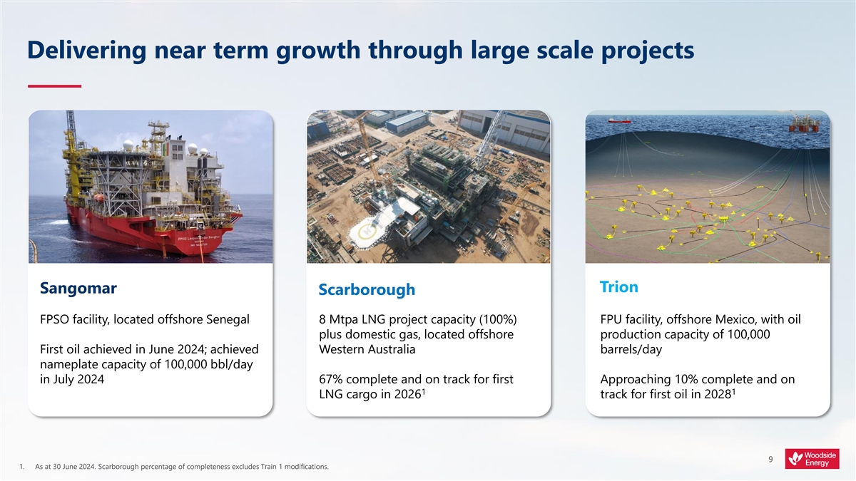 Building strong business foundations 2023 | Took FID for the Trion development Executed additional merchant LNG offtake 2021 | Took FID for the Scarborough 2013 | Executed Energy Project first merchant LNG offtake contract Began establishing Karratha Gas Plant 2024 | Production 1989 | First LNG portfolio commenced from LNG cargo marketing strategy Sangomar delivered from NWS Project 2022 | Completed Acquisitions of merger with BHP’s Tellurian and petroleum business Driftwood LNG and expanding OCI’s Clean Ammonia 2020 | Sangomar 1,2 operations globally Project Field Development Phase 1 approved 2012 | First LNG cargo delivered 1984 | First from Pluto LNG production of Sangomar FPSO domestic gas from NWS 1. Acquisition of OCI’s Beaumont Clean Ammonia Project is subject to satisfaction of customary conditions precedent including OCI N.V. shareholder approval. 8 2. Acquisition of Tellurian and the Driftwood LNG Development is subject to satisfaction of customary conditions precedent, including Tellurian shareholder approval, regulatory approval and other approvals.