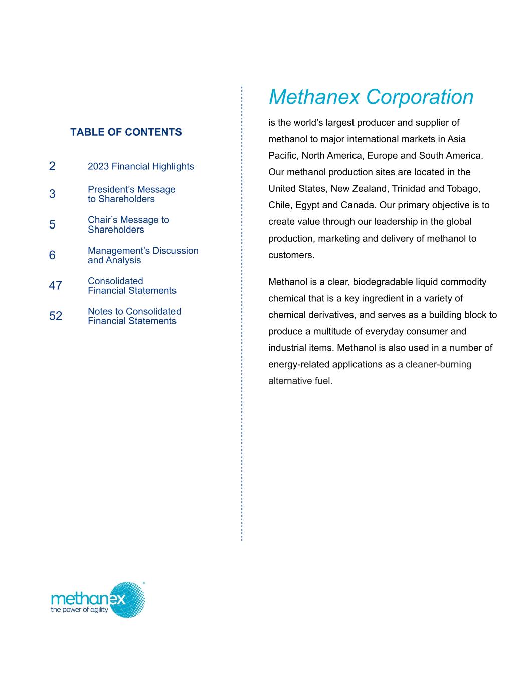TABLE OF CONTENTS 2 2023 Financial Highlights 3 President’s Message to Shareholders 5 Chair’s Message to Shareholders 6 Management’s Discussion and Analysis 47 Consolidated Financial Statements 52 Notes to Consolidated Financial Statements Methanex Corporation is the world’s largest producer and supplier of methanol to major international markets in Asia Pacific, North America, Europe and South America. Our methanol production sites are located in the United States, New Zealand, Trinidad and Tobago, Chile, Egypt and Canada. Our primary objective is to create value through our leadership in the global production, marketing and delivery of methanol to customers. Methanol is a clear, biodegradable liquid commodity chemical that is a key ingredient in a variety of chemical derivatives, and serves as a building block to produce a multitude of everyday consumer and industrial items. Methanol is also used in a number of energy-related applications as a cleaner-burning alternative fuel.