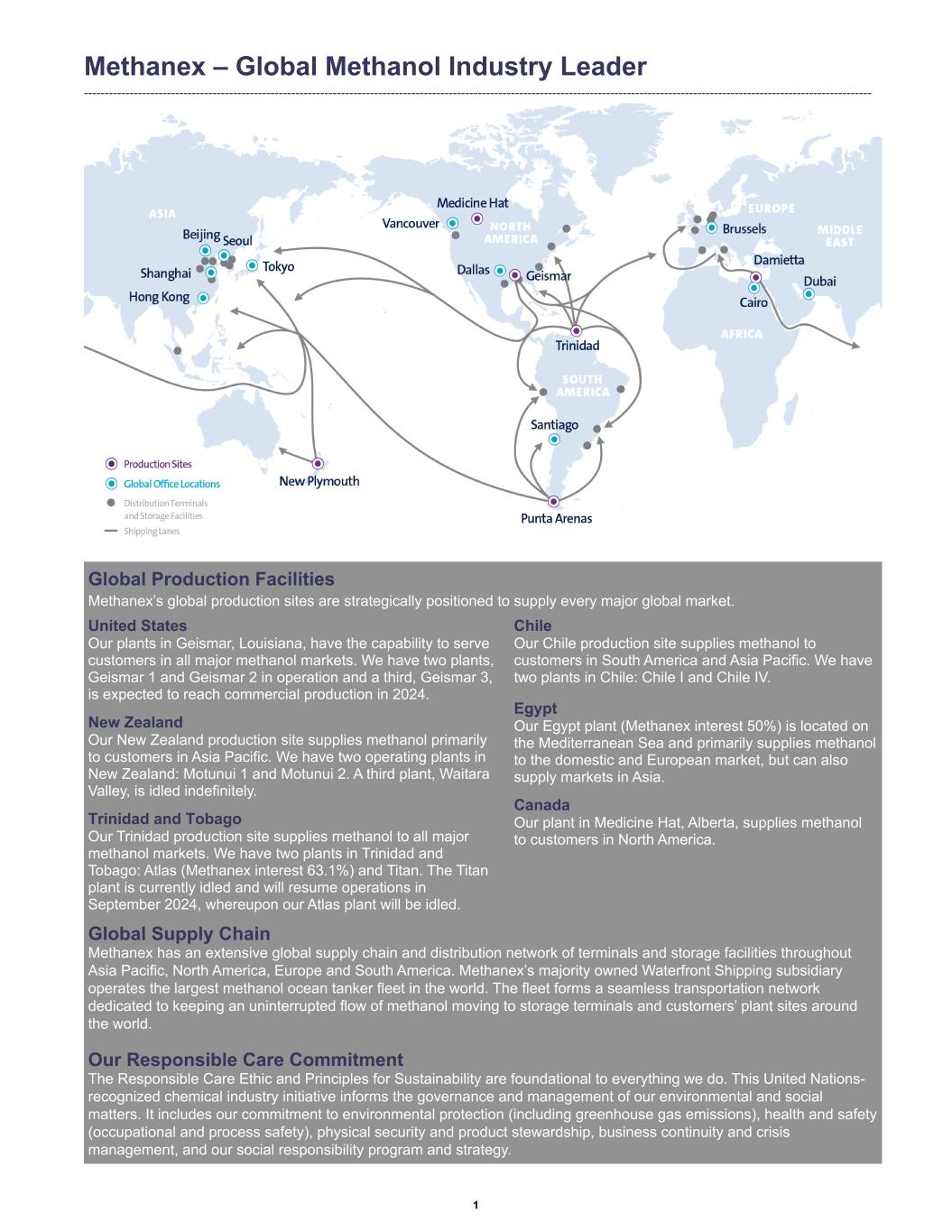 Methanex – Global Methanol Industry Leader ---------------------------------------------------------------------------------------------------------------------------------------------------------------------------------------------- Global Production Facilities Methanex’s global production sites are strategically positioned to supply every major global market. United States Our plants in Geismar, Louisiana, have the capability to serve customers in all major methanol markets. We have two plants, Geismar 1 and Geismar 2 in operation and a third, Geismar 3, is expected to reach commercial production in 2024. New Zealand Our New Zealand production site supplies methanol primarily to customers in Asia Pacific. We have two operating plants in New Zealand: Motunui 1 and Motunui 2. A third plant, Waitara Valley, is idled indefinitely. Trinidad and Tobago Our Trinidad production site supplies methanol to all major methanol markets. We have two plants in Trinidad and Tobago: Atlas (Methanex interest 63.1%) and Titan. The Titan plant is currently idled and will resume operations in September 2024, whereupon our Atlas plant will be idled. Chile Our Chile production site supplies methanol to customers in South America and Asia Pacific. We have two plants in Chile: Chile I and Chile IV. Egypt Our Egypt plant (Methanex interest 50%) is located on the Mediterranean Sea and primarily supplies methanol to the domestic and European market, but can also supply markets in Asia. Canada Our plant in Medicine Hat, Alberta, supplies methanol to customers in North America. Global Supply Chain Methanex has an extensive global supply chain and distribution network of terminals and storage facilities throughout Asia Pacific, North America, Europe and South America. Methanex’s majority owned Waterfront Shipping subsidiary operates the largest methanol ocean tanker fleet in the world. The fleet forms a seamless transportation network dedicated to keeping an uninterrupted flow of methanol moving to storage terminals and customers’ plant sites around the world. Our Responsible Care Commitment The Responsible Care Ethic and Principles for Sustainability are foundational to everything we do. This United Nations- recognized chemical industry initiative informs the governance and management of our environmental and social matters. It includes our commitment to environmental protection (including greenhouse gas emissions), health and safety (occupational and process safety), physical security and product stewardship, business continuity and crisis management, and our social responsibility program and strategy. 1