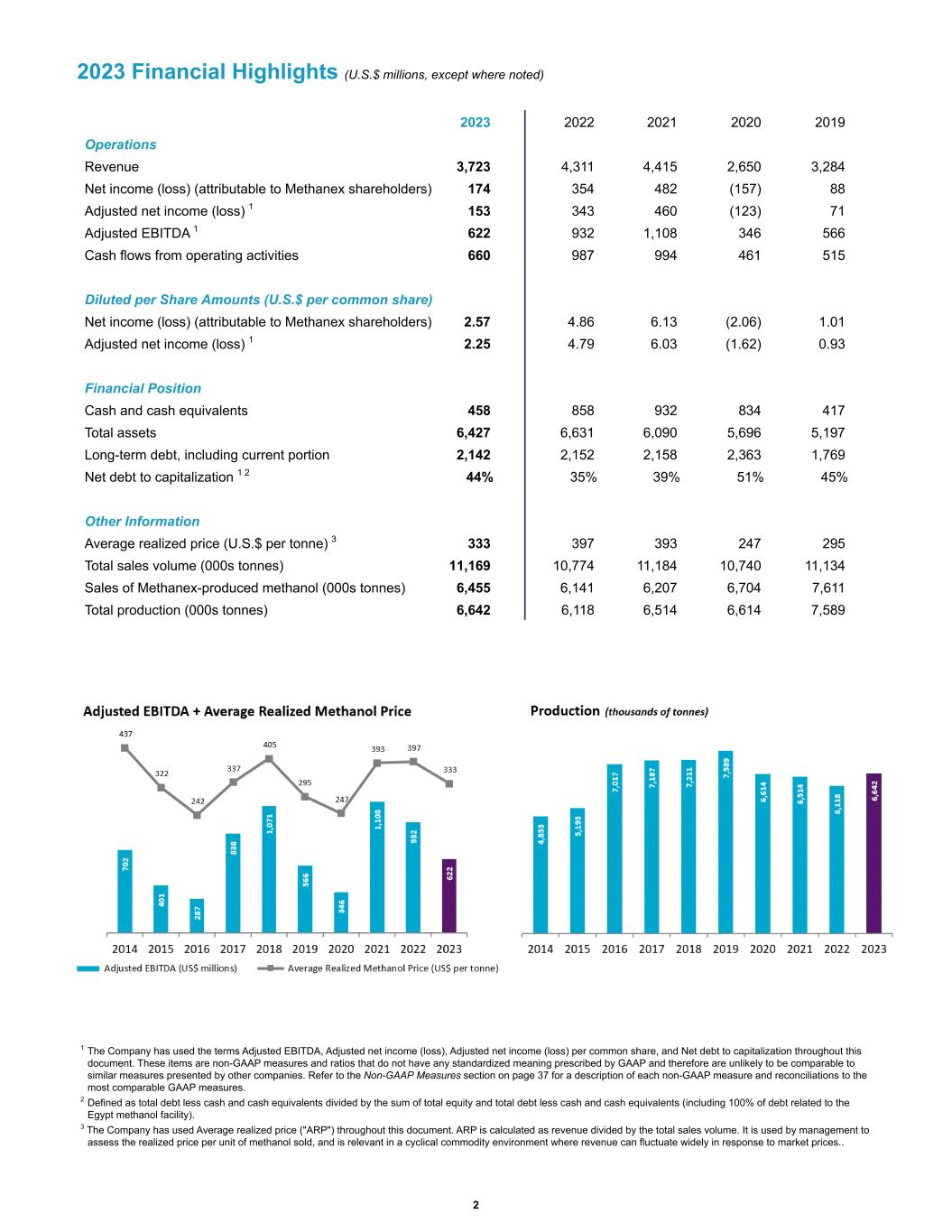2023 Financial Highlights (U.S.$ millions, except where noted) Operations Revenue 3,723 4,311 4,415 2,650 3,284 Net income (loss) (attributable to Methanex shareholders) 174 354 482 (157) 88 Adjusted net income (loss) 1 153 343 460 (123) 71 Adjusted EBITDA 1 622 932 1,108 346 566 Cash flows from operating activities 660 987 994 461 515 Diluted per Share Amounts (U.S.$ per common share) Net income (loss) (attributable to Methanex shareholders) 2.57 4.86 6.13 (2.06) 1.01 Adjusted net income (loss) 1 2.25 4.79 6.03 (1.62) 0.93 Financial Position Cash and cash equivalents 458 858 932 834 417 Total assets 6,427 6,631 6,090 5,696 5,197 Long-term debt, including current portion 2,142 2,152 2,158 2,363 1,769 Net debt to capitalization 1 2 44 % 35 % 39 % 51 % 45 % Other Information Average realized price (U.S.$ per tonne) 3 333 397 393 247 295 Total sales volume (000s tonnes) 11,169 10,774 11,184 10,740 11,134 Sales of Methanex-produced methanol (000s tonnes) 6,455 6,141 6,207 6,704 7,611 Total production (000s tonnes) 6,642 6,118 6,514 6,614 7,589 2023 2022 2021 2020 2019 1 The Company has used the terms Adjusted EBITDA, Adjusted net income (loss), Adjusted net income (loss) per common share, and Net debt to capitalization throughout this document. These items are non-GAAP measures and ratios that do not have any standardized meaning prescribed by GAAP and therefore are unlikely to be comparable to similar measures presented by other companies. Refer to the Non-GAAP Measures section on page 37 for a description of each non-GAAP measure and reconciliations to the most comparable GAAP measures. 2 Defined as total debt less cash and cash equivalents divided by the sum of total equity and total debt less cash and cash equivalents (including 100% of debt related to the Egypt methanol facility). 3 The Company has used Average realized price ("ARP") throughout this document. ARP is calculated as revenue divided by the total sales volume. It is used by management to assess the realized price per unit of methanol sold, and is relevant in a cyclical commodity environment where revenue can fluctuate widely in response to market prices.. 2