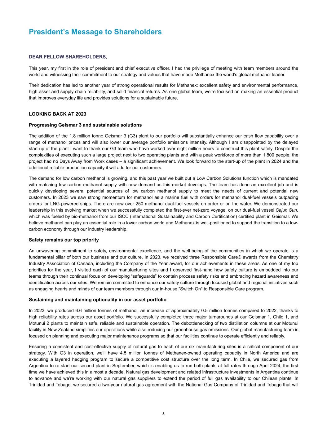 President’s Message to Shareholders DEAR FELLOW SHAREHOLDERS, This year, my first in the role of president and chief executive officer, I had the privilege of meeting with team members around the world and witnessing their commitment to our strategy and values that have made Methanex the world’s global methanol leader. Their dedication has led to another year of strong operational results for Methanex: excellent safety and environmental performance, high asset and supply chain reliability, and solid financial returns. As one global team, we’re focused on making an essential product that improves everyday life and provides solutions for a sustainable future. LOOKING BACK AT 2023 Progressing Geismar 3 and sustainable solutions The addition of the 1.8 million tonne Geismar 3 (G3) plant to our portfolio will substantially enhance our cash flow capability over a range of methanol prices and will also lower our average portfolio emissions intensity. Although I am disappointed by the delayed start-up of the plant I want to thank our G3 team who have worked over eight million hours to construct this plant safely. Despite the complexities of executing such a large project next to two operating plants and with a peak workforce of more than 1,800 people, the project had no Days Away from Work cases – a significant achievement. We look forward to the start-up of the plant in 2024 and the additional reliable production capacity it will add for our customers. The demand for low carbon methanol is growing, and this past year we built out a Low Carbon Solutions function which is mandated with matching low carbon methanol supply with new demand as this market develops. The team has done an excellent job and is quickly developing several potential sources of low carbon methanol supply to meet the needs of current and potential new customers. In 2023 we saw strong momentum for methanol as a marine fuel with orders for methanol dual-fuel vessels outpacing orders for LNG-powered ships. There are now over 250 methanol dual-fuel vessels on order or on the water. We demonstrated our leadership in this evolving market when we successfully completed the first-ever net-zero voyage, on our dual-fuel vessel Cajun Sun, which was fueled by bio-methanol from our ISCC (International Sustainability and Carbon Certification) certified plant in Geismar. We believe methanol can play an essential role in a lower carbon world and Methanex is well-positioned to support the transition to a low- carbon economy through our industry leadership. Safety remains our top priority An unwavering commitment to safety, environmental excellence, and the well-being of the communities in which we operate is a fundamental pillar of both our business and our culture. In 2023, we received three Responsible Care® awards from the Chemistry Industry Association of Canada, including the Company of the Year award, for our achievements in these areas. As one of my top priorities for the year, I visited each of our manufacturing sites and I observed first-hand how safety culture is embedded into our teams through their continual focus on developing “safeguards” to contain process safety risks and embracing hazard awareness and identification across our sites. We remain committed to enhance our safety culture through focused global and regional initiatives such as engaging hearts and minds of our team members through our in-house "Switch On" to Responsible Care program. Sustaining and maintaining optionality in our asset portfolio In 2023, we produced 6.6 million tonnes of methanol, an increase of approximately 0.5 million tonnes compared to 2022, thanks to high reliability rates across our asset portfolio. We successfully completed three major turnarounds at our Geismar 1, Chile 1, and Motunui 2 plants to maintain safe, reliable and sustainable operation. The debottlenecking of two distillation columns at our Motunui facility in New Zealand simplifies our operations while also reducing our greenhouse gas emissions. Our global manufacturing team is focused on planning and executing major maintenance programs so that our facilities continue to operate efficiently and reliably. Ensuring a consistent and cost-effective supply of natural gas to each of our six manufacturing sites is a critical component of our strategy. With G3 in operation, we’ll have 4.5 million tonnes of Methanex-owned operating capacity in North America and are executing a layered hedging program to secure a competitive cost structure over the long term. In Chile, we secured gas from Argentina to re-start our second plant in September, which is enabling us to run both plants at full rates through April 2024, the first time we have achieved this in almost a decade. Natural gas development and related infrastructure investments in Argentina continue to advance and we’re working with our natural gas suppliers to extend the period of full gas availability to our Chilean plants. In Trinidad and Tobago, we secured a two-year natural gas agreement with the National Gas Company of Trinidad and Tobago that will 3