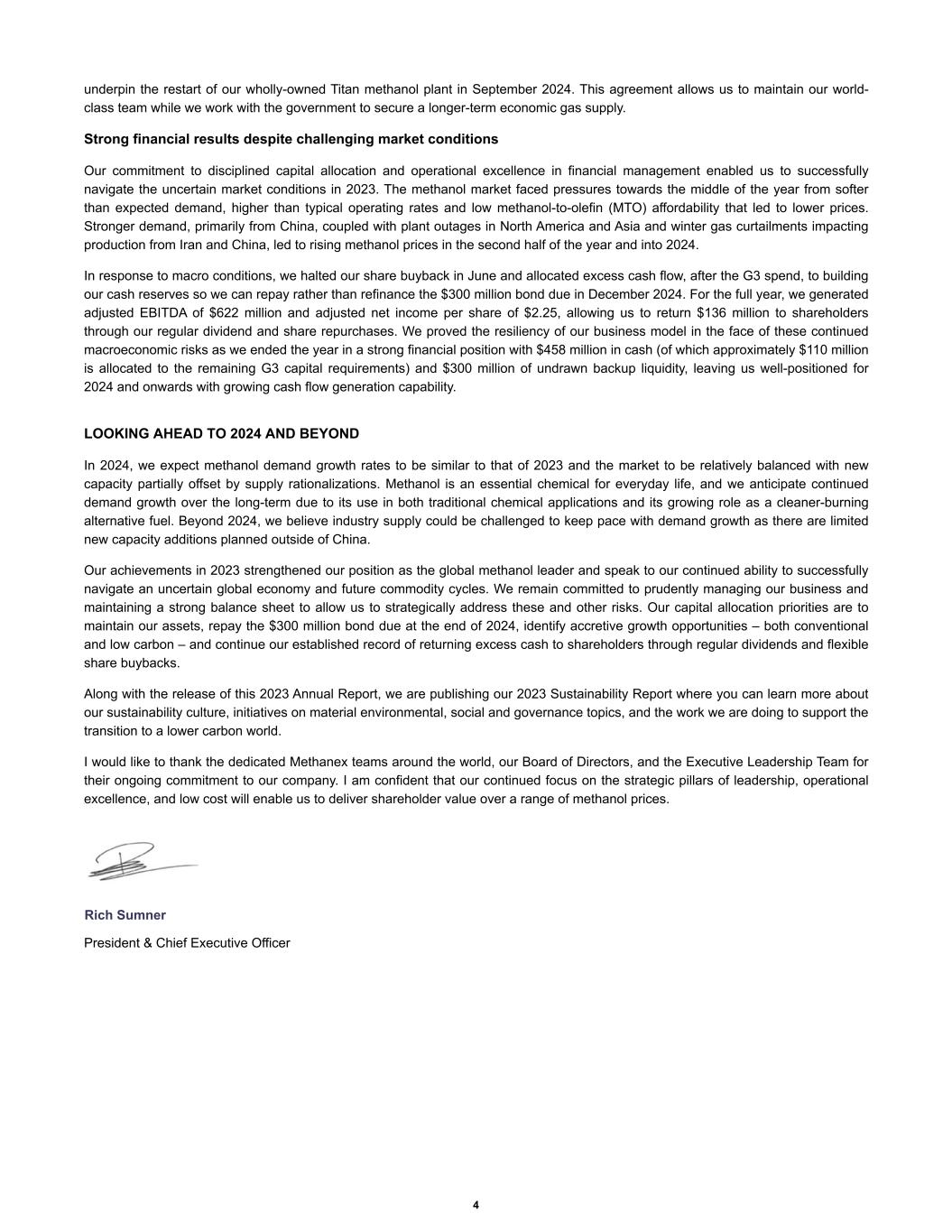 underpin the restart of our wholly-owned Titan methanol plant in September 2024. This agreement allows us to maintain our world- class team while we work with the government to secure a longer-term economic gas supply. Strong financial results despite challenging market conditions Our commitment to disciplined capital allocation and operational excellence in financial management enabled us to successfully navigate the uncertain market conditions in 2023. The methanol market faced pressures towards the middle of the year from softer than expected demand, higher than typical operating rates and low methanol-to-olefin (MTO) affordability that led to lower prices. Stronger demand, primarily from China, coupled with plant outages in North America and Asia and winter gas curtailments impacting production from Iran and China, led to rising methanol prices in the second half of the year and into 2024. In response to macro conditions, we halted our share buyback in June and allocated excess cash flow, after the G3 spend, to building our cash reserves so we can repay rather than refinance the $300 million bond due in December 2024. For the full year, we generated adjusted EBITDA of $622 million and adjusted net income per share of $2.25, allowing us to return $136 million to shareholders through our regular dividend and share repurchases. We proved the resiliency of our business model in the face of these continued macroeconomic risks as we ended the year in a strong financial position with $458 million in cash (of which approximately $110 million is allocated to the remaining G3 capital requirements) and $300 million of undrawn backup liquidity, leaving us well-positioned for 2024 and onwards with growing cash flow generation capability. LOOKING AHEAD TO 2024 AND BEYOND In 2024, we expect methanol demand growth rates to be similar to that of 2023 and the market to be relatively balanced with new capacity partially offset by supply rationalizations. Methanol is an essential chemical for everyday life, and we anticipate continued demand growth over the long-term due to its use in both traditional chemical applications and its growing role as a cleaner-burning alternative fuel. Beyond 2024, we believe industry supply could be challenged to keep pace with demand growth as there are limited new capacity additions planned outside of China. Our achievements in 2023 strengthened our position as the global methanol leader and speak to our continued ability to successfully navigate an uncertain global economy and future commodity cycles. We remain committed to prudently managing our business and maintaining a strong balance sheet to allow us to strategically address these and other risks. Our capital allocation priorities are to maintain our assets, repay the $300 million bond due at the end of 2024, identify accretive growth opportunities – both conventional and low carbon – and continue our established record of returning excess cash to shareholders through regular dividends and flexible share buybacks. Along with the release of this 2023 Annual Report, we are publishing our 2023 Sustainability Report where you can learn more about our sustainability culture, initiatives on material environmental, social and governance topics, and the work we are doing to support the transition to a lower carbon world. I would like to thank the dedicated Methanex teams around the world, our Board of Directors, and the Executive Leadership Team for their ongoing commitment to our company. I am confident that our continued focus on the strategic pillars of leadership, operational excellence, and low cost will enable us to deliver shareholder value over a range of methanol prices. Rich Sumner President & Chief Executive Officer 4