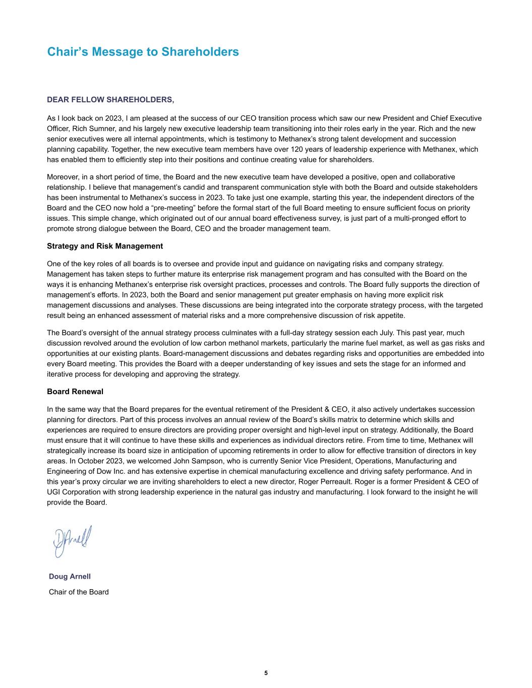 Chair’s Message to Shareholders DEAR FELLOW SHAREHOLDERS, As I look back on 2023, I am pleased at the success of our CEO transition process which saw our new President and Chief Executive Officer, Rich Sumner, and his largely new executive leadership team transitioning into their roles early in the year. Rich and the new senior executives were all internal appointments, which is testimony to Methanex’s strong talent development and succession planning capability. Together, the new executive team members have over 120 years of leadership experience with Methanex, which has enabled them to efficiently step into their positions and continue creating value for shareholders. Moreover, in a short period of time, the Board and the new executive team have developed a positive, open and collaborative relationship. I believe that management’s candid and transparent communication style with both the Board and outside stakeholders has been instrumental to Methanex’s success in 2023. To take just one example, starting this year, the independent directors of the Board and the CEO now hold a “pre-meeting” before the formal start of the full Board meeting to ensure sufficient focus on priority issues. This simple change, which originated out of our annual board effectiveness survey, is just part of a multi-pronged effort to promote strong dialogue between the Board, CEO and the broader management team. Strategy and Risk Management One of the key roles of all boards is to oversee and provide input and guidance on navigating risks and company strategy. Management has taken steps to further mature its enterprise risk management program and has consulted with the Board on the ways it is enhancing Methanex’s enterprise risk oversight practices, processes and controls. The Board fully supports the direction of management’s efforts. In 2023, both the Board and senior management put greater emphasis on having more explicit risk management discussions and analyses. These discussions are being integrated into the corporate strategy process, with the targeted result being an enhanced assessment of material risks and a more comprehensive discussion of risk appetite. The Board’s oversight of the annual strategy process culminates with a full-day strategy session each July. This past year, much discussion revolved around the evolution of low carbon methanol markets, particularly the marine fuel market, as well as gas risks and opportunities at our existing plants. Board-management discussions and debates regarding risks and opportunities are embedded into every Board meeting. This provides the Board with a deeper understanding of key issues and sets the stage for an informed and iterative process for developing and approving the strategy. Board Renewal In the same way that the Board prepares for the eventual retirement of the President & CEO, it also actively undertakes succession planning for directors. Part of this process involves an annual review of the Board’s skills matrix to determine which skills and experiences are required to ensure directors are providing proper oversight and high-level input on strategy. Additionally, the Board must ensure that it will continue to have these skills and experiences as individual directors retire. From time to time, Methanex will strategically increase its board size in anticipation of upcoming retirements in order to allow for effective transition of directors in key areas. In October 2023, we welcomed John Sampson, who is currently Senior Vice President, Operations, Manufacturing and Engineering of Dow Inc. and has extensive expertise in chemical manufacturing excellence and driving safety performance. And in this year’s proxy circular we are inviting shareholders to elect a new director, Roger Perreault. Roger is a former President & CEO of UGI Corporation with strong leadership experience in the natural gas industry and manufacturing. I look forward to the insight he will provide the Board. Doug Arnell Chair of the Board 5