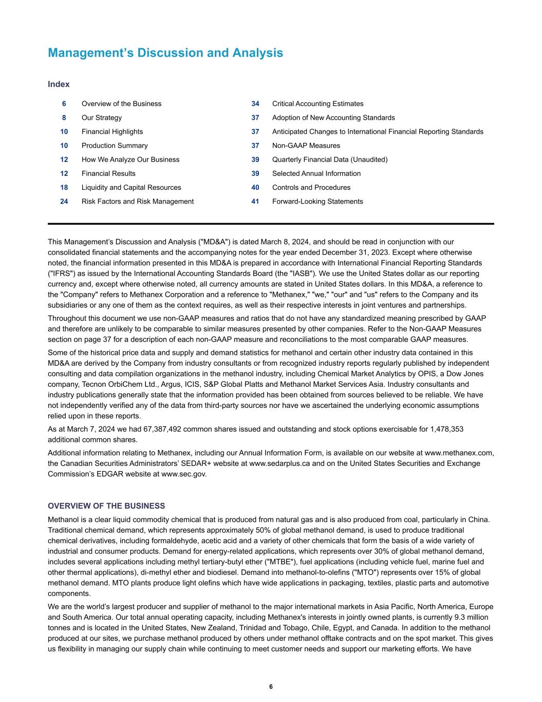 Management’s Discussion and Analysis Index 6 Overview of the Business 34 Critical Accounting Estimates 8 Our Strategy 37 Adoption of New Accounting Standards 10 Financial Highlights 37 Anticipated Changes to International Financial Reporting Standards 10 Production Summary 37 Non-GAAP Measures 12 How We Analyze Our Business 39 Quarterly Financial Data (Unaudited) 12 Financial Results 39 Selected Annual Information 18 Liquidity and Capital Resources 40 Controls and Procedures 24 Risk Factors and Risk Management 41 Forward-Looking Statements This Management’s Discussion and Analysis ("MD&A") is dated March 8, 2024, and should be read in conjunction with our consolidated financial statements and the accompanying notes for the year ended December 31, 2023. Except where otherwise noted, the financial information presented in this MD&A is prepared in accordance with International Financial Reporting Standards ("IFRS") as issued by the International Accounting Standards Board (the "IASB"). We use the United States dollar as our reporting currency and, except where otherwise noted, all currency amounts are stated in United States dollars. In this MD&A, a reference to the "Company" refers to Methanex Corporation and a reference to "Methanex," "we," "our" and "us" refers to the Company and its subsidiaries or any one of them as the context requires, as well as their respective interests in joint ventures and partnerships. Throughout this document we use non-GAAP measures and ratios that do not have any standardized meaning prescribed by GAAP and therefore are unlikely to be comparable to similar measures presented by other companies. Refer to the Non-GAAP Measures section on page 37 for a description of each non-GAAP measure and reconciliations to the most comparable GAAP measures. Some of the historical price data and supply and demand statistics for methanol and certain other industry data contained in this MD&A are derived by the Company from industry consultants or from recognized industry reports regularly published by independent consulting and data compilation organizations in the methanol industry, including Chemical Market Analytics by OPIS, a Dow Jones company, Tecnon OrbiChem Ltd., Argus, ICIS, S&P Global Platts and Methanol Market Services Asia. Industry consultants and industry publications generally state that the information provided has been obtained from sources believed to be reliable. We have not independently verified any of the data from third-party sources nor have we ascertained the underlying economic assumptions relied upon in these reports. As at March 7, 2024 we had 67,387,492 common shares issued and outstanding and stock options exercisable for 1,478,353 additional common shares. Additional information relating to Methanex, including our Annual Information Form, is available on our website at www.methanex.com, the Canadian Securities Administrators’ SEDAR+ website at www.sedarplus.ca and on the United States Securities and Exchange Commission’s EDGAR website at www.sec.gov. OVERVIEW OF THE BUSINESS Methanol is a clear liquid commodity chemical that is produced from natural gas and is also produced from coal, particularly in China. Traditional chemical demand, which represents approximately 50% of global methanol demand, is used to produce traditional chemical derivatives, including formaldehyde, acetic acid and a variety of other chemicals that form the basis of a wide variety of industrial and consumer products. Demand for energy-related applications, which represents over 30% of global methanol demand, includes several applications including methyl tertiary-butyl ether ("MTBE"), fuel applications (including vehicle fuel, marine fuel and other thermal applications), di-methyl ether and biodiesel. Demand into methanol-to-olefins ("MTO") represents over 15% of global methanol demand. MTO plants produce light olefins which have wide applications in packaging, textiles, plastic parts and automotive components. We are the world’s largest producer and supplier of methanol to the major international markets in Asia Pacific, North America, Europe and South America. Our total annual operating capacity, including Methanex's interests in jointly owned plants, is currently 9.3 million tonnes and is located in the United States, New Zealand, Trinidad and Tobago, Chile, Egypt, and Canada. In addition to the methanol produced at our sites, we purchase methanol produced by others under methanol offtake contracts and on the spot market. This gives us flexibility in managing our supply chain while continuing to meet customer needs and support our marketing efforts. We have 6