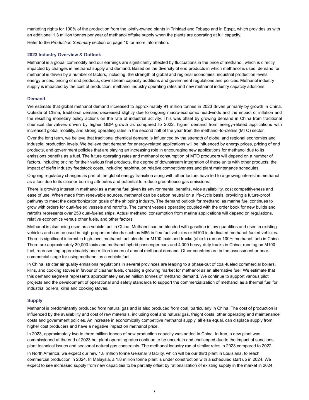 marketing rights for 100% of the production from the jointly-owned plants in Trinidad and Tobago and in Egypt, which provides us with an additional 1.3 million tonnes per year of methanol offtake supply when the plants are operating at full capacity. Refer to the Production Summary section on page 10 for more information. 2023 Industry Overview & Outlook Methanol is a global commodity and our earnings are significantly affected by fluctuations in the price of methanol, which is directly impacted by changes in methanol supply and demand. Based on the diversity of end products in which methanol is used, demand for methanol is driven by a number of factors, including: the strength of global and regional economies, industrial production levels, energy prices, pricing of end products, downstream capacity additions and government regulations and policies. Methanol industry supply is impacted by the cost of production, methanol industry operating rates and new methanol industry capacity additions. Demand We estimate that global methanol demand increased to approximately 91 million tonnes in 2023 driven primarily by growth in China. Outside of China, traditional demand decreased slightly due to ongoing macro-economic headwinds and the impact of inflation and the resulting monetary policy actions on the rate of industrial activity. This was offset by growing demand in China from traditional chemical derivatives driven by higher GDP growth as compared to 2022, higher demand from energy-related applications with increased global mobility, and strong operating rates in the second half of the year from the methanol-to-olefins (MTO) sector. Over the long term, we believe that traditional chemical demand is influenced by the strength of global and regional economies and industrial production levels. We believe that demand for energy-related applications will be influenced by energy prices, pricing of end products, and government policies that are playing an increasing role in encouraging new applications for methanol due to its emissions benefits as a fuel. The future operating rates and methanol consumption of MTO producers will depend on a number of factors, including pricing for their various final products, the degree of downstream integration of these units with other products, the impact of olefin industry feedstock costs, including naphtha, on relative competitiveness and plant maintenance schedules. Ongoing regulatory changes as part of the global energy transition along with other factors have led to a growing interest in methanol as a fuel due to its cleaner-burning attributes and potential to reduce greenhouse gas emissions. There is growing interest in methanol as a marine fuel given its environmental benefits, wide availability, cost competitiveness and ease of use. When made from renewable sources, methanol can be carbon neutral on a life-cycle basis, providing a future-proof pathway to meet the decarbonization goals of the shipping industry. The demand outlook for methanol as marine fuel continues to grow with orders for dual-fueled vessels and retrofits. The current vessels operating coupled with the order book for new builds and retrofits represents over 250 dual-fueled ships. Actual methanol consumption from marine applications will depend on regulations, relative economics versus other fuels, and other factors. Methanol is also being used as a vehicle fuel in China. Methanol can be blended with gasoline in low quantities and used in existing vehicles and can be used in high-proportion blends such as M85 in flex-fuel vehicles or M100 in dedicated methanol-fueled vehicles. There is significant interest in high-level methanol fuel blends for M100 taxis and trucks (able to run on 100% methanol fuel) in China. There are approximately 30,000 taxis and methanol hybrid passenger cars and 4,000 heavy-duty trucks in China, running on M100 fuel, representing approximately one million tonnes of annual methanol demand. Other countries are in the assessment or near- commercial stage for using methanol as a vehicle fuel. In China, stricter air quality emissions regulations in several provinces are leading to a phase-out of coal-fueled commercial boilers, kilns, and cooking stoves in favour of cleaner fuels, creating a growing market for methanol as an alternative fuel. We estimate that this demand segment represents approximately seven million tonnes of methanol demand. We continue to support various pilot projects and the development of operational and safety standards to support the commercialization of methanol as a thermal fuel for industrial boilers, kilns and cooking stoves. Supply Methanol is predominantly produced from natural gas and is also produced from coal, particularly in China. The cost of production is influenced by the availability and cost of raw materials, including coal and natural gas, freight costs, other operating and maintenance costs and government policies. An increase in economically competitive methanol supply, all else equal, can displace supply from higher cost producers and have a negative impact on methanol price. In 2023, approximately two to three million tonnes of new production capacity was added in China. In Iran, a new plant was commissioned at the end of 2023 but plant operating rates continue to be uncertain and challenged due to the impact of sanctions, plant technical issues and seasonal natural gas constraints. The methanol industry ran at similar rates in 2023 compared to 2022. In North America, we expect our new 1.8 million tonne Geismar 3 facility, which will be our third plant in Louisiana, to reach commercial production in 2024. In Malaysia, a 1.8 million tonne plant is under construction with a scheduled start up in 2024. We expect to see increased supply from new capacities to be partially offset by rationalization of existing supply in the market in 2024. 7