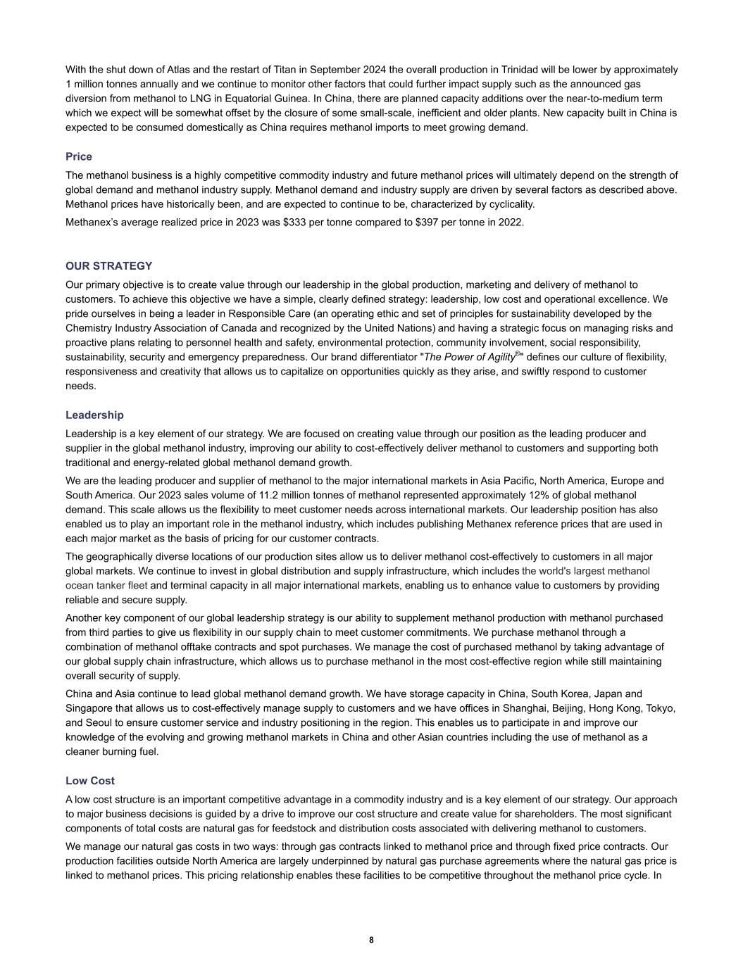 With the shut down of Atlas and the restart of Titan in September 2024 the overall production in Trinidad will be lower by approximately 1 million tonnes annually and we continue to monitor other factors that could further impact supply such as the announced gas diversion from methanol to LNG in Equatorial Guinea. In China, there are planned capacity additions over the near-to-medium term which we expect will be somewhat offset by the closure of some small-scale, inefficient and older plants. New capacity built in China is expected to be consumed domestically as China requires methanol imports to meet growing demand. Price The methanol business is a highly competitive commodity industry and future methanol prices will ultimately depend on the strength of global demand and methanol industry supply. Methanol demand and industry supply are driven by several factors as described above. Methanol prices have historically been, and are expected to continue to be, characterized by cyclicality. Methanex’s average realized price in 2023 was $333 per tonne compared to $397 per tonne in 2022. OUR STRATEGY Our primary objective is to create value through our leadership in the global production, marketing and delivery of methanol to customers. To achieve this objective we have a simple, clearly defined strategy: leadership, low cost and operational excellence. We pride ourselves in being a leader in Responsible Care (an operating ethic and set of principles for sustainability developed by the Chemistry Industry Association of Canada and recognized by the United Nations) and having a strategic focus on managing risks and proactive plans relating to personnel health and safety, environmental protection, community involvement, social responsibility, sustainability, security and emergency preparedness. Our brand differentiator "The Power of Agility®" defines our culture of flexibility, responsiveness and creativity that allows us to capitalize on opportunities quickly as they arise, and swiftly respond to customer needs. Leadership Leadership is a key element of our strategy. We are focused on creating value through our position as the leading producer and supplier in the global methanol industry, improving our ability to cost-effectively deliver methanol to customers and supporting both traditional and energy-related global methanol demand growth. We are the leading producer and supplier of methanol to the major international markets in Asia Pacific, North America, Europe and South America. Our 2023 sales volume of 11.2 million tonnes of methanol represented approximately 12% of global methanol demand. This scale allows us the flexibility to meet customer needs across international markets. Our leadership position has also enabled us to play an important role in the methanol industry, which includes publishing Methanex reference prices that are used in each major market as the basis of pricing for our customer contracts. The geographically diverse locations of our production sites allow us to deliver methanol cost-effectively to customers in all major global markets. We continue to invest in global distribution and supply infrastructure, which includes the world's largest methanol ocean tanker fleet and terminal capacity in all major international markets, enabling us to enhance value to customers by providing reliable and secure supply. Another key component of our global leadership strategy is our ability to supplement methanol production with methanol purchased from third parties to give us flexibility in our supply chain to meet customer commitments. We purchase methanol through a combination of methanol offtake contracts and spot purchases. We manage the cost of purchased methanol by taking advantage of our global supply chain infrastructure, which allows us to purchase methanol in the most cost-effective region while still maintaining overall security of supply. China and Asia continue to lead global methanol demand growth. We have storage capacity in China, South Korea, Japan and Singapore that allows us to cost-effectively manage supply to customers and we have offices in Shanghai, Beijing, Hong Kong, Tokyo, and Seoul to ensure customer service and industry positioning in the region. This enables us to participate in and improve our knowledge of the evolving and growing methanol markets in China and other Asian countries including the use of methanol as a cleaner burning fuel. Low Cost A low cost structure is an important competitive advantage in a commodity industry and is a key element of our strategy. Our approach to major business decisions is guided by a drive to improve our cost structure and create value for shareholders. The most significant components of total costs are natural gas for feedstock and distribution costs associated with delivering methanol to customers. We manage our natural gas costs in two ways: through gas contracts linked to methanol price and through fixed price contracts. Our production facilities outside North America are largely underpinned by natural gas purchase agreements where the natural gas price is linked to methanol prices. This pricing relationship enables these facilities to be competitive throughout the methanol price cycle. In 8