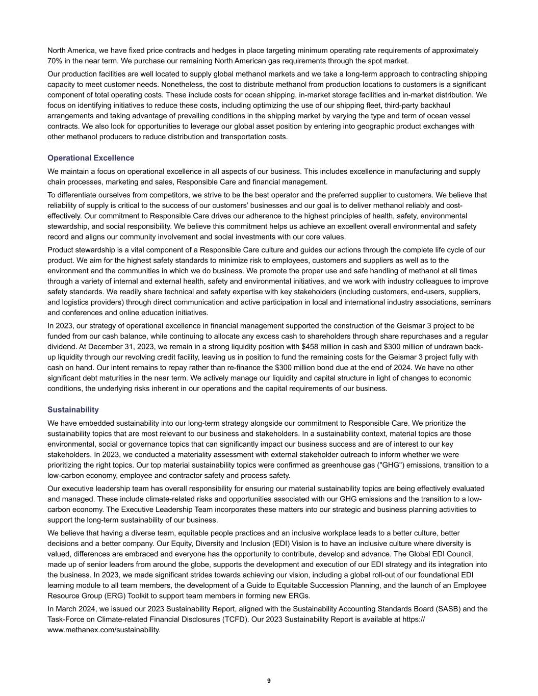 North America, we have fixed price contracts and hedges in place targeting minimum operating rate requirements of approximately 70% in the near term. We purchase our remaining North American gas requirements through the spot market. Our production facilities are well located to supply global methanol markets and we take a long-term approach to contracting shipping capacity to meet customer needs. Nonetheless, the cost to distribute methanol from production locations to customers is a significant component of total operating costs. These include costs for ocean shipping, in-market storage facilities and in-market distribution. We focus on identifying initiatives to reduce these costs, including optimizing the use of our shipping fleet, third-party backhaul arrangements and taking advantage of prevailing conditions in the shipping market by varying the type and term of ocean vessel contracts. We also look for opportunities to leverage our global asset position by entering into geographic product exchanges with other methanol producers to reduce distribution and transportation costs. Operational Excellence We maintain a focus on operational excellence in all aspects of our business. This includes excellence in manufacturing and supply chain processes, marketing and sales, Responsible Care and financial management. To differentiate ourselves from competitors, we strive to be the best operator and the preferred supplier to customers. We believe that reliability of supply is critical to the success of our customers’ businesses and our goal is to deliver methanol reliably and cost- effectively. Our commitment to Responsible Care drives our adherence to the highest principles of health, safety, environmental stewardship, and social responsibility. We believe this commitment helps us achieve an excellent overall environmental and safety record and aligns our community involvement and social investments with our core values. Product stewardship is a vital component of a Responsible Care culture and guides our actions through the complete life cycle of our product. We aim for the highest safety standards to minimize risk to employees, customers and suppliers as well as to the environment and the communities in which we do business. We promote the proper use and safe handling of methanol at all times through a variety of internal and external health, safety and environmental initiatives, and we work with industry colleagues to improve safety standards. We readily share technical and safety expertise with key stakeholders (including customers, end-users, suppliers, and logistics providers) through direct communication and active participation in local and international industry associations, seminars and conferences and online education initiatives. In 2023, our strategy of operational excellence in financial management supported the construction of the Geismar 3 project to be funded from our cash balance, while continuing to allocate any excess cash to shareholders through share repurchases and a regular dividend. At December 31, 2023, we remain in a strong liquidity position with $458 million in cash and $300 million of undrawn back- up liquidity through our revolving credit facility, leaving us in position to fund the remaining costs for the Geismar 3 project fully with cash on hand. Our intent remains to repay rather than re-finance the $300 million bond due at the end of 2024. We have no other significant debt maturities in the near term. We actively manage our liquidity and capital structure in light of changes to economic conditions, the underlying risks inherent in our operations and the capital requirements of our business. Sustainability We have embedded sustainability into our long-term strategy alongside our commitment to Responsible Care. We prioritize the sustainability topics that are most relevant to our business and stakeholders. In a sustainability context, material topics are those environmental, social or governance topics that can significantly impact our business success and are of interest to our key stakeholders. In 2023, we conducted a materiality assessment with external stakeholder outreach to inform whether we were prioritizing the right topics. Our top material sustainability topics were confirmed as greenhouse gas ("GHG") emissions, transition to a low-carbon economy, employee and contractor safety and process safety. Our executive leadership team has overall responsibility for ensuring our material sustainability topics are being effectively evaluated and managed. These include climate-related risks and opportunities associated with our GHG emissions and the transition to a low- carbon economy. The Executive Leadership Team incorporates these matters into our strategic and business planning activities to support the long-term sustainability of our business. We believe that having a diverse team, equitable people practices and an inclusive workplace leads to a better culture, better decisions and a better company. Our Equity, Diversity and Inclusion (EDI) Vision is to have an inclusive culture where diversity is valued, differences are embraced and everyone has the opportunity to contribute, develop and advance. The Global EDI Council, made up of senior leaders from around the globe, supports the development and execution of our EDI strategy and its integration into the business. In 2023, we made significant strides towards achieving our vision, including a global roll-out of our foundational EDI learning module to all team members, the development of a Guide to Equitable Succession Planning, and the launch of an Employee Resource Group (ERG) Toolkit to support team members in forming new ERGs. In March 2024, we issued our 2023 Sustainability Report, aligned with the Sustainability Accounting Standards Board (SASB) and the Task-Force on Climate-related Financial Disclosures (TCFD). Our 2023 Sustainability Report is available at https:// www.methanex.com/sustainability.