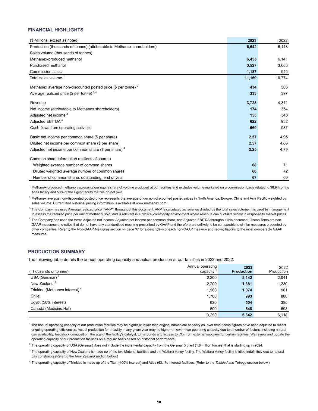 FINANCIAL HIGHLIGHTS Production (thousands of tonnes) (attributable to Methanex shareholders) 6,642 6,118 Sales volume (thousands of tonnes) Methanex-produced methanol 6,455 6,141 Purchased methanol 3,527 3,688 Commission sales 1,187 945 Total sales volume 1 11,169 10,774 Methanex average non-discounted posted price ($ per tonne) 2 434 503 Average realized price ($ per tonne) 3 4 333 397 Revenue 3,723 4,311 Net income (attributable to Methanex shareholders) 174 354 Adjusted net income 4 153 343 Adjusted EBITDA 4 622 932 Cash flows from operating activities 660 987 Basic net income per common share ($ per share) 2.57 4.95 Diluted net income per common share ($ per share) 2.57 4.86 Adjusted net income per common share ($ per share) 4 2.25 4.79 Common share information (millions of shares) Weighted average number of common shares 68 71 Diluted weighted average number of common shares 68 72 Number of common shares outstanding, end of year 67 69 ($ Millions, except as noted) 2023 2022 1 Methanex-produced methanol represents our equity share of volume produced at our facilities and excludes volume marketed on a commission basis related to 36.9% of the Atlas facility and 50% of the Egypt facility that we do not own. 2 Methanex average non-discounted posted price represents the average of our non-discounted posted prices in North America, Europe, China and Asia Pacific weighted by sales volume. Current and historical pricing information is available at www.methanex.com. 3 The Company has used Average realized price ("ARP") throughout this document. ARP is calculated as revenue divided by the total sales volume. It is used by management to assess the realized price per unit of methanol sold, and is relevant in a cyclical commodity environment where revenue can fluctuate widely in response to market prices. 4 The Company has used the terms Adjusted net income, Adjusted net income per common share, and Adjusted EBITDA throughout this document. These items are non- GAAP measures and ratios that do not have any standardized meaning prescribed by GAAP and therefore are unlikely to be comparable to similar measures presented by other companies. Refer to the Non-GAAP Measures section on page 37 for a description of each non-GAAP measure and reconciliations to the most comparable GAAP measures. PRODUCTION SUMMARY The following table details the annual operating capacity and actual production at our facilities in 2023 and 2022: USA (Geismar) 2 2,200 2,142 2,041 New Zealand 3 2,200 1,381 1,230 Trinidad (Methanex interest) 4 1,960 1,074 981 Chile 1,700 993 888 Egypt (50% interest) 630 504 385 Canada (Medicine Hat) 600 548 593 9,290 6,642 6,118 (Thousands of tonnes) Annual operating capacity 1 2023 Production 2022 Production 1 The annual operating capacity of our production facilities may be higher or lower than original nameplate capacity as, over time, these figures have been adjusted to reflect ongoing operating efficiencies. Actual production for a facility in any given year may be higher or lower than operating capacity due to a number of factors, including natural gas availability, feedstock composition, the age of the facility's catalyst, turnarounds and access to CO2 from external suppliers for certain facilities. We review and update the operating capacity of our production facilities on a regular basis based on historical performance. 2 The operating capacity of USA (Geismar) does not include the incremental capacity from the Geismar 3 plant (1.8 million tonnes) that is starting up in 2024. 3 The operating capacity of New Zealand is made up of the two Motunui facilities and the Waitara Valley facility. The Waitara Valley facility is idled indefinitely due to natural gas constraints.(Refer to the New Zealand section below.) 4 The operating capacity of Trinidad is made up of the Titan (100% interest) and Atlas (63.1% interest) facilities. (Refer to the Trinidad and Tobago section below.) 10