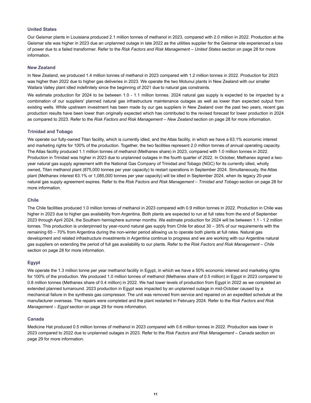 United States Our Geismar plants in Louisiana produced 2.1 million tonnes of methanol in 2023, compared with 2.0 million in 2022. Production at the Geismar site was higher in 2023 due an unplanned outage in late 2022 as the utilities supplier for the Geismar site experienced a loss of power due to a failed transformer. Refer to the Risk Factors and Risk Management – United States section on page 28 for more information. New Zealand In New Zealand, we produced 1.4 million tonnes of methanol in 2023 compared with 1.2 million tonnes in 2022. Production for 2023 was higher than 2022 due to higher gas deliveries in 2023. We operate the two Motunui plants in New Zealand with our smaller Waitara Valley plant idled indefinitely since the beginning of 2021 due to natural gas constraints. We estimate production for 2024 to be between 1.0 - 1.1 million tonnes. 2024 natural gas supply is expected to be impacted by a combination of our suppliers' planned natural gas infrastructure maintenance outages as well as lower than expected output from existing wells. While upstream investment has been made by our gas suppliers in New Zealand over the past two years, recent gas production results have been lower than originally expected which has contributed to the revised forecast for lower production in 2024 as compared to 2023. Refer to the Risk Factors and Risk Management – New Zealand section on page 28 for more information. Trinidad and Tobago We operate our fully-owned Titan facility, which is currently idled, and the Atlas facility, in which we have a 63.1% economic interest and marketing rights for 100% of the production. Together, the two facilities represent 2.0 million tonnes of annual operating capacity. The Atlas facility produced 1.1 million tonnes of methanol (Methanex share) in 2023, compared with 1.0 million tonnes in 2022. Production in Trinidad was higher in 2023 due to unplanned outages in the fourth quarter of 2022. In October, Methanex signed a two- year natural gas supply agreement with the National Gas Company of Trinidad and Tobago (NGC) for its currently idled, wholly owned, Titan methanol plant (875,000 tonnes per year capacity) to restart operations in September 2024. Simultaneously, the Atlas plant (Methanex interest 63.1% or 1,085,000 tonnes per year capacity) will be idled in September 2024, when its legacy 20-year natural gas supply agreement expires. Refer to the Risk Factors and Risk Management – Trinidad and Tobago section on page 28 for more information. Chile The Chile facilities produced 1.0 million tonnes of methanol in 2023 compared with 0.9 million tonnes in 2022. Production in Chile was higher in 2023 due to higher gas availability from Argentina. Both plants are expected to run at full rates from the end of September 2023 through April 2024, the Southern hemisphere summer months. We estimate production for 2024 will be between 1.1 - 1.2 million tonnes. This production is underpinned by year-round natural gas supply from Chile for about 30 – 35% of our requirements with the remaining 65 – 70% from Argentina during the non-winter period allowing us to operate both plants at full rates. Natural gas development and related infrastructure investments in Argentina continue to progress and we are working with our Argentine natural gas suppliers on extending the period of full gas availability to our plants. Refer to the Risk Factors and Risk Management – Chile section on page 28 for more information. Egypt We operate the 1.3 million tonne per year methanol facility in Egypt, in which we have a 50% economic interest and marketing rights for 100% of the production. We produced 1.0 million tonnes of methanol (Methanex share of 0.5 million) in Egypt in 2023 compared to 0.8 million tonnes (Methanex share of 0.4 million) in 2022. We had lower levels of production from Egypt in 2022 as we completed an extended planned turnaround. 2023 production in Egypt was impacted by an unplanned outage in mid-October caused by a mechanical failure in the synthesis gas compressor. The unit was removed from service and repaired on an expedited schedule at the manufacturer overseas. The repairs were completed and the plant restarted in February 2024. Refer to the Risk Factors and Risk Management – Egypt section on page 29 for more information. Canada Medicine Hat produced 0.5 million tonnes of methanol in 2023 compared with 0.6 million tonnes in 2022. Production was lower in 2023 compared to 2022 due to unplanned outages in 2023. Refer to the Risk Factors and Risk Management – Canada section on page 29 for more information. 11