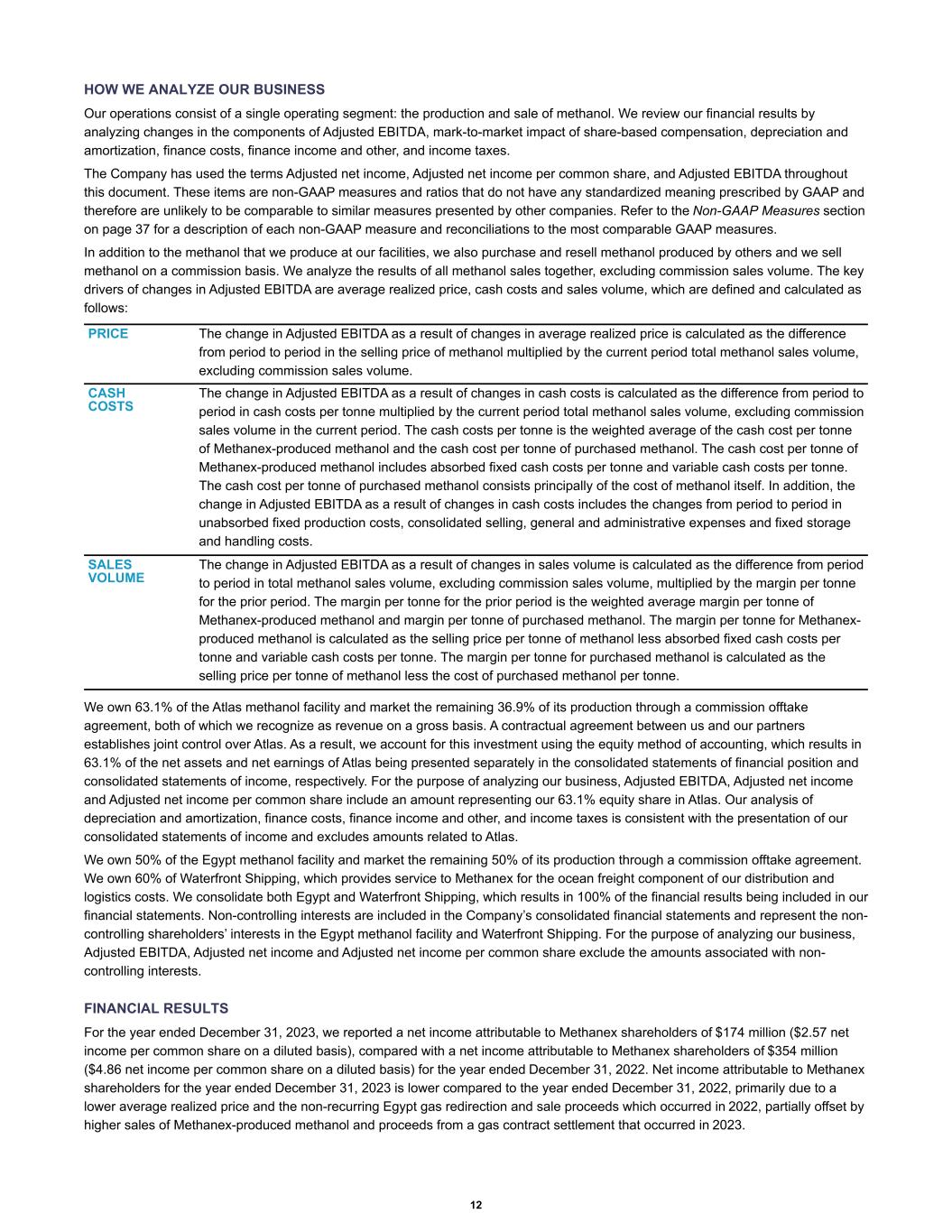 HOW WE ANALYZE OUR BUSINESS Our operations consist of a single operating segment: the production and sale of methanol. We review our financial results by analyzing changes in the components of Adjusted EBITDA, mark-to-market impact of share-based compensation, depreciation and amortization, finance costs, finance income and other, and income taxes. The Company has used the terms Adjusted net income, Adjusted net income per common share, and Adjusted EBITDA throughout this document. These items are non-GAAP measures and ratios that do not have any standardized meaning prescribed by GAAP and therefore are unlikely to be comparable to similar measures presented by other companies. Refer to the Non-GAAP Measures section on page 37 for a description of each non-GAAP measure and reconciliations to the most comparable GAAP measures. In addition to the methanol that we produce at our facilities, we also purchase and resell methanol produced by others and we sell methanol on a commission basis. We analyze the results of all methanol sales together, excluding commission sales volume. The key drivers of changes in Adjusted EBITDA are average realized price, cash costs and sales volume, which are defined and calculated as follows: PRICE The change in Adjusted EBITDA as a result of changes in average realized price is calculated as the difference from period to period in the selling price of methanol multiplied by the current period total methanol sales volume, excluding commission sales volume. CASH COSTS The change in Adjusted EBITDA as a result of changes in cash costs is calculated as the difference from period to period in cash costs per tonne multiplied by the current period total methanol sales volume, excluding commission sales volume in the current period. The cash costs per tonne is the weighted average of the cash cost per tonne of Methanex-produced methanol and the cash cost per tonne of purchased methanol. The cash cost per tonne of Methanex-produced methanol includes absorbed fixed cash costs per tonne and variable cash costs per tonne. The cash cost per tonne of purchased methanol consists principally of the cost of methanol itself. In addition, the change in Adjusted EBITDA as a result of changes in cash costs includes the changes from period to period in unabsorbed fixed production costs, consolidated selling, general and administrative expenses and fixed storage and handling costs. SALES VOLUME The change in Adjusted EBITDA as a result of changes in sales volume is calculated as the difference from period to period in total methanol sales volume, excluding commission sales volume, multiplied by the margin per tonne for the prior period. The margin per tonne for the prior period is the weighted average margin per tonne of Methanex-produced methanol and margin per tonne of purchased methanol. The margin per tonne for Methanex- produced methanol is calculated as the selling price per tonne of methanol less absorbed fixed cash costs per tonne and variable cash costs per tonne. The margin per tonne for purchased methanol is calculated as the selling price per tonne of methanol less the cost of purchased methanol per tonne. We own 63.1% of the Atlas methanol facility and market the remaining 36.9% of its production through a commission offtake agreement, both of which we recognize as revenue on a gross basis. A contractual agreement between us and our partners establishes joint control over Atlas. As a result, we account for this investment using the equity method of accounting, which results in 63.1% of the net assets and net earnings of Atlas being presented separately in the consolidated statements of financial position and consolidated statements of income, respectively. For the purpose of analyzing our business, Adjusted EBITDA, Adjusted net income and Adjusted net income per common share include an amount representing our 63.1% equity share in Atlas. Our analysis of depreciation and amortization, finance costs, finance income and other, and income taxes is consistent with the presentation of our consolidated statements of income and excludes amounts related to Atlas. We own 50% of the Egypt methanol facility and market the remaining 50% of its production through a commission offtake agreement. We own 60% of Waterfront Shipping, which provides service to Methanex for the ocean freight component of our distribution and logistics costs. We consolidate both Egypt and Waterfront Shipping, which results in 100% of the financial results being included in our financial statements. Non-controlling interests are included in the Company’s consolidated financial statements and represent the non- controlling shareholders’ interests in the Egypt methanol facility and Waterfront Shipping. For the purpose of analyzing our business, Adjusted EBITDA, Adjusted net income and Adjusted net income per common share exclude the amounts associated with non- controlling interests. FINANCIAL RESULTS For the year ended December 31, 2023, we reported a net income attributable to Methanex shareholders of $174 million ($2.57 net income per common share on a diluted basis), compared with a net income attributable to Methanex shareholders of $354 million ($4.86 net income per common share on a diluted basis) for the year ended December 31, 2022. Net income attributable to Methanex shareholders for the year ended December 31, 2023 is lower compared to the year ended December 31, 2022, primarily due to a lower average realized price and the non-recurring Egypt gas redirection and sale proceeds which occurred in 2022, partially offset by higher sales of Methanex-produced methanol and proceeds from a gas contract settlement that occurred in 2023. 12