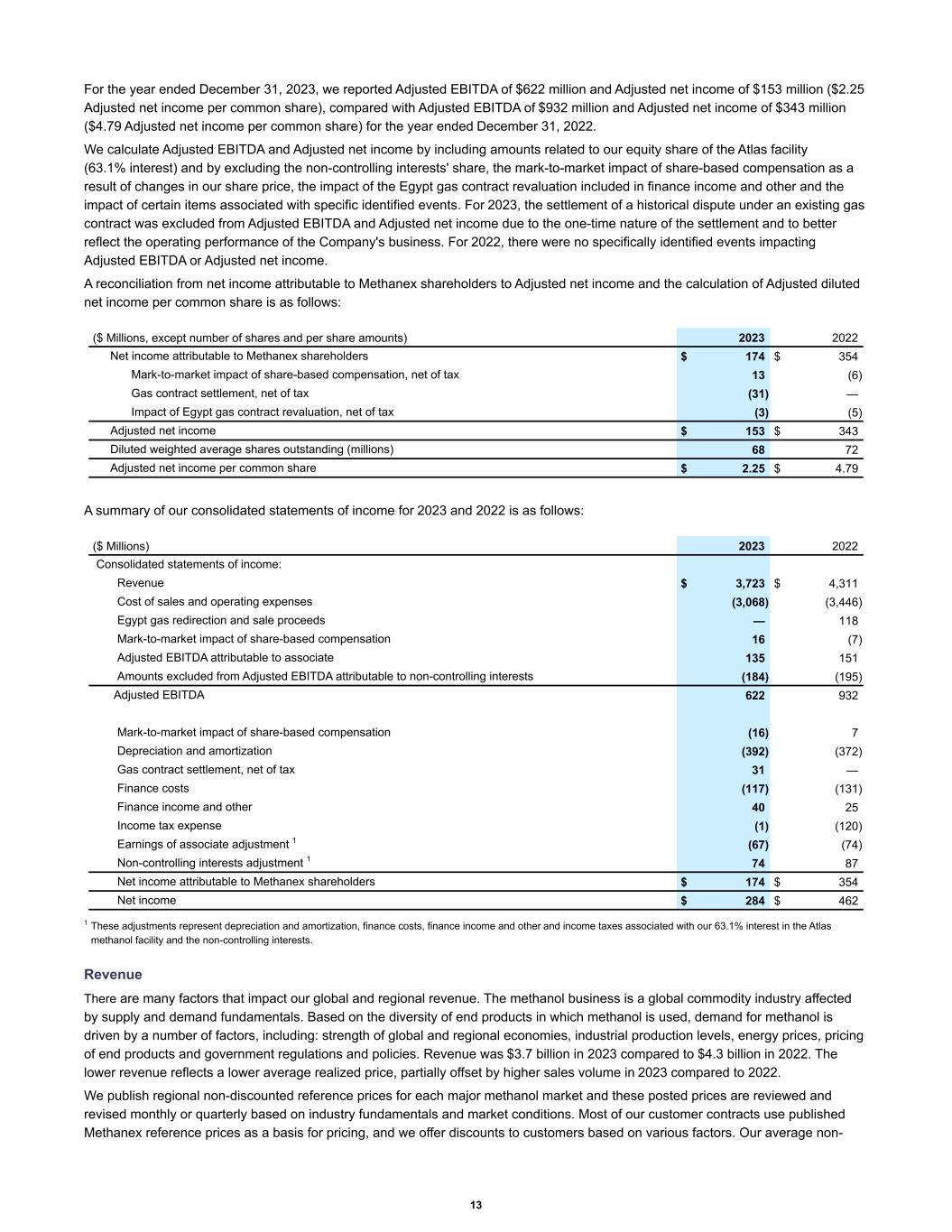 For the year ended December 31, 2023, we reported Adjusted EBITDA of $622 million and Adjusted net income of $153 million ($2.25 Adjusted net income per common share), compared with Adjusted EBITDA of $932 million and Adjusted net income of $343 million ($4.79 Adjusted net income per common share) for the year ended December 31, 2022. We calculate Adjusted EBITDA and Adjusted net income by including amounts related to our equity share of the Atlas facility (63.1% interest) and by excluding the non-controlling interests' share, the mark-to-market impact of share-based compensation as a result of changes in our share price, the impact of the Egypt gas contract revaluation included in finance income and other and the impact of certain items associated with specific identified events. For 2023, the settlement of a historical dispute under an existing gas contract was excluded from Adjusted EBITDA and Adjusted net income due to the one-time nature of the settlement and to better reflect the operating performance of the Company's business. For 2022, there were no specifically identified events impacting Adjusted EBITDA or Adjusted net income. A reconciliation from net income attributable to Methanex shareholders to Adjusted net income and the calculation of Adjusted diluted net income per common share is as follows: Net income attributable to Methanex shareholders $ 174 $ 354 Mark-to-market impact of share-based compensation, net of tax 13 (6) Gas contract settlement, net of tax (31) — Impact of Egypt gas contract revaluation, net of tax (3) (5) Adjusted net income $ 153 $ 343 Diluted weighted average shares outstanding (millions) 68 72 Adjusted net income per common share $ 2.25 $ 4.79 ($ Millions, except number of shares and per share amounts) 2023 2022 A summary of our consolidated statements of income for 2023 and 2022 is as follows: Consolidated statements of income: Revenue $ 3,723 $ 4,311 Cost of sales and operating expenses (3,068) (3,446) Egypt gas redirection and sale proceeds — 118 Mark-to-market impact of share-based compensation 16 (7) Adjusted EBITDA attributable to associate 135 151 Amounts excluded from Adjusted EBITDA attributable to non-controlling interests (184) (195) Adjusted EBITDA 622 932 Mark-to-market impact of share-based compensation (16) 7 Depreciation and amortization (392) (372) Gas contract settlement, net of tax 31 — Finance costs (117) (131) Finance income and other 40 25 Income tax expense (1) (120) Earnings of associate adjustment 1 (67) (74) Non-controlling interests adjustment 1 74 87 Net income attributable to Methanex shareholders $ 174 $ 354 Net income $ 284 $ 462 ($ Millions) 2023 2022 1 These adjustments represent depreciation and amortization, finance costs, finance income and other and income taxes associated with our 63.1% interest in the Atlas methanol facility and the non-controlling interests. Revenue There are many factors that impact our global and regional revenue. The methanol business is a global commodity industry affected by supply and demand fundamentals. Based on the diversity of end products in which methanol is used, demand for methanol is driven by a number of factors, including: strength of global and regional economies, industrial production levels, energy prices, pricing of end products and government regulations and policies. Revenue was $3.7 billion in 2023 compared to $4.3 billion in 2022. The lower revenue reflects a lower average realized price, partially offset by higher sales volume in 2023 compared to 2022. We publish regional non-discounted reference prices for each major methanol market and these posted prices are reviewed and revised monthly or quarterly based on industry fundamentals and market conditions. Most of our customer contracts use published Methanex reference prices as a basis for pricing, and we offer discounts to customers based on various factors. Our average non- 13