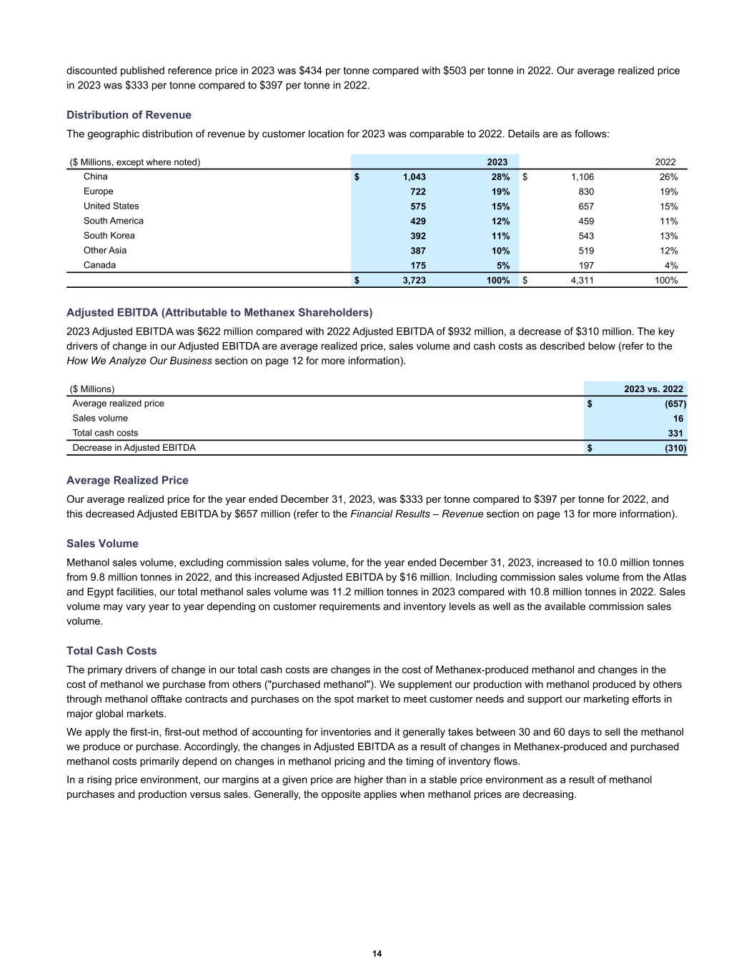 discounted published reference price in 2023 was $434 per tonne compared with $503 per tonne in 2022. Our average realized price in 2023 was $333 per tonne compared to $397 per tonne in 2022. Distribution of Revenue The geographic distribution of revenue by customer location for 2023 was comparable to 2022. Details are as follows: China $ 1,043 28 % $ 1,106 26 % Europe 722 19 % 830 19 % United States 575 15 % 657 15 % South America 429 12 % 459 11 % South Korea 392 11 % 543 13 % Other Asia 387 10 % 519 12 % Canada 175 5 % 197 4 % $ 3,723 100 % $ 4,311 100 % ($ Millions, except where noted) 2023 2022 Adjusted EBITDA (Attributable to Methanex Shareholders) 2023 Adjusted EBITDA was $622 million compared with 2022 Adjusted EBITDA of $932 million, a decrease of $310 million. The key drivers of change in our Adjusted EBITDA are average realized price, sales volume and cash costs as described below (refer to the How We Analyze Our Business section on page 12 for more information). Average realized price $ (657) Sales volume 16 Total cash costs 331 Decrease in Adjusted EBITDA $ (310) ($ Millions) 2023 vs. 2022 Average Realized Price Our average realized price for the year ended December 31, 2023, was $333 per tonne compared to $397 per tonne for 2022, and this decreased Adjusted EBITDA by $657 million (refer to the Financial Results – Revenue section on page 13 for more information). Sales Volume Methanol sales volume, excluding commission sales volume, for the year ended December 31, 2023, increased to 10.0 million tonnes from 9.8 million tonnes in 2022, and this increased Adjusted EBITDA by $16 million. Including commission sales volume from the Atlas and Egypt facilities, our total methanol sales volume was 11.2 million tonnes in 2023 compared with 10.8 million tonnes in 2022. Sales volume may vary year to year depending on customer requirements and inventory levels as well as the available commission sales volume. Total Cash Costs The primary drivers of change in our total cash costs are changes in the cost of Methanex-produced methanol and changes in the cost of methanol we purchase from others ("purchased methanol"). We supplement our production with methanol produced by others through methanol offtake contracts and purchases on the spot market to meet customer needs and support our marketing efforts in major global markets. We apply the first-in, first-out method of accounting for inventories and it generally takes between 30 and 60 days to sell the methanol we produce or purchase. Accordingly, the changes in Adjusted EBITDA as a result of changes in Methanex-produced and purchased methanol costs primarily depend on changes in methanol pricing and the timing of inventory flows. In a rising price environment, our margins at a given price are higher than in a stable price environment as a result of methanol purchases and production versus sales. Generally, the opposite applies when methanol prices are decreasing. 14