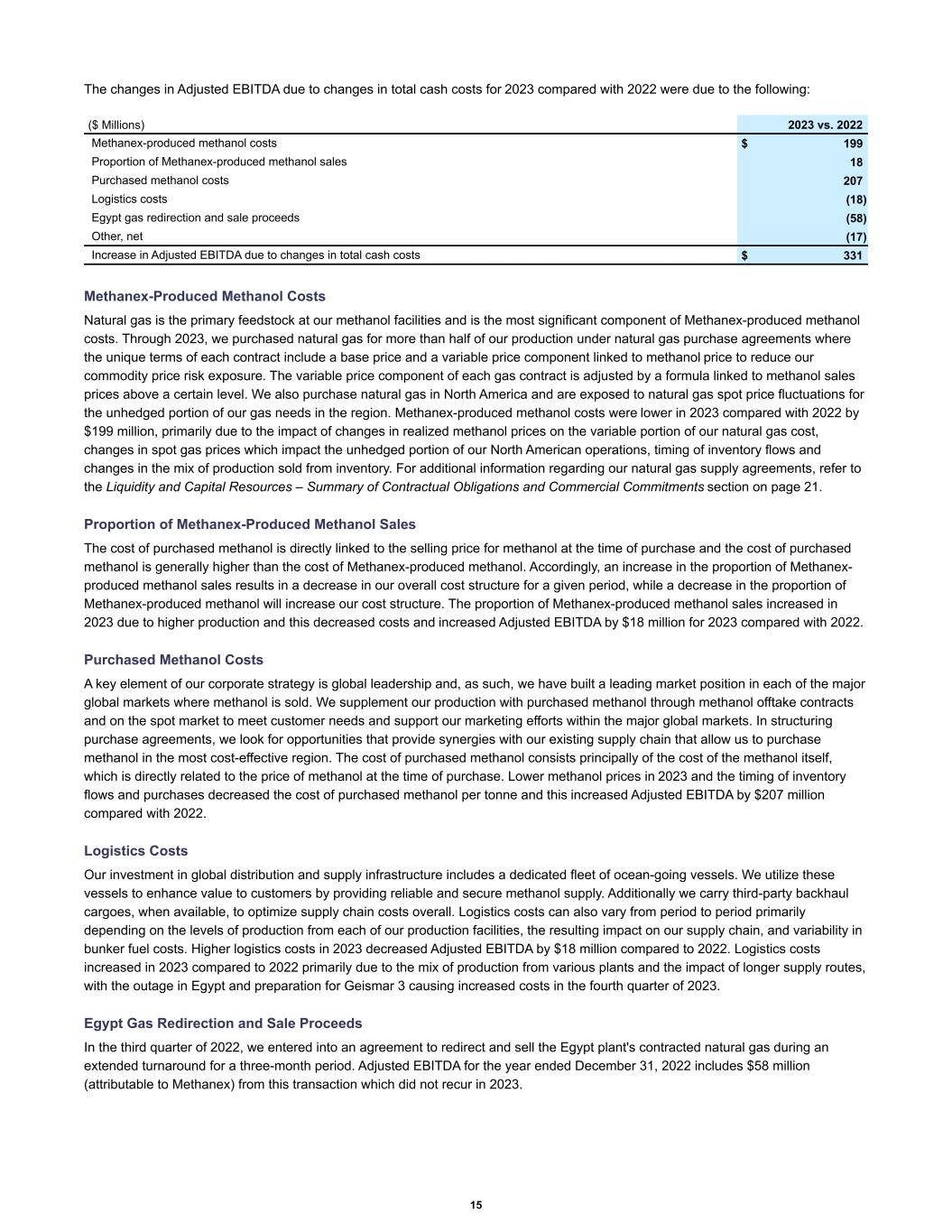 The changes in Adjusted EBITDA due to changes in total cash costs for 2023 compared with 2022 were due to the following: Methanex-produced methanol costs $ 199 Proportion of Methanex-produced methanol sales 18 Purchased methanol costs 207 Logistics costs (18) Egypt gas redirection and sale proceeds (58) Other, net (17) Increase in Adjusted EBITDA due to changes in total cash costs $ 331 ($ Millions) 2023 vs. 2022 Methanex-Produced Methanol Costs Natural gas is the primary feedstock at our methanol facilities and is the most significant component of Methanex-produced methanol costs. Through 2023, we purchased natural gas for more than half of our production under natural gas purchase agreements where the unique terms of each contract include a base price and a variable price component linked to methanol price to reduce our commodity price risk exposure. The variable price component of each gas contract is adjusted by a formula linked to methanol sales prices above a certain level. We also purchase natural gas in North America and are exposed to natural gas spot price fluctuations for the unhedged portion of our gas needs in the region. Methanex-produced methanol costs were lower in 2023 compared with 2022 by $199 million, primarily due to the impact of changes in realized methanol prices on the variable portion of our natural gas cost, changes in spot gas prices which impact the unhedged portion of our North American operations, timing of inventory flows and changes in the mix of production sold from inventory. For additional information regarding our natural gas supply agreements, refer to the Liquidity and Capital Resources – Summary of Contractual Obligations and Commercial Commitments section on page 21. Proportion of Methanex-Produced Methanol Sales The cost of purchased methanol is directly linked to the selling price for methanol at the time of purchase and the cost of purchased methanol is generally higher than the cost of Methanex-produced methanol. Accordingly, an increase in the proportion of Methanex- produced methanol sales results in a decrease in our overall cost structure for a given period, while a decrease in the proportion of Methanex-produced methanol will increase our cost structure. The proportion of Methanex-produced methanol sales increased in 2023 due to higher production and this decreased costs and increased Adjusted EBITDA by $18 million for 2023 compared with 2022. Purchased Methanol Costs A key element of our corporate strategy is global leadership and, as such, we have built a leading market position in each of the major global markets where methanol is sold. We supplement our production with purchased methanol through methanol offtake contracts and on the spot market to meet customer needs and support our marketing efforts within the major global markets. In structuring purchase agreements, we look for opportunities that provide synergies with our existing supply chain that allow us to purchase methanol in the most cost-effective region. The cost of purchased methanol consists principally of the cost of the methanol itself, which is directly related to the price of methanol at the time of purchase. Lower methanol prices in 2023 and the timing of inventory flows and purchases decreased the cost of purchased methanol per tonne and this increased Adjusted EBITDA by $207 million compared with 2022. Logistics Costs Our investment in global distribution and supply infrastructure includes a dedicated fleet of ocean-going vessels. We utilize these vessels to enhance value to customers by providing reliable and secure methanol supply. Additionally we carry third-party backhaul cargoes, when available, to optimize supply chain costs overall. Logistics costs can also vary from period to period primarily depending on the levels of production from each of our production facilities, the resulting impact on our supply chain, and variability in bunker fuel costs. Higher logistics costs in 2023 decreased Adjusted EBITDA by $18 million compared to 2022. Logistics costs increased in 2023 compared to 2022 primarily due to the mix of production from various plants and the impact of longer supply routes, with the outage in Egypt and preparation for Geismar 3 causing increased costs in the fourth quarter of 2023. Egypt Gas Redirection and Sale Proceeds In the third quarter of 2022, we entered into an agreement to redirect and sell the Egypt plant's contracted natural gas during an extended turnaround for a three-month period. Adjusted EBITDA for the year ended December 31, 2022 includes $58 million (attributable to Methanex) from this transaction which did not recur in 2023. 15
