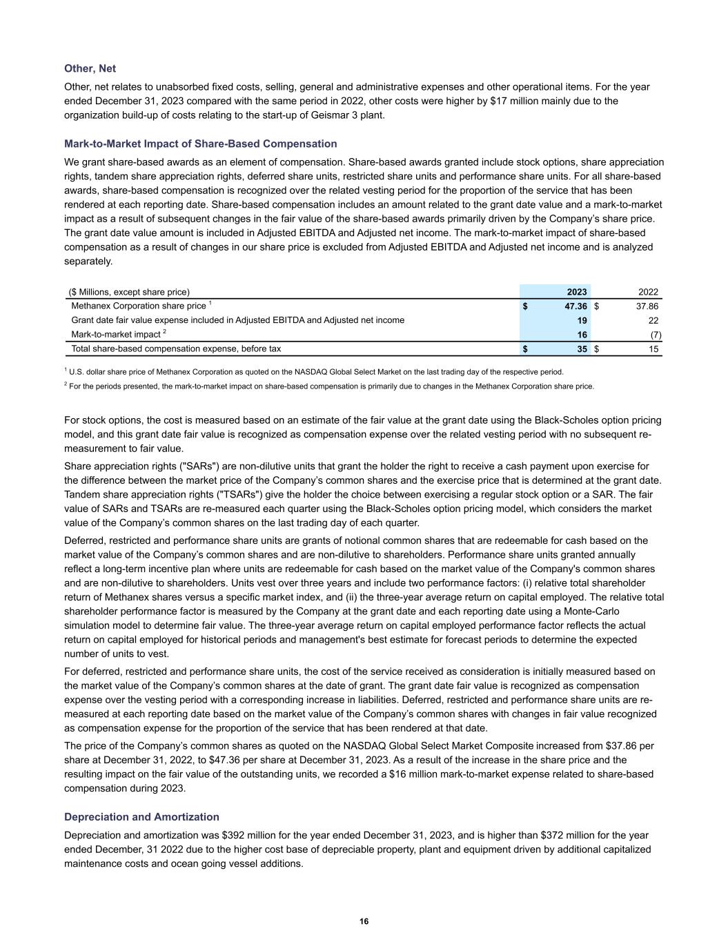 Other, Net Other, net relates to unabsorbed fixed costs, selling, general and administrative expenses and other operational items. For the year ended December 31, 2023 compared with the same period in 2022, other costs were higher by $17 million mainly due to the organization build-up of costs relating to the start-up of Geismar 3 plant. Mark-to-Market Impact of Share-Based Compensation We grant share-based awards as an element of compensation. Share-based awards granted include stock options, share appreciation rights, tandem share appreciation rights, deferred share units, restricted share units and performance share units. For all share-based awards, share-based compensation is recognized over the related vesting period for the proportion of the service that has been rendered at each reporting date. Share-based compensation includes an amount related to the grant date value and a mark-to-market impact as a result of subsequent changes in the fair value of the share-based awards primarily driven by the Company’s share price. The grant date value amount is included in Adjusted EBITDA and Adjusted net income. The mark-to-market impact of share-based compensation as a result of changes in our share price is excluded from Adjusted EBITDA and Adjusted net income and is analyzed separately. Methanex Corporation share price 1 $ 47.36 $ 37.86 Grant date fair value expense included in Adjusted EBITDA and Adjusted net income 19 22 Mark-to-market impact 2 16 (7) Total share-based compensation expense, before tax $ 35 $ 15 ($ Millions, except share price) 2023 2022 1 U.S. dollar share price of Methanex Corporation as quoted on the NASDAQ Global Select Market on the last trading day of the respective period. 2 For the periods presented, the mark-to-market impact on share-based compensation is primarily due to changes in the Methanex Corporation share price. For stock options, the cost is measured based on an estimate of the fair value at the grant date using the Black-Scholes option pricing model, and this grant date fair value is recognized as compensation expense over the related vesting period with no subsequent re- measurement to fair value. Share appreciation rights ("SARs") are non-dilutive units that grant the holder the right to receive a cash payment upon exercise for the difference between the market price of the Company’s common shares and the exercise price that is determined at the grant date. Tandem share appreciation rights ("TSARs") give the holder the choice between exercising a regular stock option or a SAR. The fair value of SARs and TSARs are re-measured each quarter using the Black-Scholes option pricing model, which considers the market value of the Company’s common shares on the last trading day of each quarter. Deferred, restricted and performance share units are grants of notional common shares that are redeemable for cash based on the market value of the Company’s common shares and are non-dilutive to shareholders. Performance share units granted annually reflect a long-term incentive plan where units are redeemable for cash based on the market value of the Company's common shares and are non-dilutive to shareholders. Units vest over three years and include two performance factors: (i) relative total shareholder return of Methanex shares versus a specific market index, and (ii) the three-year average return on capital employed. The relative total shareholder performance factor is measured by the Company at the grant date and each reporting date using a Monte-Carlo simulation model to determine fair value. The three-year average return on capital employed performance factor reflects the actual return on capital employed for historical periods and management's best estimate for forecast periods to determine the expected number of units to vest. For deferred, restricted and performance share units, the cost of the service received as consideration is initially measured based on the market value of the Company’s common shares at the date of grant. The grant date fair value is recognized as compensation expense over the vesting period with a corresponding increase in liabilities. Deferred, restricted and performance share units are re- measured at each reporting date based on the market value of the Company’s common shares with changes in fair value recognized as compensation expense for the proportion of the service that has been rendered at that date. The price of the Company’s common shares as quoted on the NASDAQ Global Select Market Composite increased from $37.86 per share at December 31, 2022, to $47.36 per share at December 31, 2023. As a result of the increase in the share price and the resulting impact on the fair value of the outstanding units, we recorded a $16 million mark-to-market expense related to share-based compensation during 2023. Depreciation and Amortization Depreciation and amortization was $392 million for the year ended December 31, 2023, and is higher than $372 million for the year ended December, 31 2022 due to the higher cost base of depreciable property, plant and equipment driven by additional capitalized maintenance costs and ocean going vessel additions. 16