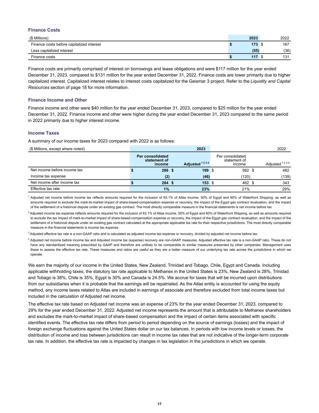Finance Costs Finance costs before capitalized interest $ 173 $ 167 Less capitalized interest (55) (36) Finance costs $ 117 $ 131 ($ Millions) 2023 2022 Finance costs are primarily comprised of interest on borrowings and lease obligations and were $117 million for the year ended December 31, 2023, compared to $131 million for the year ended December 31, 2022. Finance costs are lower primarily due to higher capitalized interest. Capitalized interest relates to interest costs capitalized for the Geismar 3 project. Refer to the Liquidity and Capital Resources section of page 18 for more information. Finance Income and Other Finance income and other were $40 million for the year ended December 31, 2023, compared to $25 million for the year ended December 31, 2022. Finance income and other were higher during the year ended December 31, 2023 compared to the same period in 2022 primarily due to higher interest income. Income Taxes A summary of our income taxes for 2023 compared with 2022 is as follows: Per consolidated statement of income Adjusted 1 2 3 4 Per consolidated statement of income Adjusted 1 2 3 4 Net income before income tax $ 286 $ 199 $ 582 $ 482 Income tax expense (2) (46) (120) (139) Net income after income tax $ 284 $ 153 $ 462 $ 343 Effective tax rate 1 % 23 % 21 % 29 % ($ Millions, except where noted) 2023 2022 1 Adjusted net income before income tax reflects amounts required for the inclusion of 63.1% of Atlas income, 50% of Egypt and 60% of Waterfront Shipping, as well as amounts required to exclude the mark-to-market impact of share-based-compensation expense or recovery, the impact of the Egypt gas contract revaluation, and the impact of the settlement of a historical dispute under an existing gas contract. The most directly comparable measure in the financial statements is net income before tax. 2 Adjusted income tax expense reflects amounts required for the inclusion of 63.1% of Atlas income, 50% of Egypt and 60% of Waterfront Shipping, as well as amounts required to exclude the tax impact of mark-to-market impact of share-based-compensation expense or recovery, the impact of the Egypt gas contract revaluation, and the impact of the settlement of a historical dispute under an existing gas contract calculated at the appropriate applicable tax rate for their respective jurisdictions. The most directly comparable measure in the financial statements is income tax expense. 3 Adjusted effective tax rate is a non-GAAP ratio and is calculated as adjusted income tax expense or recovery, divided by adjusted net income before tax. 4 Adjusted net income before income tax and Adjusted income tax (expense) recovery are non-GAAP measures. Adjusted effective tax rate is a non-GAAP ratio. These do not have any standardized meaning prescribed by GAAP and therefore are unlikely to be comparable to similar measures presented by other companies. Management uses these to assess the effective tax rate. These measures and ratios are useful as they are a better measure of our underlying tax rate across the jurisdictions in which we operate. We earn the majority of our income in the United States, New Zealand, Trinidad and Tobago, Chile, Egypt and Canada. Including applicable withholding taxes, the statutory tax rate applicable to Methanex in the United States is 23%, New Zealand is 28%, Trinidad and Tobago is 38%, Chile is 35%, Egypt is 30% and Canada is 24.5%. We accrue for taxes that will be incurred upon distributions from our subsidiaries when it is probable that the earnings will be repatriated. As the Atlas entity is accounted for using the equity method, any income taxes related to Atlas are included in earnings of associate and therefore excluded from total income taxes but included in the calculation of Adjusted net income. The effective tax rate based on Adjusted net income was an expense of 23% for the year ended December 31, 2023, compared to 29% for the year ended December 31, 2022. Adjusted net income represents the amount that is attributable to Methanex shareholders and excludes the mark-to-market impact of share-based compensation and the impact of certain items associated with specific identified events. The effective tax rate differs from period to period depending on the source of earnings (losses) and the impact of foreign exchange fluctuations against the United States dollar on our tax balances. In periods with low income levels or losses, the distribution of income and loss between jurisdictions can result in income tax rates that are not indicative of the longer-term corporate tax rate. In addition, the effective tax rate is impacted by changes in tax legislation in the jurisdictions in which we operate. 17