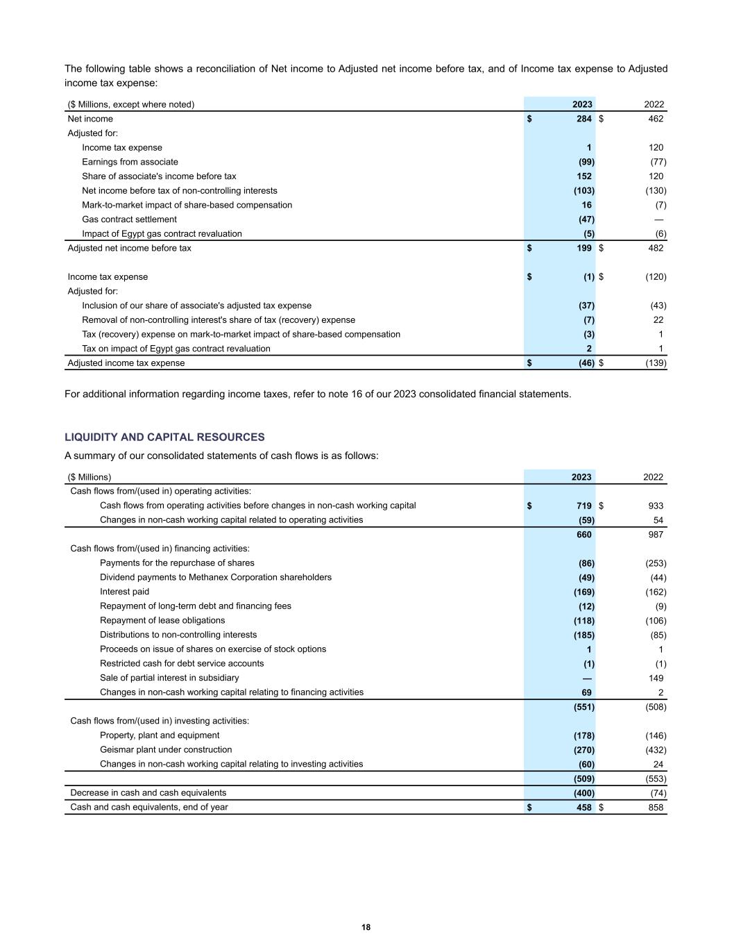 The following table shows a reconciliation of Net income to Adjusted net income before tax, and of Income tax expense to Adjusted income tax expense: Net income $ 284 $ 462 Adjusted for: Income tax expense 1 120 Earnings from associate (99) (77) Share of associate's income before tax 152 120 Net income before tax of non-controlling interests (103) (130) Mark-to-market impact of share-based compensation 16 (7) Gas contract settlement (47) — Impact of Egypt gas contract revaluation (5) (6) Adjusted net income before tax $ 199 $ 482 Income tax expense $ (1) $ (120) Adjusted for: Inclusion of our share of associate's adjusted tax expense (37) (43) Removal of non-controlling interest's share of tax (recovery) expense (7) 22 Tax (recovery) expense on mark-to-market impact of share-based compensation (3) 1 Tax on impact of Egypt gas contract revaluation 2 1 Adjusted income tax expense $ (46) $ (139) ($ Millions, except where noted) 2023 2022 For additional information regarding income taxes, refer to note 16 of our 2023 consolidated financial statements. LIQUIDITY AND CAPITAL RESOURCES A summary of our consolidated statements of cash flows is as follows: Cash flows from/(used in) operating activities: Cash flows from operating activities before changes in non-cash working capital $ 719 $ 933 Changes in non-cash working capital related to operating activities (59) 54 660 987 Cash flows from/(used in) financing activities: Payments for the repurchase of shares (86) (253) Dividend payments to Methanex Corporation shareholders (49) (44) Interest paid (169) (162) Repayment of long-term debt and financing fees (12) (9) Repayment of lease obligations (118) (106) Distributions to non-controlling interests (185) (85) Proceeds on issue of shares on exercise of stock options 1 1 Restricted cash for debt service accounts (1) (1) Sale of partial interest in subsidiary — 149 Changes in non-cash working capital relating to financing activities 69 2 (551) (508) Cash flows from/(used in) investing activities: Property, plant and equipment (178) (146) Geismar plant under construction (270) (432) Changes in non-cash working capital relating to investing activities (60) 24 (509) (553) Decrease in cash and cash equivalents (400) (74) Cash and cash equivalents, end of year $ 458 $ 858 ($ Millions) 2023 2022 18