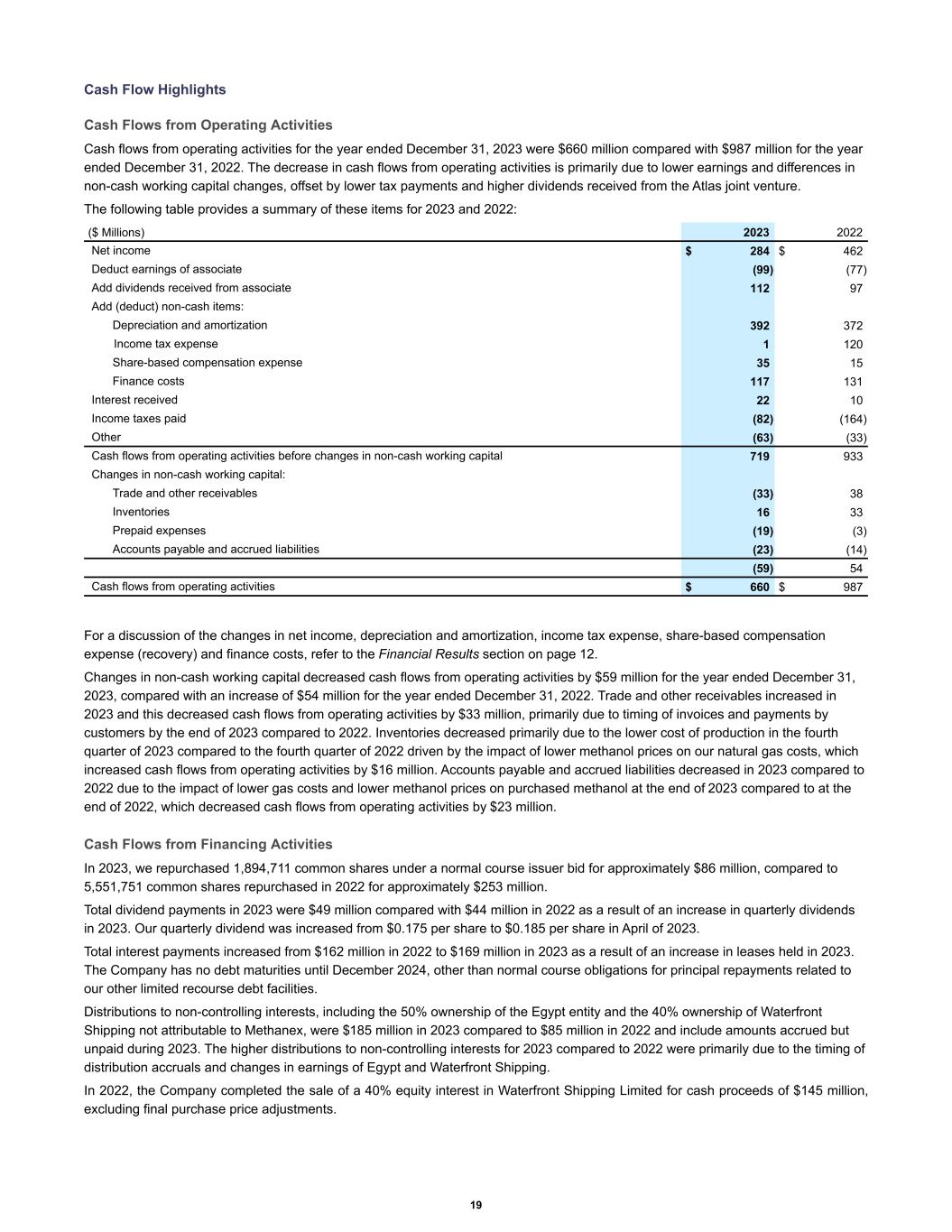 Cash Flow Highlights Cash Flows from Operating Activities Cash flows from operating activities for the year ended December 31, 2023 were $660 million compared with $987 million for the year ended December 31, 2022. The decrease in cash flows from operating activities is primarily due to lower earnings and differences in non-cash working capital changes, offset by lower tax payments and higher dividends received from the Atlas joint venture. The following table provides a summary of these items for 2023 and 2022: Net income $ 284 $ 462 Deduct earnings of associate (99) (77) Add dividends received from associate 112 97 Add (deduct) non-cash items: Depreciation and amortization 392 372 Income tax expense 1 120 Share-based compensation expense 35 15 Finance costs 117 131 Interest received 22 10 Income taxes paid (82) (164) Other (63) (33) Cash flows from operating activities before changes in non-cash working capital 719 933 Changes in non-cash working capital: Trade and other receivables (33) 38 Inventories 16 33 Prepaid expenses (19) (3) Accounts payable and accrued liabilities (23) (14) (59) 54 Cash flows from operating activities $ 660 $ 987 ($ Millions) 2023 2022 For a discussion of the changes in net income, depreciation and amortization, income tax expense, share-based compensation expense (recovery) and finance costs, refer to the Financial Results section on page 12. Changes in non-cash working capital decreased cash flows from operating activities by $59 million for the year ended December 31, 2023, compared with an increase of $54 million for the year ended December 31, 2022. Trade and other receivables increased in 2023 and this decreased cash flows from operating activities by $33 million, primarily due to timing of invoices and payments by customers by the end of 2023 compared to 2022. Inventories decreased primarily due to the lower cost of production in the fourth quarter of 2023 compared to the fourth quarter of 2022 driven by the impact of lower methanol prices on our natural gas costs, which increased cash flows from operating activities by $16 million. Accounts payable and accrued liabilities decreased in 2023 compared to 2022 due to the impact of lower gas costs and lower methanol prices on purchased methanol at the end of 2023 compared to at the end of 2022, which decreased cash flows from operating activities by $23 million. Cash Flows from Financing Activities In 2023, we repurchased 1,894,711 common shares under a normal course issuer bid for approximately $86 million, compared to 5,551,751 common shares repurchased in 2022 for approximately $253 million. Total dividend payments in 2023 were $49 million compared with $44 million in 2022 as a result of an increase in quarterly dividends in 2023. Our quarterly dividend was increased from $0.175 per share to $0.185 per share in April of 2023. Total interest payments increased from $162 million in 2022 to $169 million in 2023 as a result of an increase in leases held in 2023. The Company has no debt maturities until December 2024, other than normal course obligations for principal repayments related to our other limited recourse debt facilities. Distributions to non-controlling interests, including the 50% ownership of the Egypt entity and the 40% ownership of Waterfront Shipping not attributable to Methanex, were $185 million in 2023 compared to $85 million in 2022 and include amounts accrued but unpaid during 2023. The higher distributions to non-controlling interests for 2023 compared to 2022 were primarily due to the timing of distribution accruals and changes in earnings of Egypt and Waterfront Shipping. In 2022, the Company completed the sale of a 40% equity interest in Waterfront Shipping Limited for cash proceeds of $145 million, excluding final purchase price adjustments. 19