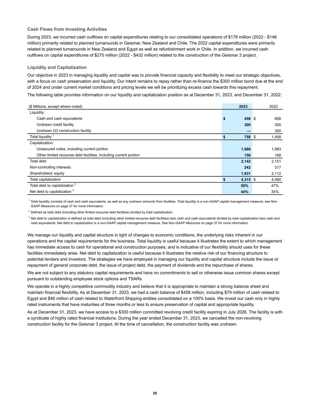 Cash Flows from Investing Activities During 2023, we incurred cash outflows on capital expenditures relating to our consolidated operations of $178 million (2022 - $146 million) primarily related to planned turnarounds in Geismar, New Zealand and Chile. The 2022 capital expenditures were primarily related to planned turnarounds in New Zealand and Egypt as well as refurbishment work in Chile. In addition, we incurred cash outflows on capital expenditures of $270 million (2022 - $432 million) related to the construction of the Geismar 3 project. Liquidity and Capitalization Our objective in 2023 in managing liquidity and capital was to provide financial capacity and flexibility to meet our strategic objectives, with a focus on cash preservation and liquidity. Our intent remains to repay rather than re-finance the $300 million bond due at the end of 2024 and under current market conditions and pricing levels we will be prioritizing excess cash towards this repayment. The following table provides information on our liquidity and capitalization position as at December 31, 2023, and December 31, 2022: Liquidity: Cash and cash equivalents $ 458 $ 858 Undrawn credit facility 300 300 Undrawn G3 construction facility — 300 Total liquidity 1 $ 758 $ 1,458 Capitalization: Unsecured notes, including current portion 1,986 1,983 Other limited recourse debt facilities, including current portion 156 168 Total debt 2,142 2,151 Non-controlling interests 242 317 Shareholders’ equity 1,931 2,112 Total capitalization $ 4,315 $ 4,580 Total debt to capitalization 2 50 % 47 % Net debt to capitalization 3 44 % 35 % ($ Millions, except where noted) 2023 2022 1 Total liquidity consists of cash and cash equivalents, as well as any undrawn amounts from facilities. Total liquidity is a non-GAAP capital management measure, see Non- GAAP Measures on page 37 for more information. 2 Defined as total debt (including other limited recourse debt facilities) divided by total capitalization. 3 Net debt to capitalization is defined as total debt (including other limited recourse debt facilities) less cash and cash equivalents divided by total capitalization less cash and cash equivalents. Net debt to capitalization is a non-GAAP capital management measure. See Non-GAAP Measures on page 37 for more information. We manage our liquidity and capital structure in light of changes to economic conditions, the underlying risks inherent in our operations and the capital requirements for the business. Total liquidity is useful because it illustrates the extent to which management has immediate access to cash for operational and construction purposes, and is indicative of our flexibility should uses for these facilities immediately arise. Net debt to capitalization is useful because it illustrates the relative risk of our financing structure to potential lenders and investors. The strategies we have employed in managing our liquidity and capital structure include the issue or repayment of general corporate debt, the issue of project debt, the payment of dividends and the repurchase of shares. We are not subject to any statutory capital requirements and have no commitments to sell or otherwise issue common shares except pursuant to outstanding employee stock options and TSARs. We operate in a highly competitive commodity industry and believe that it is appropriate to maintain a strong balance sheet and maintain financial flexibility. As at December 31, 2023, we had a cash balance of $458 million, including $79 million of cash related to Egypt and $46 million of cash related to Waterfront Shipping entities consolidated on a 100% basis. We invest our cash only in highly rated instruments that have maturities of three months or less to ensure preservation of capital and appropriate liquidity. As at December 31, 2023, we have access to a $300 million committed revolving credit facility expiring in July 2026. The facility is with a syndicate of highly rated financial institutions. During the year ended December 31, 2023, we cancelled the non-revolving construction facility for the Geismar 3 project. At the time of cancellation, the construction facility was undrawn. 20