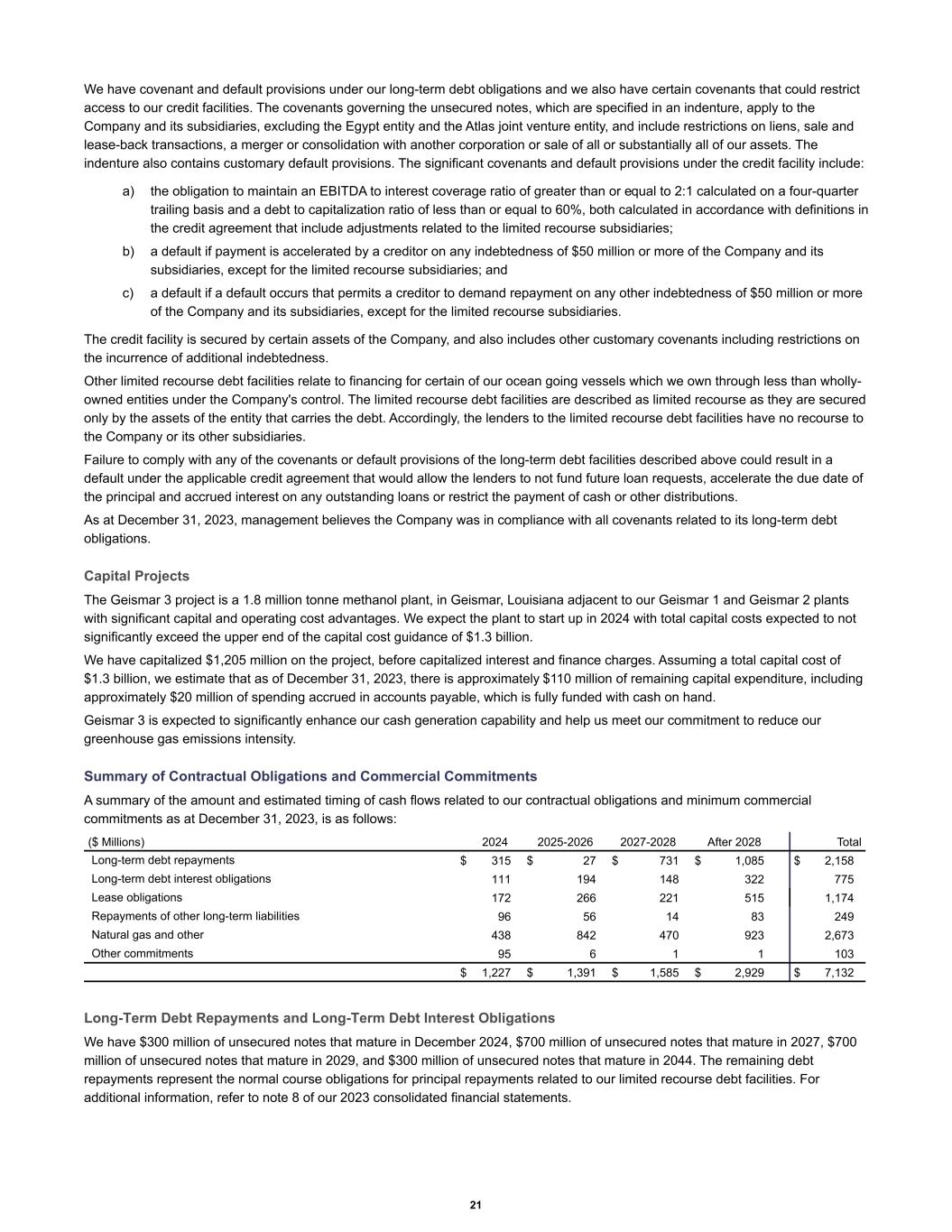 We have covenant and default provisions under our long-term debt obligations and we also have certain covenants that could restrict access to our credit facilities. The covenants governing the unsecured notes, which are specified in an indenture, apply to the Company and its subsidiaries, excluding the Egypt entity and the Atlas joint venture entity, and include restrictions on liens, sale and lease-back transactions, a merger or consolidation with another corporation or sale of all or substantially all of our assets. The indenture also contains customary default provisions. The significant covenants and default provisions under the credit facility include: a) the obligation to maintain an EBITDA to interest coverage ratio of greater than or equal to 2:1 calculated on a four-quarter trailing basis and a debt to capitalization ratio of less than or equal to 60%, both calculated in accordance with definitions in the credit agreement that include adjustments related to the limited recourse subsidiaries; b) a default if payment is accelerated by a creditor on any indebtedness of $50 million or more of the Company and its subsidiaries, except for the limited recourse subsidiaries; and c) a default if a default occurs that permits a creditor to demand repayment on any other indebtedness of $50 million or more of the Company and its subsidiaries, except for the limited recourse subsidiaries. The credit facility is secured by certain assets of the Company, and also includes other customary covenants including restrictions on the incurrence of additional indebtedness. Other limited recourse debt facilities relate to financing for certain of our ocean going vessels which we own through less than wholly- owned entities under the Company's control. The limited recourse debt facilities are described as limited recourse as they are secured only by the assets of the entity that carries the debt. Accordingly, the lenders to the limited recourse debt facilities have no recourse to the Company or its other subsidiaries. Failure to comply with any of the covenants or default provisions of the long-term debt facilities described above could result in a default under the applicable credit agreement that would allow the lenders to not fund future loan requests, accelerate the due date of the principal and accrued interest on any outstanding loans or restrict the payment of cash or other distributions. As at December 31, 2023, management believes the Company was in compliance with all covenants related to its long-term debt obligations. Capital Projects The Geismar 3 project is a 1.8 million tonne methanol plant, in Geismar, Louisiana adjacent to our Geismar 1 and Geismar 2 plants with significant capital and operating cost advantages. We expect the plant to start up in 2024 with total capital costs expected to not significantly exceed the upper end of the capital cost guidance of $1.3 billion. We have capitalized $1,205 million on the project, before capitalized interest and finance charges. Assuming a total capital cost of $1.3 billion, we estimate that as of December 31, 2023, there is approximately $110 million of remaining capital expenditure, including approximately $20 million of spending accrued in accounts payable, which is fully funded with cash on hand. Geismar 3 is expected to significantly enhance our cash generation capability and help us meet our commitment to reduce our greenhouse gas emissions intensity. Summary of Contractual Obligations and Commercial Commitments A summary of the amount and estimated timing of cash flows related to our contractual obligations and minimum commercial commitments as at December 31, 2023, is as follows: Long-term debt repayments $ 315 $ 27 $ 731 $ 1,085 $ 2,158 Long-term debt interest obligations 111 194 148 322 775 Lease obligations 172 266 221 515 1,174 Repayments of other long-term liabilities 96 56 14 83 249 Natural gas and other 438 842 470 923 2,673 Other commitments 95 6 1 1 103 $ 1,227 $ 1,391 $ 1,585 $ 2,929 $ 7,132 ($ Millions) 2024 2025-2026 2027-2028 After 2028 Total Long-Term Debt Repayments and Long-Term Debt Interest Obligations We have $300 million of unsecured notes that mature in December 2024, $700 million of unsecured notes that mature in 2027, $700 million of unsecured notes that mature in 2029, and $300 million of unsecured notes that mature in 2044. The remaining debt repayments represent the normal course obligations for principal repayments related to our limited recourse debt facilities. For additional information, refer to note 8 of our 2023 consolidated financial statements. 21