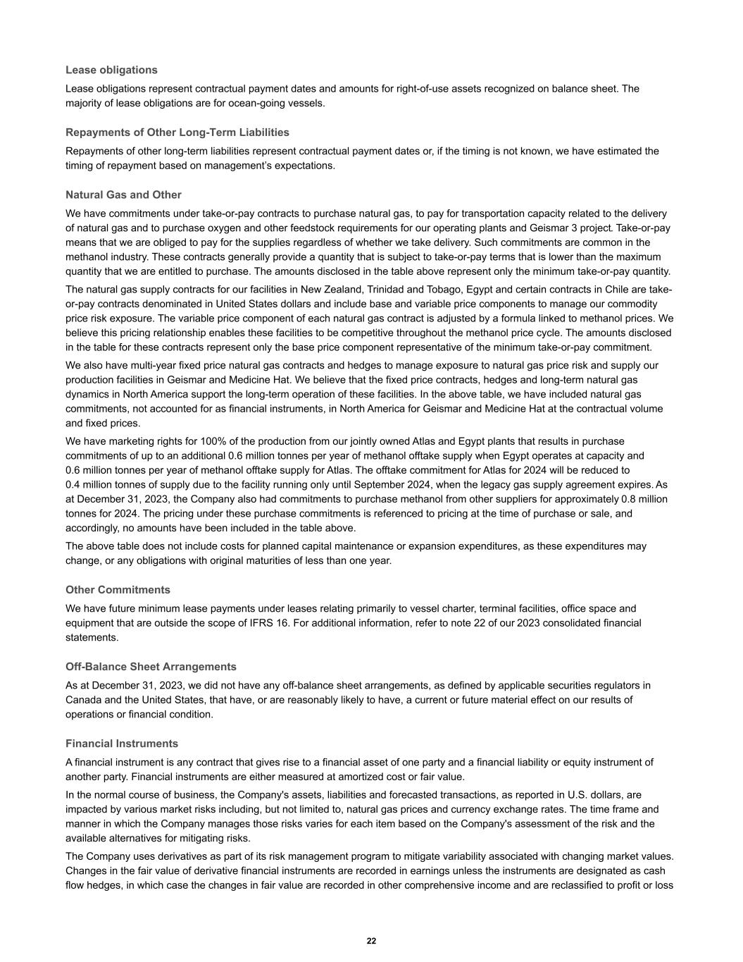 Lease obligations Lease obligations represent contractual payment dates and amounts for right-of-use assets recognized on balance sheet. The majority of lease obligations are for ocean-going vessels. Repayments of Other Long-Term Liabilities Repayments of other long-term liabilities represent contractual payment dates or, if the timing is not known, we have estimated the timing of repayment based on management’s expectations. Natural Gas and Other We have commitments under take-or-pay contracts to purchase natural gas, to pay for transportation capacity related to the delivery of natural gas and to purchase oxygen and other feedstock requirements for our operating plants and Geismar 3 project. Take-or-pay means that we are obliged to pay for the supplies regardless of whether we take delivery. Such commitments are common in the methanol industry. These contracts generally provide a quantity that is subject to take-or-pay terms that is lower than the maximum quantity that we are entitled to purchase. The amounts disclosed in the table above represent only the minimum take-or-pay quantity. The natural gas supply contracts for our facilities in New Zealand, Trinidad and Tobago, Egypt and certain contracts in Chile are take- or-pay contracts denominated in United States dollars and include base and variable price components to manage our commodity price risk exposure. The variable price component of each natural gas contract is adjusted by a formula linked to methanol prices. We believe this pricing relationship enables these facilities to be competitive throughout the methanol price cycle. The amounts disclosed in the table for these contracts represent only the base price component representative of the minimum take-or-pay commitment. We also have multi-year fixed price natural gas contracts and hedges to manage exposure to natural gas price risk and supply our production facilities in Geismar and Medicine Hat. We believe that the fixed price contracts, hedges and long-term natural gas dynamics in North America support the long-term operation of these facilities. In the above table, we have included natural gas commitments, not accounted for as financial instruments, in North America for Geismar and Medicine Hat at the contractual volume and fixed prices. We have marketing rights for 100% of the production from our jointly owned Atlas and Egypt plants that results in purchase commitments of up to an additional 0.6 million tonnes per year of methanol offtake supply when Egypt operates at capacity and 0.6 million tonnes per year of methanol offtake supply for Atlas. The offtake commitment for Atlas for 2024 will be reduced to 0.4 million tonnes of supply due to the facility running only until September 2024, when the legacy gas supply agreement expires. As at December 31, 2023, the Company also had commitments to purchase methanol from other suppliers for approximately 0.8 million tonnes for 2024. The pricing under these purchase commitments is referenced to pricing at the time of purchase or sale, and accordingly, no amounts have been included in the table above. The above table does not include costs for planned capital maintenance or expansion expenditures, as these expenditures may change, or any obligations with original maturities of less than one year. Other Commitments We have future minimum lease payments under leases relating primarily to vessel charter, terminal facilities, office space and equipment that are outside the scope of IFRS 16. For additional information, refer to note 22 of our 2023 consolidated financial statements. Off-Balance Sheet Arrangements As at December 31, 2023, we did not have any off-balance sheet arrangements, as defined by applicable securities regulators in Canada and the United States, that have, or are reasonably likely to have, a current or future material effect on our results of operations or financial condition. Financial Instruments A financial instrument is any contract that gives rise to a financial asset of one party and a financial liability or equity instrument of another party. Financial instruments are either measured at amortized cost or fair value. In the normal course of business, the Company's assets, liabilities and forecasted transactions, as reported in U.S. dollars, are impacted by various market risks including, but not limited to, natural gas prices and currency exchange rates. The time frame and manner in which the Company manages those risks varies for each item based on the Company's assessment of the risk and the available alternatives for mitigating risks. The Company uses derivatives as part of its risk management program to mitigate variability associated with changing market values. Changes in the fair value of derivative financial instruments are recorded in earnings unless the instruments are designated as cash flow hedges, in which case the changes in fair value are recorded in other comprehensive income and are reclassified to profit or loss 22