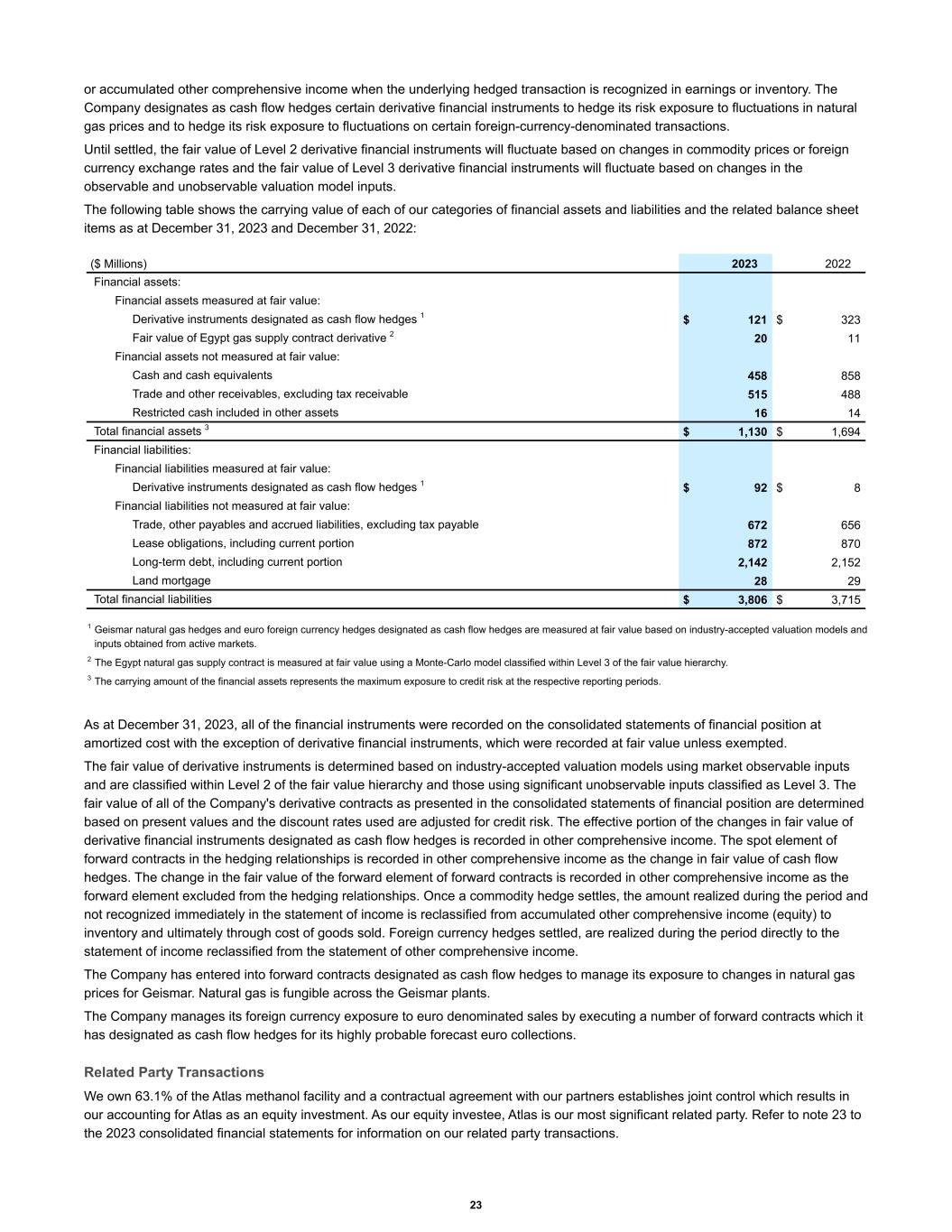 or accumulated other comprehensive income when the underlying hedged transaction is recognized in earnings or inventory. The Company designates as cash flow hedges certain derivative financial instruments to hedge its risk exposure to fluctuations in natural gas prices and to hedge its risk exposure to fluctuations on certain foreign-currency-denominated transactions. Until settled, the fair value of Level 2 derivative financial instruments will fluctuate based on changes in commodity prices or foreign currency exchange rates and the fair value of Level 3 derivative financial instruments will fluctuate based on changes in the observable and unobservable valuation model inputs. The following table shows the carrying value of each of our categories of financial assets and liabilities and the related balance sheet items as at December 31, 2023 and December 31, 2022: Financial assets: Financial assets measured at fair value: Derivative instruments designated as cash flow hedges 1 $ 121 $ 323 Fair value of Egypt gas supply contract derivative 2 20 11 Financial assets not measured at fair value: Cash and cash equivalents 458 858 Trade and other receivables, excluding tax receivable 515 488 Restricted cash included in other assets 16 14 Total financial assets 3 $ 1,130 $ 1,694 Financial liabilities: Financial liabilities measured at fair value: Derivative instruments designated as cash flow hedges 1 $ 92 $ 8 Financial liabilities not measured at fair value: Trade, other payables and accrued liabilities, excluding tax payable 672 656 Lease obligations, including current portion 872 870 Long-term debt, including current portion 2,142 2,152 Land mortgage 28 29 Total financial liabilities $ 3,806 $ 3,715 ($ Millions) 2023 2022 1 Geismar natural gas hedges and euro foreign currency hedges designated as cash flow hedges are measured at fair value based on industry-accepted valuation models and inputs obtained from active markets. 2 The Egypt natural gas supply contract is measured at fair value using a Monte-Carlo model classified within Level 3 of the fair value hierarchy. 3 The carrying amount of the financial assets represents the maximum exposure to credit risk at the respective reporting periods. As at December 31, 2023, all of the financial instruments were recorded on the consolidated statements of financial position at amortized cost with the exception of derivative financial instruments, which were recorded at fair value unless exempted. The fair value of derivative instruments is determined based on industry-accepted valuation models using market observable inputs and are classified within Level 2 of the fair value hierarchy and those using significant unobservable inputs classified as Level 3. The fair value of all of the Company's derivative contracts as presented in the consolidated statements of financial position are determined based on present values and the discount rates used are adjusted for credit risk. The effective portion of the changes in fair value of derivative financial instruments designated as cash flow hedges is recorded in other comprehensive income. The spot element of forward contracts in the hedging relationships is recorded in other comprehensive income as the change in fair value of cash flow hedges. The change in the fair value of the forward element of forward contracts is recorded in other comprehensive income as the forward element excluded from the hedging relationships. Once a commodity hedge settles, the amount realized during the period and not recognized immediately in the statement of income is reclassified from accumulated other comprehensive income (equity) to inventory and ultimately through cost of goods sold. Foreign currency hedges settled, are realized during the period directly to the statement of income reclassified from the statement of other comprehensive income. The Company has entered into forward contracts designated as cash flow hedges to manage its exposure to changes in natural gas prices for Geismar. Natural gas is fungible across the Geismar plants. The Company manages its foreign currency exposure to euro denominated sales by executing a number of forward contracts which it has designated as cash flow hedges for its highly probable forecast euro collections. Related Party Transactions We own 63.1% of the Atlas methanol facility and a contractual agreement with our partners establishes joint control which results in our accounting for Atlas as an equity investment. As our equity investee, Atlas is our most significant related party. Refer to note 23 to the 2023 consolidated financial statements for information on our related party transactions. 23