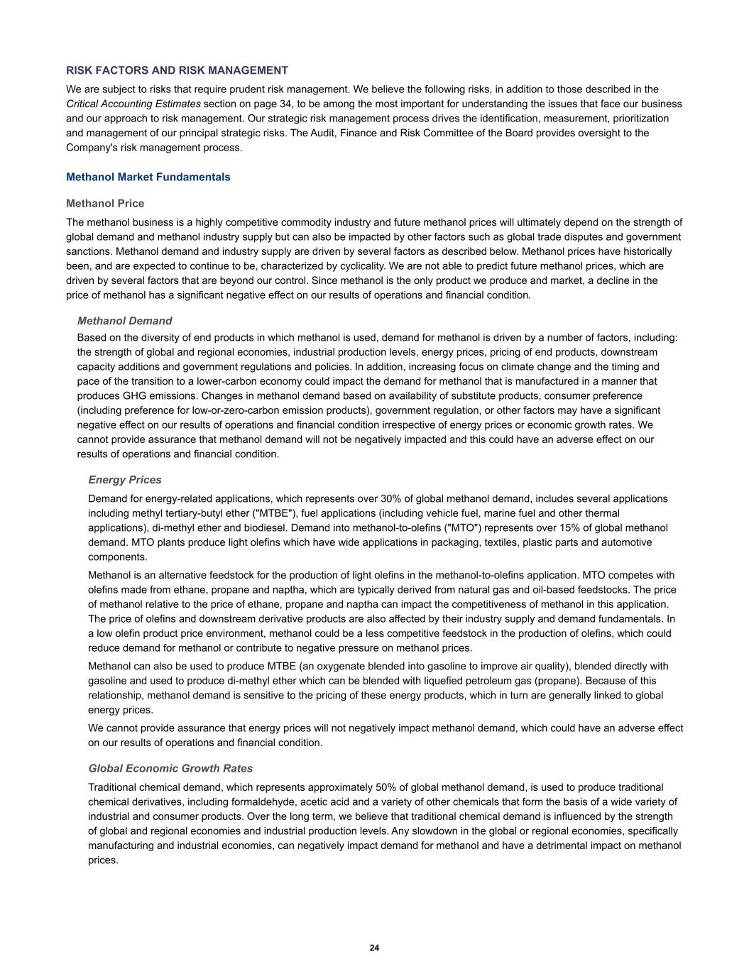 RISK FACTORS AND RISK MANAGEMENT We are subject to risks that require prudent risk management. We believe the following risks, in addition to those described in the Critical Accounting Estimates section on page 34, to be among the most important for understanding the issues that face our business and our approach to risk management. Our strategic risk management process drives the identification, measurement, prioritization and management of our principal strategic risks. The Audit, Finance and Risk Committee of the Board provides oversight to the Company's risk management process. Methanol Market Fundamentals Methanol Price The methanol business is a highly competitive commodity industry and future methanol prices will ultimately depend on the strength of global demand and methanol industry supply but can also be impacted by other factors such as global trade disputes and government sanctions. Methanol demand and industry supply are driven by several factors as described below. Methanol prices have historically been, and are expected to continue to be, characterized by cyclicality. We are not able to predict future methanol prices, which are driven by several factors that are beyond our control. Since methanol is the only product we produce and market, a decline in the price of methanol has a significant negative effect on our results of operations and financial condition. Methanol Demand Based on the diversity of end products in which methanol is used, demand for methanol is driven by a number of factors, including: the strength of global and regional economies, industrial production levels, energy prices, pricing of end products, downstream capacity additions and government regulations and policies. In addition, increasing focus on climate change and the timing and pace of the transition to a lower-carbon economy could impact the demand for methanol that is manufactured in a manner that produces GHG emissions. Changes in methanol demand based on availability of substitute products, consumer preference (including preference for low-or-zero-carbon emission products), government regulation, or other factors may have a significant negative effect on our results of operations and financial condition irrespective of energy prices or economic growth rates. We cannot provide assurance that methanol demand will not be negatively impacted and this could have an adverse effect on our results of operations and financial condition. Energy Prices Demand for energy-related applications, which represents over 30% of global methanol demand, includes several applications including methyl tertiary-butyl ether ("MTBE"), fuel applications (including vehicle fuel, marine fuel and other thermal applications), di-methyl ether and biodiesel. Demand into methanol-to-olefins ("MTO") represents over 15% of global methanol demand. MTO plants produce light olefins which have wide applications in packaging, textiles, plastic parts and automotive components. Methanol is an alternative feedstock for the production of light olefins in the methanol-to-olefins application. MTO competes with olefins made from ethane, propane and naptha, which are typically derived from natural gas and oil-based feedstocks. The price of methanol relative to the price of ethane, propane and naptha can impact the competitiveness of methanol in this application. The price of olefins and downstream derivative products are also affected by their industry supply and demand fundamentals. In a low olefin product price environment, methanol could be a less competitive feedstock in the production of olefins, which could reduce demand for methanol or contribute to negative pressure on methanol prices. Methanol can also be used to produce MTBE (an oxygenate blended into gasoline to improve air quality), blended directly with gasoline and used to produce di-methyl ether which can be blended with liquefied petroleum gas (propane). Because of this relationship, methanol demand is sensitive to the pricing of these energy products, which in turn are generally linked to global energy prices. We cannot provide assurance that energy prices will not negatively impact methanol demand, which could have an adverse effect on our results of operations and financial condition. Global Economic Growth Rates Traditional chemical demand, which represents approximately 50% of global methanol demand, is used to produce traditional chemical derivatives, including formaldehyde, acetic acid and a variety of other chemicals that form the basis of a wide variety of industrial and consumer products. Over the long term, we believe that traditional chemical demand is influenced by the strength of global and regional economies and industrial production levels. Any slowdown in the global or regional economies, specifically manufacturing and industrial economies, can negatively impact demand for methanol and have a detrimental impact on methanol prices. 24