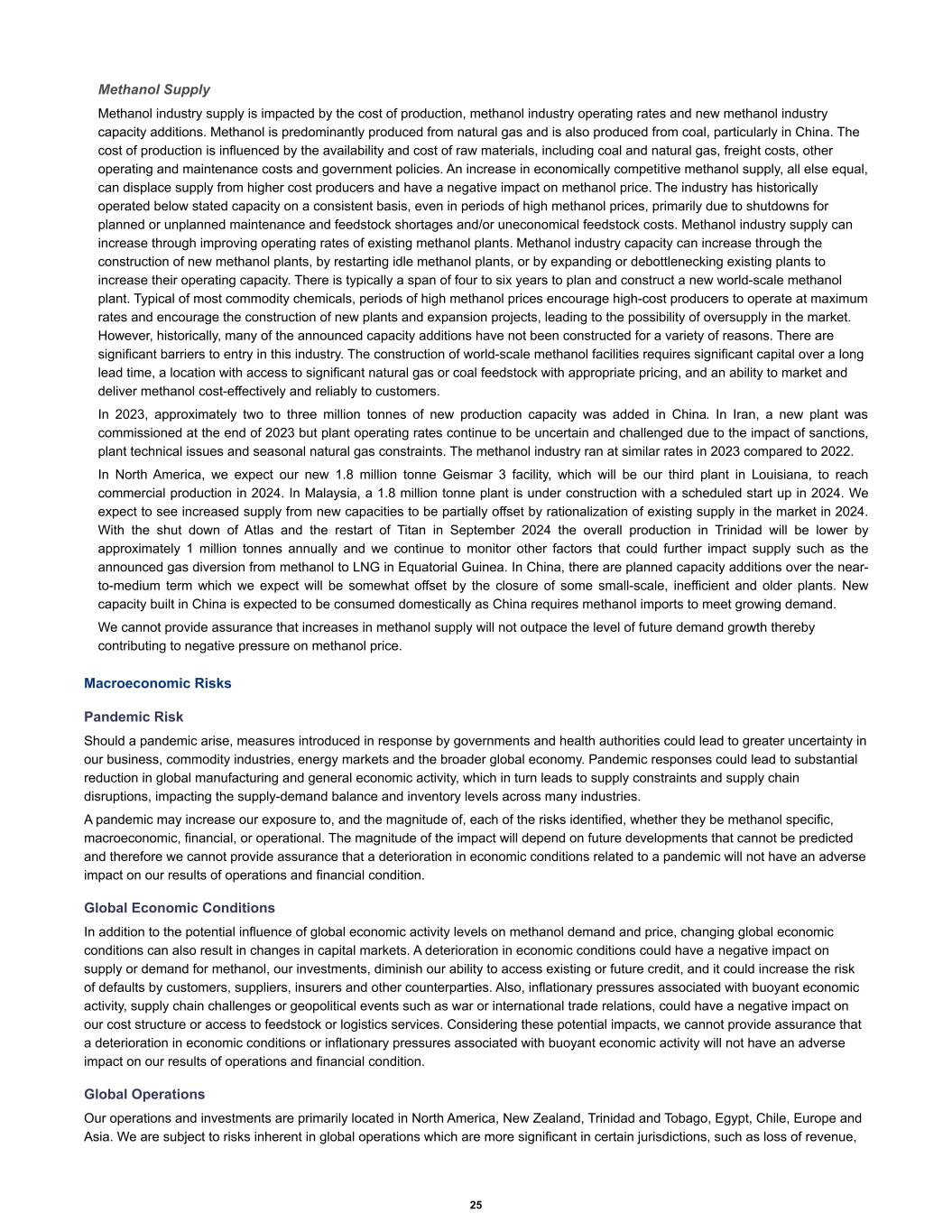 Methanol Supply Methanol industry supply is impacted by the cost of production, methanol industry operating rates and new methanol industry capacity additions. Methanol is predominantly produced from natural gas and is also produced from coal, particularly in China. The cost of production is influenced by the availability and cost of raw materials, including coal and natural gas, freight costs, other operating and maintenance costs and government policies. An increase in economically competitive methanol supply, all else equal, can displace supply from higher cost producers and have a negative impact on methanol price. The industry has historically operated below stated capacity on a consistent basis, even in periods of high methanol prices, primarily due to shutdowns for planned or unplanned maintenance and feedstock shortages and/or uneconomical feedstock costs. Methanol industry supply can increase through improving operating rates of existing methanol plants. Methanol industry capacity can increase through the construction of new methanol plants, by restarting idle methanol plants, or by expanding or debottlenecking existing plants to increase their operating capacity. There is typically a span of four to six years to plan and construct a new world-scale methanol plant. Typical of most commodity chemicals, periods of high methanol prices encourage high-cost producers to operate at maximum rates and encourage the construction of new plants and expansion projects, leading to the possibility of oversupply in the market. However, historically, many of the announced capacity additions have not been constructed for a variety of reasons. There are significant barriers to entry in this industry. The construction of world-scale methanol facilities requires significant capital over a long lead time, a location with access to significant natural gas or coal feedstock with appropriate pricing, and an ability to market and deliver methanol cost-effectively and reliably to customers. In 2023, approximately two to three million tonnes of new production capacity was added in China. In Iran, a new plant was commissioned at the end of 2023 but plant operating rates continue to be uncertain and challenged due to the impact of sanctions, plant technical issues and seasonal natural gas constraints. The methanol industry ran at similar rates in 2023 compared to 2022. In North America, we expect our new 1.8 million tonne Geismar 3 facility, which will be our third plant in Louisiana, to reach commercial production in 2024. In Malaysia, a 1.8 million tonne plant is under construction with a scheduled start up in 2024. We expect to see increased supply from new capacities to be partially offset by rationalization of existing supply in the market in 2024. With the shut down of Atlas and the restart of Titan in September 2024 the overall production in Trinidad will be lower by approximately 1 million tonnes annually and we continue to monitor other factors that could further impact supply such as the announced gas diversion from methanol to LNG in Equatorial Guinea. In China, there are planned capacity additions over the near- to-medium term which we expect will be somewhat offset by the closure of some small-scale, inefficient and older plants. New capacity built in China is expected to be consumed domestically as China requires methanol imports to meet growing demand. We cannot provide assurance that increases in methanol supply will not outpace the level of future demand growth thereby contributing to negative pressure on methanol price. Macroeconomic Risks Pandemic Risk Should a pandemic arise, measures introduced in response by governments and health authorities could lead to greater uncertainty in our business, commodity industries, energy markets and the broader global economy. Pandemic responses could lead to substantial reduction in global manufacturing and general economic activity, which in turn leads to supply constraints and supply chain disruptions, impacting the supply-demand balance and inventory levels across many industries. A pandemic may increase our exposure to, and the magnitude of, each of the risks identified, whether they be methanol specific, macroeconomic, financial, or operational. The magnitude of the impact will depend on future developments that cannot be predicted and therefore we cannot provide assurance that a deterioration in economic conditions related to a pandemic will not have an adverse impact on our results of operations and financial condition. Global Economic Conditions In addition to the potential influence of global economic activity levels on methanol demand and price, changing global economic conditions can also result in changes in capital markets. A deterioration in economic conditions could have a negative impact on supply or demand for methanol, our investments, diminish our ability to access existing or future credit, and it could increase the risk of defaults by customers, suppliers, insurers and other counterparties. Also, inflationary pressures associated with buoyant economic activity, supply chain challenges or geopolitical events such as war or international trade relations, could have a negative impact on our cost structure or access to feedstock or logistics services. Considering these potential impacts, we cannot provide assurance that a deterioration in economic conditions or inflationary pressures associated with buoyant economic activity will not have an adverse impact on our results of operations and financial condition. Global Operations Our operations and investments are primarily located in North America, New Zealand, Trinidad and Tobago, Egypt, Chile, Europe and Asia. We are subject to risks inherent in global operations which are more significant in certain jurisdictions, such as loss of revenue, 25