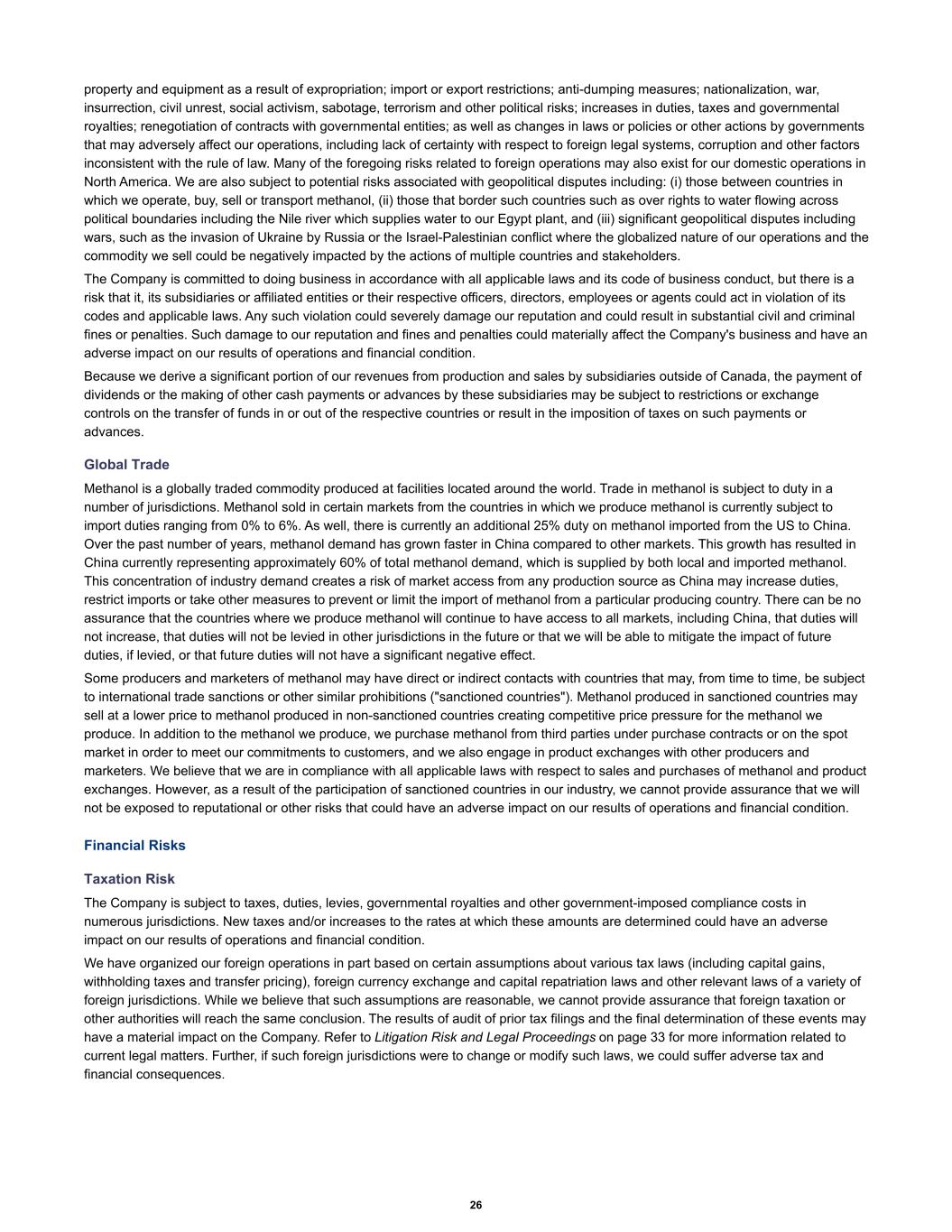 property and equipment as a result of expropriation; import or export restrictions; anti-dumping measures; nationalization, war, insurrection, civil unrest, social activism, sabotage, terrorism and other political risks; increases in duties, taxes and governmental royalties; renegotiation of contracts with governmental entities; as well as changes in laws or policies or other actions by governments that may adversely affect our operations, including lack of certainty with respect to foreign legal systems, corruption and other factors inconsistent with the rule of law. Many of the foregoing risks related to foreign operations may also exist for our domestic operations in North America. We are also subject to potential risks associated with geopolitical disputes including: (i) those between countries in which we operate, buy, sell or transport methanol, (ii) those that border such countries such as over rights to water flowing across political boundaries including the Nile river which supplies water to our Egypt plant, and (iii) significant geopolitical disputes including wars, such as the invasion of Ukraine by Russia or the Israel-Palestinian conflict where the globalized nature of our operations and the commodity we sell could be negatively impacted by the actions of multiple countries and stakeholders. The Company is committed to doing business in accordance with all applicable laws and its code of business conduct, but there is a risk that it, its subsidiaries or affiliated entities or their respective officers, directors, employees or agents could act in violation of its codes and applicable laws. Any such violation could severely damage our reputation and could result in substantial civil and criminal fines or penalties. Such damage to our reputation and fines and penalties could materially affect the Company's business and have an adverse impact on our results of operations and financial condition. Because we derive a significant portion of our revenues from production and sales by subsidiaries outside of Canada, the payment of dividends or the making of other cash payments or advances by these subsidiaries may be subject to restrictions or exchange controls on the transfer of funds in or out of the respective countries or result in the imposition of taxes on such payments or advances. Global Trade Methanol is a globally traded commodity produced at facilities located around the world. Trade in methanol is subject to duty in a number of jurisdictions. Methanol sold in certain markets from the countries in which we produce methanol is currently subject to import duties ranging from 0% to 6%. As well, there is currently an additional 25% duty on methanol imported from the US to China. Over the past number of years, methanol demand has grown faster in China compared to other markets. This growth has resulted in China currently representing approximately 60% of total methanol demand, which is supplied by both local and imported methanol. This concentration of industry demand creates a risk of market access from any production source as China may increase duties, restrict imports or take other measures to prevent or limit the import of methanol from a particular producing country. There can be no assurance that the countries where we produce methanol will continue to have access to all markets, including China, that duties will not increase, that duties will not be levied in other jurisdictions in the future or that we will be able to mitigate the impact of future duties, if levied, or that future duties will not have a significant negative effect. Some producers and marketers of methanol may have direct or indirect contacts with countries that may, from time to time, be subject to international trade sanctions or other similar prohibitions ("sanctioned countries"). Methanol produced in sanctioned countries may sell at a lower price to methanol produced in non-sanctioned countries creating competitive price pressure for the methanol we produce. In addition to the methanol we produce, we purchase methanol from third parties under purchase contracts or on the spot market in order to meet our commitments to customers, and we also engage in product exchanges with other producers and marketers. We believe that we are in compliance with all applicable laws with respect to sales and purchases of methanol and product exchanges. However, as a result of the participation of sanctioned countries in our industry, we cannot provide assurance that we will not be exposed to reputational or other risks that could have an adverse impact on our results of operations and financial condition. Financial Risks Taxation Risk The Company is subject to taxes, duties, levies, governmental royalties and other government-imposed compliance costs in numerous jurisdictions. New taxes and/or increases to the rates at which these amounts are determined could have an adverse impact on our results of operations and financial condition. We have organized our foreign operations in part based on certain assumptions about various tax laws (including capital gains, withholding taxes and transfer pricing), foreign currency exchange and capital repatriation laws and other relevant laws of a variety of foreign jurisdictions. While we believe that such assumptions are reasonable, we cannot provide assurance that foreign taxation or other authorities will reach the same conclusion. The results of audit of prior tax filings and the final determination of these events may have a material impact on the Company. Refer to Litigation Risk and Legal Proceedings on page 33 for more information related to current legal matters. Further, if such foreign jurisdictions were to change or modify such laws, we could suffer adverse tax and financial consequences. 26