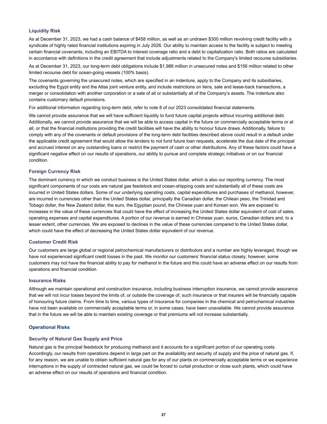Liquidity Risk As at December 31, 2023, we had a cash balance of $458 million, as well as an undrawn $300 million revolving credit facility with a syndicate of highly rated financial institutions expiring in July 2026. Our ability to maintain access to the facility is subject to meeting certain financial covenants, including an EBITDA to interest coverage ratio and a debt to capitalization ratio. Both ratios are calculated in accordance with definitions in the credit agreement that include adjustments related to the Company's limited recourse subsidiaries. As at December 31, 2023, our long-term debt obligations include $1,986 million in unsecured notes and $156 million related to other limited recourse debt for ocean-going vessels (100% basis). The covenants governing the unsecured notes, which are specified in an indenture, apply to the Company and its subsidiaries, excluding the Egypt entity and the Atlas joint venture entity, and include restrictions on liens, sale and lease-back transactions, a merger or consolidation with another corporation or a sale of all or substantially all of the Company’s assets. The indenture also contains customary default provisions. For additional information regarding long-term debt, refer to note 8 of our 2023 consolidated financial statements. We cannot provide assurance that we will have sufficient liquidity to fund future capital projects without incurring additional debt. Additionally, we cannot provide assurance that we will be able to access capital in the future on commercially acceptable terms or at all, or that the financial institutions providing the credit facilities will have the ability to honour future draws. Additionally, failure to comply with any of the covenants or default provisions of the long-term debt facilities described above could result in a default under the applicable credit agreement that would allow the lenders to not fund future loan requests, accelerate the due date of the principal and accrued interest on any outstanding loans or restrict the payment of cash or other distributions. Any of these factors could have a significant negative effect on our results of operations, our ability to pursue and complete strategic initiatives or on our financial condition. Foreign Currency Risk The dominant currency in which we conduct business is the United States dollar, which is also our reporting currency. The most significant components of our costs are natural gas feedstock and ocean-shipping costs and substantially all of these costs are incurred in United States dollars. Some of our underlying operating costs, capital expenditures and purchases of methanol, however, are incurred in currencies other than the United States dollar, principally the Canadian dollar, the Chilean peso, the Trinidad and Tobago dollar, the New Zealand dollar, the euro, the Egyptian pound, the Chinese yuan and Korean won. We are exposed to increases in the value of these currencies that could have the effect of increasing the United States dollar equivalent of cost of sales, operating expenses and capital expenditures. A portion of our revenue is earned in Chinese yuan, euros, Canadian dollars and, to a lesser extent, other currencies. We are exposed to declines in the value of these currencies compared to the United States dollar, which could have the effect of decreasing the United States dollar equivalent of our revenue. Customer Credit Risk Our customers are large global or regional petrochemical manufacturers or distributors and a number are highly leveraged, though we have not experienced significant credit losses in the past. We monitor our customers’ financial status closely; however, some customers may not have the financial ability to pay for methanol in the future and this could have an adverse effect on our results from operations and financial condition. Insurance Risks Although we maintain operational and construction insurance, including business interruption insurance, we cannot provide assurance that we will not incur losses beyond the limits of, or outside the coverage of, such insurance or that insurers will be financially capable of honouring future claims. From time to time, various types of insurance for companies in the chemical and petrochemical industries have not been available on commercially acceptable terms or, in some cases, have been unavailable. We cannot provide assurance that in the future we will be able to maintain existing coverage or that premiums will not increase substantially. Operational Risks Security of Natural Gas Supply and Price Natural gas is the principal feedstock for producing methanol and it accounts for a significant portion of our operating costs. Accordingly, our results from operations depend in large part on the availability and security of supply and the price of natural gas. If, for any reason, we are unable to obtain sufficient natural gas for any of our plants on commercially acceptable terms or we experience interruptions in the supply of contracted natural gas, we could be forced to curtail production or close such plants, which could have an adverse effect on our results of operations and financial condition. 27