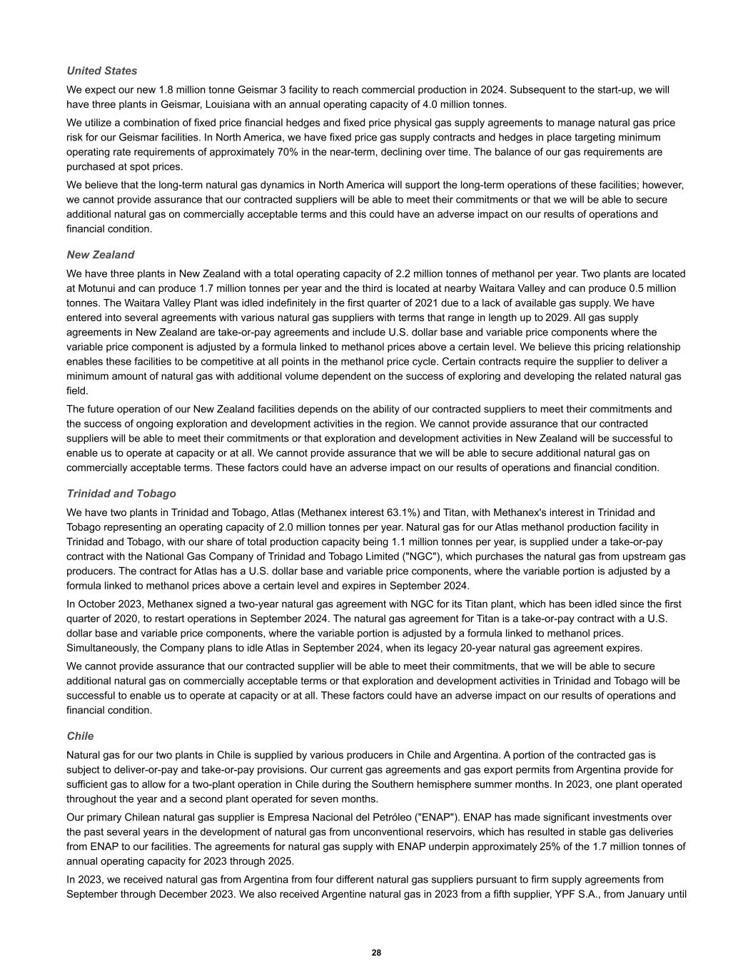 United States We expect our new 1.8 million tonne Geismar 3 facility to reach commercial production in 2024. Subsequent to the start-up, we will have three plants in Geismar, Louisiana with an annual operating capacity of 4.0 million tonnes. We utilize a combination of fixed price financial hedges and fixed price physical gas supply agreements to manage natural gas price risk for our Geismar facilities. In North America, we have fixed price gas supply contracts and hedges in place targeting minimum operating rate requirements of approximately 70% in the near-term, declining over time. The balance of our gas requirements are purchased at spot prices. We believe that the long-term natural gas dynamics in North America will support the long-term operations of these facilities; however, we cannot provide assurance that our contracted suppliers will be able to meet their commitments or that we will be able to secure additional natural gas on commercially acceptable terms and this could have an adverse impact on our results of operations and financial condition. New Zealand We have three plants in New Zealand with a total operating capacity of 2.2 million tonnes of methanol per year. Two plants are located at Motunui and can produce 1.7 million tonnes per year and the third is located at nearby Waitara Valley and can produce 0.5 million tonnes. The Waitara Valley Plant was idled indefinitely in the first quarter of 2021 due to a lack of available gas supply. We have entered into several agreements with various natural gas suppliers with terms that range in length up to 2029. All gas supply agreements in New Zealand are take-or-pay agreements and include U.S. dollar base and variable price components where the variable price component is adjusted by a formula linked to methanol prices above a certain level. We believe this pricing relationship enables these facilities to be competitive at all points in the methanol price cycle. Certain contracts require the supplier to deliver a minimum amount of natural gas with additional volume dependent on the success of exploring and developing the related natural gas field. The future operation of our New Zealand facilities depends on the ability of our contracted suppliers to meet their commitments and the success of ongoing exploration and development activities in the region. We cannot provide assurance that our contracted suppliers will be able to meet their commitments or that exploration and development activities in New Zealand will be successful to enable us to operate at capacity or at all. We cannot provide assurance that we will be able to secure additional natural gas on commercially acceptable terms. These factors could have an adverse impact on our results of operations and financial condition. Trinidad and Tobago We have two plants in Trinidad and Tobago, Atlas (Methanex interest 63.1%) and Titan, with Methanex's interest in Trinidad and Tobago representing an operating capacity of 2.0 million tonnes per year. Natural gas for our Atlas methanol production facility in Trinidad and Tobago, with our share of total production capacity being 1.1 million tonnes per year, is supplied under a take-or-pay contract with the National Gas Company of Trinidad and Tobago Limited ("NGC"), which purchases the natural gas from upstream gas producers. The contract for Atlas has a U.S. dollar base and variable price components, where the variable portion is adjusted by a formula linked to methanol prices above a certain level and expires in September 2024. In October 2023, Methanex signed a two-year natural gas agreement with NGC for its Titan plant, which has been idled since the first quarter of 2020, to restart operations in September 2024. The natural gas agreement for Titan is a take-or-pay contract with a U.S. dollar base and variable price components, where the variable portion is adjusted by a formula linked to methanol prices. Simultaneously, the Company plans to idle Atlas in September 2024, when its legacy 20-year natural gas agreement expires. We cannot provide assurance that our contracted supplier will be able to meet their commitments, that we will be able to secure additional natural gas on commercially acceptable terms or that exploration and development activities in Trinidad and Tobago will be successful to enable us to operate at capacity or at all. These factors could have an adverse impact on our results of operations and financial condition. Chile Natural gas for our two plants in Chile is supplied by various producers in Chile and Argentina. A portion of the contracted gas is subject to deliver-or-pay and take-or-pay provisions. Our current gas agreements and gas export permits from Argentina provide for sufficient gas to allow for a two-plant operation in Chile during the Southern hemisphere summer months. In 2023, one plant operated throughout the year and a second plant operated for seven months. Our primary Chilean natural gas supplier is Empresa Nacional del Petróleo ("ENAP"). ENAP has made significant investments over the past several years in the development of natural gas from unconventional reservoirs, which has resulted in stable gas deliveries from ENAP to our facilities. The agreements for natural gas supply with ENAP underpin approximately 25% of the 1.7 million tonnes of annual operating capacity for 2023 through 2025. In 2023, we received natural gas from Argentina from four different natural gas suppliers pursuant to firm supply agreements from September through December 2023. We also received Argentine natural gas in 2023 from a fifth supplier, YPF S.A., from January until 28