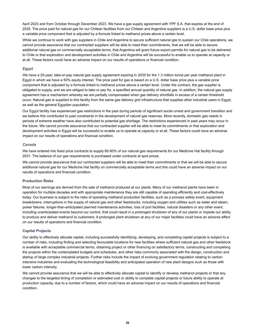 April 2023 and from October through December 2023. We have a gas supply agreement with YPF S.A. that expires at the end of 2025. The price paid for natural gas for our Chilean facilities from our Chilean and Argentine suppliers is a U.S. dollar base price plus a variable price component that is adjusted by a formula linked to methanol prices above a certain level. While we continue to work with gas suppliers in Chile and Argentina to secure sufficient natural gas to sustain our Chile operations, we cannot provide assurance that our contracted suppliers will be able to meet their commitments, that we will be able to secure additional natural gas on commercially acceptable terms, that Argentina will grant future export permits for natural gas to be delivered to Chile or that exploration and development activities in Chile and Argentina will be successful to enable us to operate at capacity or at all. These factors could have an adverse impact on our results of operations or financial condition. Egypt We have a 25-year, take-or-pay natural gas supply agreement expiring in 2035 for the 1.3 million tonne per year methanol plant in Egypt in which we have a 50% equity interest. The price paid for gas is based on a U.S. dollar base price plus a variable price component that is adjusted by a formula linked to methanol prices above a certain level. Under the contract, the gas supplier is obligated to supply, and we are obliged to take or pay for, a specified annual quantity of natural gas. In addition, the natural gas supply agreement has a mechanism whereby we are partially compensated when gas delivery shortfalls in excess of a certain threshold occur. Natural gas is supplied to this facility from the same gas delivery grid infrastructure that supplies other industrial users in Egypt, as well as the general Egyptian population. Our Egypt facility has experienced gas restrictions in the past during periods of significant social unrest and government transition and we believe this contributed to past constraints in the development of natural gas reserves. More recently, domestic gas needs in periods of extreme weather have also contributed to potential gas shortage. The restrictions experienced in past years may occur in the future. We cannot provide assurance that our contracted supplier will be able to meet its commitments or that exploration and development activities in Egypt will be successful to enable us to operate at capacity or at all. These factors could have an adverse impact on our results of operations and financial condition. Canada We have entered into fixed price contracts to supply 80-90% of our natural gas requirements for our Medicine Hat facility through 2031. The balance of our gas requirements is purchased under contracts at spot prices. We cannot provide assurance that our contracted suppliers will be able to meet their commitments or that we will be able to secure additional natural gas for our Medicine Hat facility on commercially acceptable terms and this could have an adverse impact on our results of operations and financial condition. Production Risks Most of our earnings are derived from the sale of methanol produced at our plants. Many of our methanol plants have been in operation for multiple decades and with appropriate maintenance they are still capable of operating efficiently and cost-effectively today. Our business is subject to the risks of operating methanol production facilities, such as a process safety event, equipment breakdowns, interruptions in the supply of natural gas and other feedstocks, including oxygen and utilities such as water and steam, power failures, longer-than-anticipated planned maintenance activities, loss of port facilities, natural disasters or any other event, including unanticipated events beyond our control, that could result in a prolonged shutdown of any of our plants or impede our ability to produce and deliver methanol to customers. A prolonged plant shutdown at any of our major facilities could have an adverse effect on our results of operations and financial condition. Capital Projects Our ability to effectively allocate capital, including successfully identifying, developing, and completing capital projects is subject to a number of risks, including finding and selecting favourable locations for new facilities where sufficient natural gas and other feedstock is available with acceptable commercial terms, obtaining project or other financing on satisfactory terms, constructing and completing the projects within the contemplated budgets and schedules, and other risks commonly associated with the design, construction and startup of large complex industrial projects. Further risks include the impact of evolving government regulation relating to carbon intensive industries and evaluating the technological feasibility and anticipated operation of new plant designs such as those with lower carbon intensity. We cannot provide assurance that we will be able to effectively allocate capital to identify or develop methanol projects or that any changes to the targeted timing of completion or estimated cost or ability to complete capital projects or future ability to operate at production capacity, due to a number of factors, which could have an adverse impact on our results of operations and financial condition. 29