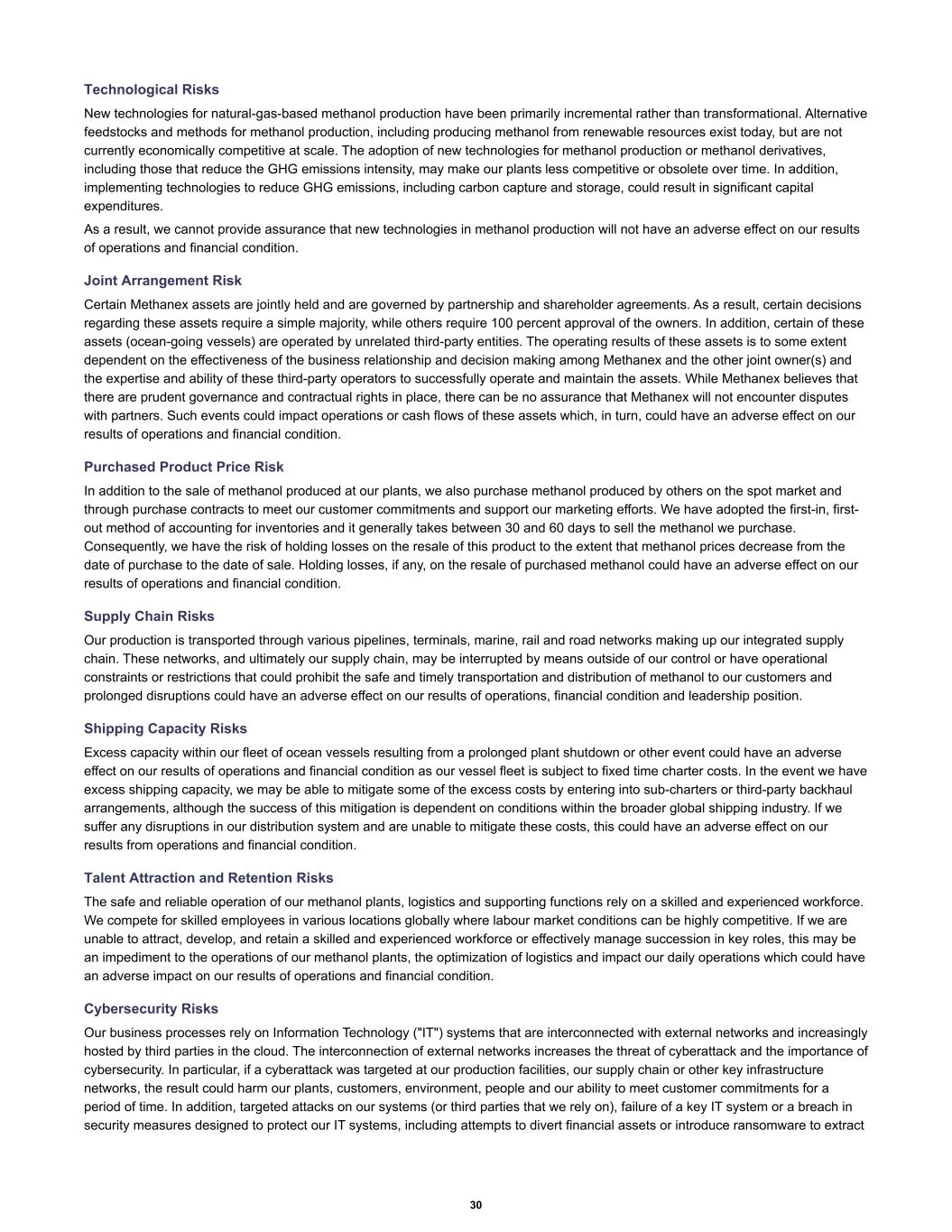 Technological Risks New technologies for natural-gas-based methanol production have been primarily incremental rather than transformational. Alternative feedstocks and methods for methanol production, including producing methanol from renewable resources exist today, but are not currently economically competitive at scale. The adoption of new technologies for methanol production or methanol derivatives, including those that reduce the GHG emissions intensity, may make our plants less competitive or obsolete over time. In addition, implementing technologies to reduce GHG emissions, including carbon capture and storage, could result in significant capital expenditures. As a result, we cannot provide assurance that new technologies in methanol production will not have an adverse effect on our results of operations and financial condition. Joint Arrangement Risk Certain Methanex assets are jointly held and are governed by partnership and shareholder agreements. As a result, certain decisions regarding these assets require a simple majority, while others require 100 percent approval of the owners. In addition, certain of these assets (ocean-going vessels) are operated by unrelated third-party entities. The operating results of these assets is to some extent dependent on the effectiveness of the business relationship and decision making among Methanex and the other joint owner(s) and the expertise and ability of these third-party operators to successfully operate and maintain the assets. While Methanex believes that there are prudent governance and contractual rights in place, there can be no assurance that Methanex will not encounter disputes with partners. Such events could impact operations or cash flows of these assets which, in turn, could have an adverse effect on our results of operations and financial condition. Purchased Product Price Risk In addition to the sale of methanol produced at our plants, we also purchase methanol produced by others on the spot market and through purchase contracts to meet our customer commitments and support our marketing efforts. We have adopted the first-in, first- out method of accounting for inventories and it generally takes between 30 and 60 days to sell the methanol we purchase. Consequently, we have the risk of holding losses on the resale of this product to the extent that methanol prices decrease from the date of purchase to the date of sale. Holding losses, if any, on the resale of purchased methanol could have an adverse effect on our results of operations and financial condition. Supply Chain Risks Our production is transported through various pipelines, terminals, marine, rail and road networks making up our integrated supply chain. These networks, and ultimately our supply chain, may be interrupted by means outside of our control or have operational constraints or restrictions that could prohibit the safe and timely transportation and distribution of methanol to our customers and prolonged disruptions could have an adverse effect on our results of operations, financial condition and leadership position. Shipping Capacity Risks Excess capacity within our fleet of ocean vessels resulting from a prolonged plant shutdown or other event could have an adverse effect on our results of operations and financial condition as our vessel fleet is subject to fixed time charter costs. In the event we have excess shipping capacity, we may be able to mitigate some of the excess costs by entering into sub-charters or third-party backhaul arrangements, although the success of this mitigation is dependent on conditions within the broader global shipping industry. If we suffer any disruptions in our distribution system and are unable to mitigate these costs, this could have an adverse effect on our results from operations and financial condition. Talent Attraction and Retention Risks The safe and reliable operation of our methanol plants, logistics and supporting functions rely on a skilled and experienced workforce. We compete for skilled employees in various locations globally where labour market conditions can be highly competitive. If we are unable to attract, develop, and retain a skilled and experienced workforce or effectively manage succession in key roles, this may be an impediment to the operations of our methanol plants, the optimization of logistics and impact our daily operations which could have an adverse impact on our results of operations and financial condition. Cybersecurity Risks Our business processes rely on Information Technology ("IT") systems that are interconnected with external networks and increasingly hosted by third parties in the cloud. The interconnection of external networks increases the threat of cyberattack and the importance of cybersecurity. In particular, if a cyberattack was targeted at our production facilities, our supply chain or other key infrastructure networks, the result could harm our plants, customers, environment, people and our ability to meet customer commitments for a period of time. In addition, targeted attacks on our systems (or third parties that we rely on), failure of a key IT system or a breach in security measures designed to protect our IT systems, including attempts to divert financial assets or introduce ransomware to extract 30