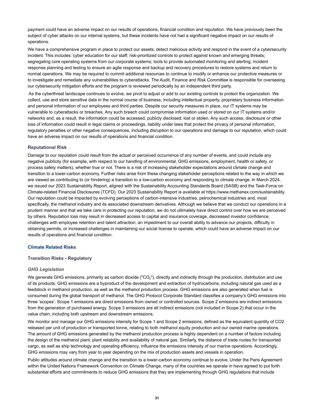 payment could have an adverse impact on our results of operations, financial condition and reputation. We have previously been the subject of cyber attacks on our internal systems, but these incidents have not had a significant negative impact on our results of operations. We have a comprehensive program in place to protect our assets, detect malicious activity and respond in the event of a cybersecurity incident. This includes: cyber education for our staff; risk-prioritized controls to protect against known and emerging threats; segregating core operating systems from our corporate systems; tools to provide automated monitoring and alerting; incident response planning and testing to ensure an agile response and backup and recovery procedures to restore systems and return to normal operations. We may be required to commit additional resources to continue to modify or enhance our protective measures or to investigate and remediate any vulnerabilities to cyberattacks. The Audit, Finance and Risk Committee is responsible for overseeing our cybersecurity mitigation efforts and the program is reviewed periodically by an independent third party. As the cyberthreat landscape continues to evolve, we pivot to adjust or add to our existing controls to protect the organization. We collect, use and store sensitive data in the normal course of business, including intellectual property, proprietary business information and personal information of our employees and third parties. Despite our security measures in place, our IT systems may be vulnerable to cyberattacks or breaches. Any such breach could compromise information used or stored on our IT systems and/or networks and, as a result, the information could be accessed, publicly disclosed, lost or stolen. Any such access, disclosure or other loss of information could result in legal claims or proceedings, liability under laws that protect the privacy of personal information, regulatory penalties or other negative consequences, including disruption to our operations and damage to our reputation, which could have an adverse impact on our results of operations and financial condition. Reputational Risk Damage to our reputation could result from the actual or perceived occurrence of any number of events, and could include any negative publicity (for example, with respect to our handling of environmental, GHG emissions, employment, health or safety, or process safety matters), whether true or not. There is a risk of increasing stakeholder expectations around climate change and transition to a lower-carbon economy. Further risks arise from these changing stakeholder perceptions related to the way in which we are viewed as contributing to (or hindering) a transition to a low-carbon economy and responding to climate change. In March 2024, we issued our 2023 Sustainability Report, aligned with the Sustainability Accounting Standards Board (SASB) and the Task-Force on Climate-related Financial Disclosures (TCFD). Our 2023 Sustainability Report is available at https://www.methanex.com/sustainability. Our reputation could be impacted by evolving perceptions of carbon-intensive industries, petrochemical industries and, most specifically, the methanol industry and its associated downstream derivatives. Although we believe that we conduct our operations in a prudent manner and that we take care in protecting our reputation, we do not ultimately have direct control over how we are perceived by others. Reputation loss may result in decreased access to capital and insurance coverage, decreased investor confidence, challenges with employee retention and talent attraction, an impediment to our overall ability to advance our projects, difficulty in obtaining permits, or increased challenges in maintaining our social license to operate, which could have an adverse impact on our results of operations and financial condition. Climate Related Risks Transition Risks - Regulatory GHG Legislation We generate GHG emissions, primarily as carbon dioxide ("CO2"), directly and indirectly through the production, distribution and use of its products. GHG emissions are a byproduct of the development and extraction of hydrocarbons, including natural gas used as a feedstock in methanol production, as well as the methanol production process. GHG emissions are also generated when fuel is consumed during the global transport of methanol. The GHG Protocol Corporate Standard classifies a company’s GHG emissions into three ‘scopes’. Scope 1 emissions are direct emissions from owned or controlled sources. Scope 2 emissions are indirect emissions from the generation of purchased energy. Scope 3 emissions are all indirect emissions (not included in Scope 2) that occur in the value chain, including both upstream and downstream emissions. We monitor and manage our GHG emissions intensity for Scope 1 and Scope 2 emissions, defined as the equivalent quantity of CO2 released per unit of production or transported tonne, relating to both methanol equity production and our owned marine operations. The amount of GHG emissions generated by the methanol production process is highly dependent on a number of factors including the design of the methanol plant, plant reliability and availability of natural gas. Similarly, the distance of trade routes for transported cargo, as well as ship technology and operating efficiency, influence the emissions intensity of our marine operations. Accordingly, GHG emissions may vary from year to year depending on the mix of production assets and vessels in operation. Public attitudes around climate change and the transition to a lower-carbon economy continue to evolve. Under the Paris Agreement within the United Nations Framework Convention on Climate Change, many of the countries we operate in have agreed to put forth substantial efforts and commitments to reduce GHG emissions that they are implementing through GHG regulations that include 31