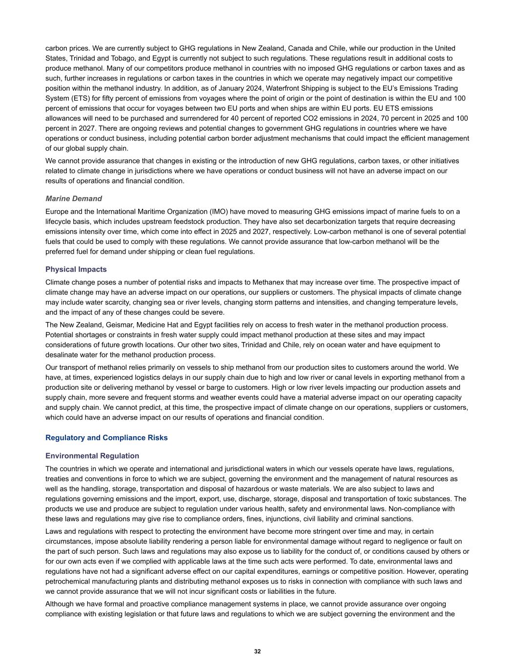 carbon prices. We are currently subject to GHG regulations in New Zealand, Canada and Chile, while our production in the United States, Trinidad and Tobago, and Egypt is currently not subject to such regulations. These regulations result in additional costs to produce methanol. Many of our competitors produce methanol in countries with no imposed GHG regulations or carbon taxes and as such, further increases in regulations or carbon taxes in the countries in which we operate may negatively impact our competitive position within the methanol industry. In addition, as of January 2024, Waterfront Shipping is subject to the EU’s Emissions Trading System (ETS) for fifty percent of emissions from voyages where the point of origin or the point of destination is within the EU and 100 percent of emissions that occur for voyages between two EU ports and when ships are within EU ports. EU ETS emissions allowances will need to be purchased and surrendered for 40 percent of reported CO2 emissions in 2024, 70 percent in 2025 and 100 percent in 2027. There are ongoing reviews and potential changes to government GHG regulations in countries where we have operations or conduct business, including potential carbon border adjustment mechanisms that could impact the efficient management of our global supply chain. We cannot provide assurance that changes in existing or the introduction of new GHG regulations, carbon taxes, or other initiatives related to climate change in jurisdictions where we have operations or conduct business will not have an adverse impact on our results of operations and financial condition. Marine Demand Europe and the International Maritime Organization (IMO) have moved to measuring GHG emissions impact of marine fuels to on a lifecycle basis, which includes upstream feedstock production. They have also set decarbonization targets that require decreasing emissions intensity over time, which come into effect in 2025 and 2027, respectively. Low-carbon methanol is one of several potential fuels that could be used to comply with these regulations. We cannot provide assurance that low-carbon methanol will be the preferred fuel for demand under shipping or clean fuel regulations. Physical Impacts Climate change poses a number of potential risks and impacts to Methanex that may increase over time. The prospective impact of climate change may have an adverse impact on our operations, our suppliers or customers. The physical impacts of climate change may include water scarcity, changing sea or river levels, changing storm patterns and intensities, and changing temperature levels, and the impact of any of these changes could be severe. The New Zealand, Geismar, Medicine Hat and Egypt facilities rely on access to fresh water in the methanol production process. Potential shortages or constraints in fresh water supply could impact methanol production at these sites and may impact considerations of future growth locations. Our other two sites, Trinidad and Chile, rely on ocean water and have equipment to desalinate water for the methanol production process. Our transport of methanol relies primarily on vessels to ship methanol from our production sites to customers around the world. We have, at times, experienced logistics delays in our supply chain due to high and low river or canal levels in exporting methanol from a production site or delivering methanol by vessel or barge to customers. High or low river levels impacting our production assets and supply chain, more severe and frequent storms and weather events could have a material adverse impact on our operating capacity and supply chain. We cannot predict, at this time, the prospective impact of climate change on our operations, suppliers or customers, which could have an adverse impact on our results of operations and financial condition. Regulatory and Compliance Risks Environmental Regulation The countries in which we operate and international and jurisdictional waters in which our vessels operate have laws, regulations, treaties and conventions in force to which we are subject, governing the environment and the management of natural resources as well as the handling, storage, transportation and disposal of hazardous or waste materials. We are also subject to laws and regulations governing emissions and the import, export, use, discharge, storage, disposal and transportation of toxic substances. The products we use and produce are subject to regulation under various health, safety and environmental laws. Non-compliance with these laws and regulations may give rise to compliance orders, fines, injunctions, civil liability and criminal sanctions. Laws and regulations with respect to protecting the environment have become more stringent over time and may, in certain circumstances, impose absolute liability rendering a person liable for environmental damage without regard to negligence or fault on the part of such person. Such laws and regulations may also expose us to liability for the conduct of, or conditions caused by others or for our own acts even if we complied with applicable laws at the time such acts were performed. To date, environmental laws and regulations have not had a significant adverse effect on our capital expenditures, earnings or competitive position. However, operating petrochemical manufacturing plants and distributing methanol exposes us to risks in connection with compliance with such laws and we cannot provide assurance that we will not incur significant costs or liabilities in the future. Although we have formal and proactive compliance management systems in place, we cannot provide assurance over ongoing compliance with existing legislation or that future laws and regulations to which we are subject governing the environment and the 32