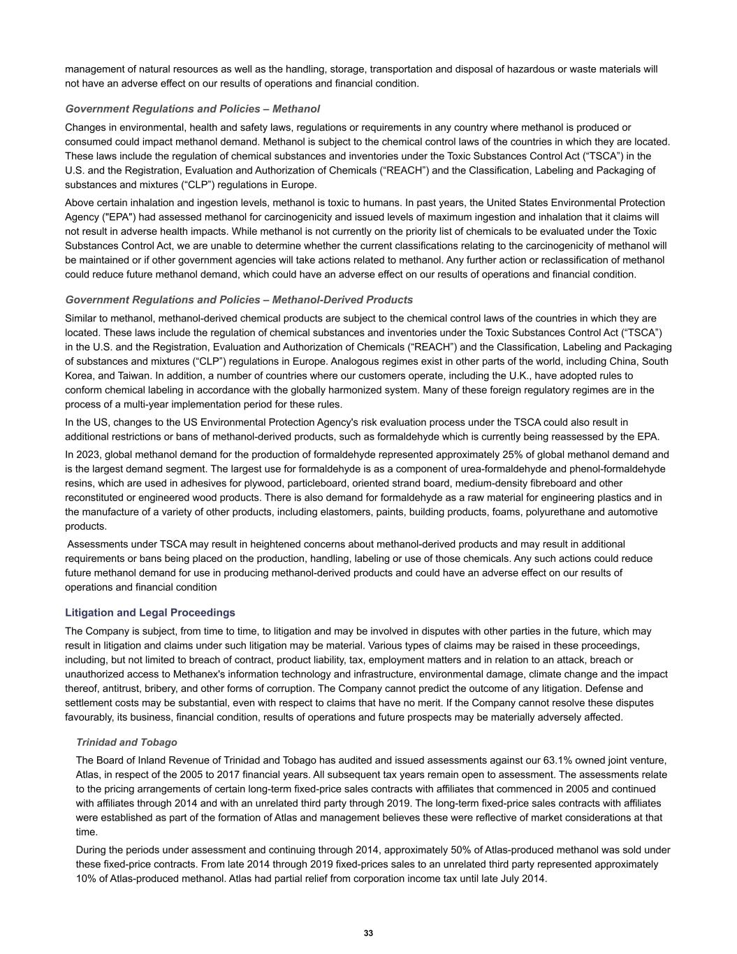 management of natural resources as well as the handling, storage, transportation and disposal of hazardous or waste materials will not have an adverse effect on our results of operations and financial condition. Government Regulations and Policies – Methanol Changes in environmental, health and safety laws, regulations or requirements in any country where methanol is produced or consumed could impact methanol demand. Methanol is subject to the chemical control laws of the countries in which they are located. These laws include the regulation of chemical substances and inventories under the Toxic Substances Control Act (“TSCA”) in the U.S. and the Registration, Evaluation and Authorization of Chemicals (“REACH”) and the Classification, Labeling and Packaging of substances and mixtures (“CLP”) regulations in Europe. Above certain inhalation and ingestion levels, methanol is toxic to humans. In past years, the United States Environmental Protection Agency ("EPA") had assessed methanol for carcinogenicity and issued levels of maximum ingestion and inhalation that it claims will not result in adverse health impacts. While methanol is not currently on the priority list of chemicals to be evaluated under the Toxic Substances Control Act, we are unable to determine whether the current classifications relating to the carcinogenicity of methanol will be maintained or if other government agencies will take actions related to methanol. Any further action or reclassification of methanol could reduce future methanol demand, which could have an adverse effect on our results of operations and financial condition. Government Regulations and Policies – Methanol-Derived Products Similar to methanol, methanol-derived chemical products are subject to the chemical control laws of the countries in which they are located. These laws include the regulation of chemical substances and inventories under the Toxic Substances Control Act (“TSCA”) in the U.S. and the Registration, Evaluation and Authorization of Chemicals (“REACH”) and the Classification, Labeling and Packaging of substances and mixtures (“CLP”) regulations in Europe. Analogous regimes exist in other parts of the world, including China, South Korea, and Taiwan. In addition, a number of countries where our customers operate, including the U.K., have adopted rules to conform chemical labeling in accordance with the globally harmonized system. Many of these foreign regulatory regimes are in the process of a multi-year implementation period for these rules. In the US, changes to the US Environmental Protection Agency's risk evaluation process under the TSCA could also result in additional restrictions or bans of methanol-derived products, such as formaldehyde which is currently being reassessed by the EPA. In 2023, global methanol demand for the production of formaldehyde represented approximately 25% of global methanol demand and is the largest demand segment. The largest use for formaldehyde is as a component of urea-formaldehyde and phenol-formaldehyde resins, which are used in adhesives for plywood, particleboard, oriented strand board, medium-density fibreboard and other reconstituted or engineered wood products. There is also demand for formaldehyde as a raw material for engineering plastics and in the manufacture of a variety of other products, including elastomers, paints, building products, foams, polyurethane and automotive products. Assessments under TSCA may result in heightened concerns about methanol-derived products and may result in additional requirements or bans being placed on the production, handling, labeling or use of those chemicals. Any such actions could reduce future methanol demand for use in producing methanol-derived products and could have an adverse effect on our results of operations and financial condition Litigation and Legal Proceedings The Company is subject, from time to time, to litigation and may be involved in disputes with other parties in the future, which may result in litigation and claims under such litigation may be material. Various types of claims may be raised in these proceedings, including, but not limited to breach of contract, product liability, tax, employment matters and in relation to an attack, breach or unauthorized access to Methanex's information technology and infrastructure, environmental damage, climate change and the impact thereof, antitrust, bribery, and other forms of corruption. The Company cannot predict the outcome of any litigation. Defense and settlement costs may be substantial, even with respect to claims that have no merit. If the Company cannot resolve these disputes favourably, its business, financial condition, results of operations and future prospects may be materially adversely affected. Trinidad and Tobago The Board of Inland Revenue of Trinidad and Tobago has audited and issued assessments against our 63.1% owned joint venture, Atlas, in respect of the 2005 to 2017 financial years. All subsequent tax years remain open to assessment. The assessments relate to the pricing arrangements of certain long-term fixed-price sales contracts with affiliates that commenced in 2005 and continued with affiliates through 2014 and with an unrelated third party through 2019. The long-term fixed-price sales contracts with affiliates were established as part of the formation of Atlas and management believes these were reflective of market considerations at that time. During the periods under assessment and continuing through 2014, approximately 50% of Atlas-produced methanol was sold under these fixed-price contracts. From late 2014 through 2019 fixed-prices sales to an unrelated third party represented approximately 10% of Atlas-produced methanol. Atlas had partial relief from corporation income tax until late July 2014. 33