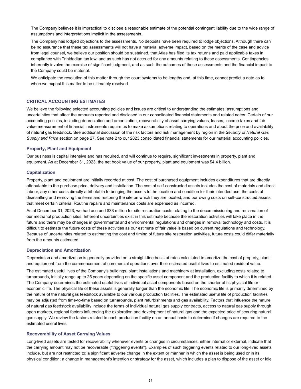 The Company believes it is impractical to disclose a reasonable estimate of the potential contingent liability due to the wide range of assumptions and interpretations implicit in the assessments. The Company has lodged objections to the assessments. No deposits have been required to lodge objections. Although there can be no assurance that these tax assessments will not have a material adverse impact, based on the merits of the case and advice from legal counsel, we believe our position should be sustained, that Atlas has filed its tax returns and paid applicable taxes in compliance with Trinidadian tax law, and as such has not accrued for any amounts relating to these assessments. Contingencies inherently involve the exercise of significant judgment, and as such the outcomes of these assessments and the financial impact to the Company could be material. We anticipate the resolution of this matter through the court systems to be lengthy and, at this time, cannot predict a date as to when we expect this matter to be ultimately resolved. CRITICAL ACCOUNTING ESTIMATES We believe the following selected accounting policies and issues are critical to understanding the estimates, assumptions and uncertainties that affect the amounts reported and disclosed in our consolidated financial statements and related notes. Certain of our accounting policies, including depreciation and amortization, recoverability of asset carrying values, leases, income taxes and fair value measurement of financial instruments require us to make assumptions relating to operations and about the price and availability of natural gas feedstock. See additional discussion of the risk factors and risk management by region in the Security of Natural Gas Supply and Price section on page 27. See note 2 to our 2023 consolidated financial statements for our material accounting policies. Property, Plant and Equipment Our business is capital intensive and has required, and will continue to require, significant investments in property, plant and equipment. As at December 31, 2023, the net book value of our property, plant and equipment was $4.4 billion. Capitalization Property, plant and equipment are initially recorded at cost. The cost of purchased equipment includes expenditures that are directly attributable to the purchase price, delivery and installation. The cost of self-constructed assets includes the cost of materials and direct labour, any other costs directly attributable to bringing the assets to the location and condition for their intended use, the costs of dismantling and removing the items and restoring the site on which they are located, and borrowing costs on self-constructed assets that meet certain criteria. Routine repairs and maintenance costs are expensed as incurred. As at December 31, 2023, we had accrued $33 million for site restoration costs relating to the decommissioning and reclamation of our methanol production sites. Inherent uncertainties exist in this estimate because the restoration activities will take place in the future and there may be changes in governmental and environmental regulations and changes in removal technology and costs. It is difficult to estimate the future costs of these activities as our estimate of fair value is based on current regulations and technology. Because of uncertainties related to estimating the cost and timing of future site restoration activities, future costs could differ materially from the amounts estimated. Depreciation and Amortization Depreciation and amortization is generally provided on a straight-line basis at rates calculated to amortize the cost of property, plant and equipment from the commencement of commercial operations over their estimated useful lives to estimated residual value. The estimated useful lives of the Company’s buildings, plant installations and machinery at installation, excluding costs related to turnarounds, initially range up to 25 years depending on the specific asset component and the production facility to which it is related. The Company determines the estimated useful lives of individual asset components based on the shorter of its physical life or economic life. The physical life of these assets is generally longer than the economic life. The economic life is primarily determined by the nature of the natural gas feedstock available to our various production facilities. The estimated useful life of production facilities may be adjusted from time-to-time based on turnarounds, plant refurbishments and gas availability. Factors that influence the nature of natural gas feedstock availability include the terms of individual natural gas supply contracts, access to natural gas supply through open markets, regional factors influencing the exploration and development of natural gas and the expected price of securing natural gas supply. We review the factors related to each production facility on an annual basis to determine if changes are required to the estimated useful lives. Recoverability of Asset Carrying Values Long-lived assets are tested for recoverability whenever events or changes in circumstances, either internal or external, indicate that the carrying amount may not be recoverable ("triggering events"). Examples of such triggering events related to our long-lived assets include, but are not restricted to: a significant adverse change in the extent or manner in which the asset is being used or in its physical condition; a change in management's intention or strategy for the asset, which includes a plan to dispose of the asset or idle 34