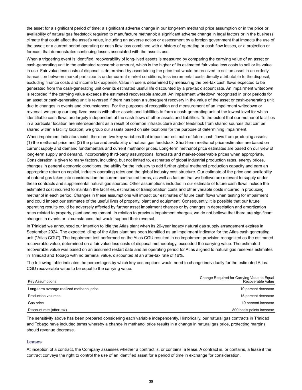 the asset for a significant period of time; a significant adverse change in our long-term methanol price assumption or in the price or availability of natural gas feedstock required to manufacture methanol; a significant adverse change in legal factors or in the business climate that could affect the asset’s value, including an adverse action or assessment by a foreign government that impacts the use of the asset; or a current period operating or cash flow loss combined with a history of operating or cash flow losses, or a projection or forecast that demonstrates continuing losses associated with the asset’s use. When a triggering event is identified, recoverability of long-lived assets is measured by comparing the carrying value of an asset or cash-generating unit to the estimated recoverable amount, which is the higher of its estimated fair value less costs to sell or its value in use. Fair value less costs of disposal is determined by ascertaining the price that would be received to sell an asset in an orderly transaction between market participants under current market conditions, less incremental costs directly attributable to the disposal, excluding finance costs and income tax expense. Value in use is determined by measuring the pre-tax cash flows expected to be generated from the cash-generating unit over its estimated useful life discounted by a pre-tax discount rate. An impairment writedown is recorded if the carrying value exceeds the estimated recoverable amount. An impairment writedown recognized in prior periods for an asset or cash-generating unit is reversed if there has been a subsequent recovery in the value of the asset or cash-generating unit due to changes in events and circumstances. For the purposes of recognition and measurement of an impairment writedown or reversal, we group our long-lived assets with other assets and liabilities to form a cash-generating unit at the lowest level for which identifiable cash flows are largely independent of the cash flows of other assets and liabilities. To the extent that our methanol facilities in a particular location are interdependent as a result of common infrastructure and/or feedstock from shared sources that can be shared within a facility location, we group our assets based on site locations for the purpose of determining impairment. When impairment indicators exist, there are two key variables that impact our estimate of future cash flows from producing assets: (1) the methanol price and (2) the price and availability of natural gas feedstock. Short-term methanol price estimates are based on current supply and demand fundamentals and current methanol prices. Long-term methanol price estimates are based on our view of long-term supply and demand, incorporating third-party assumptions, forecasts and market-observable prices when appropriate. Consideration is given to many factors, including, but not limited to, estimates of global industrial production rates, energy prices, changes in general economic conditions, the ability for the industry to add further global methanol production capacity and earn an appropriate return on capital, industry operating rates and the global industry cost structure. Our estimate of the price and availability of natural gas takes into consideration the current contracted terms, as well as factors that we believe are relevant to supply under these contracts and supplemental natural gas sources. Other assumptions included in our estimate of future cash flows include the estimated cost incurred to maintain the facilities, estimates of transportation costs and other variable costs incurred in producing methanol in each period. Changes in these assumptions will impact our estimates of future cash flows when testing for impairment and could impact our estimates of the useful lives of property, plant and equipment. Consequently, it is possible that our future operating results could be adversely affected by further asset impairment charges or by changes in depreciation and amortization rates related to property, plant and equipment. In relation to previous impairment charges, we do not believe that there are significant changes in events or circumstances that would support their reversal. In Trinidad we announced our intention to idle the Atlas plant when its 20-year legacy natural gas supply arrangement expires in September 2024. The expected idling of the Atlas plant has been identified as an impairment indicator for the Atlas cash generating unit ("Atlas CGU"). The impairment test performed on the Atlas CGU resulted in no impairment provision recognized as the estimated recoverable value, determined on a fair value less costs of disposal methodology, exceeded the carrying value. The estimated recoverable value was based on an assumed restart date and an operating period for Atlas aligned to natural gas reserves estimates in Trinidad and Tobago with no terminal value, discounted at an after-tax rate of 16%. The following table indicates the percentages by which key assumptions would need to change individually for the estimated Atlas CGU recoverable value to be equal to the carrying value: Key Assumptions Change Required for Carrying Value to Equal Recoverable Value Long-term average realized methanol price 10 percent decrease Production volumes 15 percent decrease Gas price 10 percent increase Discount rate (after-tax) 800 basis points increase The sensitivity above has been prepared considering each variable independently. Historically, our natural gas contracts in Trinidad and Tobago have included terms whereby a change in methanol price results in a change in natural gas price, protecting margins should revenue decrease. Leases At inception of a contract, the Company assesses whether a contract is, or contains, a lease. A contract is, or contains, a lease if the contract conveys the right to control the use of an identified asset for a period of time in exchange for consideration. 35