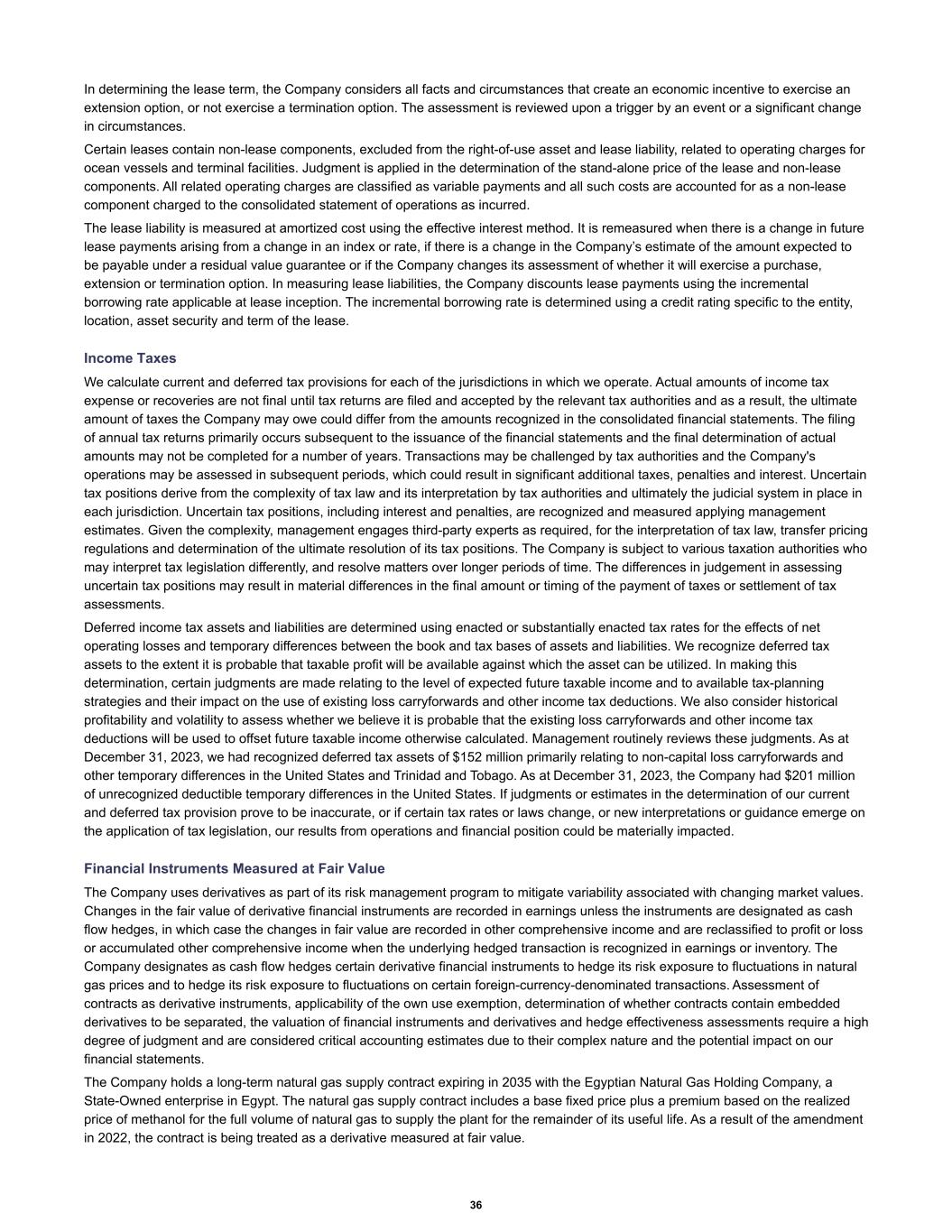 In determining the lease term, the Company considers all facts and circumstances that create an economic incentive to exercise an extension option, or not exercise a termination option. The assessment is reviewed upon a trigger by an event or a significant change in circumstances. Certain leases contain non-lease components, excluded from the right-of-use asset and lease liability, related to operating charges for ocean vessels and terminal facilities. Judgment is applied in the determination of the stand-alone price of the lease and non-lease components. All related operating charges are classified as variable payments and all such costs are accounted for as a non-lease component charged to the consolidated statement of operations as incurred. The lease liability is measured at amortized cost using the effective interest method. It is remeasured when there is a change in future lease payments arising from a change in an index or rate, if there is a change in the Company’s estimate of the amount expected to be payable under a residual value guarantee or if the Company changes its assessment of whether it will exercise a purchase, extension or termination option. In measuring lease liabilities, the Company discounts lease payments using the incremental borrowing rate applicable at lease inception. The incremental borrowing rate is determined using a credit rating specific to the entity, location, asset security and term of the lease. Income Taxes We calculate current and deferred tax provisions for each of the jurisdictions in which we operate. Actual amounts of income tax expense or recoveries are not final until tax returns are filed and accepted by the relevant tax authorities and as a result, the ultimate amount of taxes the Company may owe could differ from the amounts recognized in the consolidated financial statements. The filing of annual tax returns primarily occurs subsequent to the issuance of the financial statements and the final determination of actual amounts may not be completed for a number of years. Transactions may be challenged by tax authorities and the Company's operations may be assessed in subsequent periods, which could result in significant additional taxes, penalties and interest. Uncertain tax positions derive from the complexity of tax law and its interpretation by tax authorities and ultimately the judicial system in place in each jurisdiction. Uncertain tax positions, including interest and penalties, are recognized and measured applying management estimates. Given the complexity, management engages third-party experts as required, for the interpretation of tax law, transfer pricing regulations and determination of the ultimate resolution of its tax positions. The Company is subject to various taxation authorities who may interpret tax legislation differently, and resolve matters over longer periods of time. The differences in judgement in assessing uncertain tax positions may result in material differences in the final amount or timing of the payment of taxes or settlement of tax assessments. Deferred income tax assets and liabilities are determined using enacted or substantially enacted tax rates for the effects of net operating losses and temporary differences between the book and tax bases of assets and liabilities. We recognize deferred tax assets to the extent it is probable that taxable profit will be available against which the asset can be utilized. In making this determination, certain judgments are made relating to the level of expected future taxable income and to available tax-planning strategies and their impact on the use of existing loss carryforwards and other income tax deductions. We also consider historical profitability and volatility to assess whether we believe it is probable that the existing loss carryforwards and other income tax deductions will be used to offset future taxable income otherwise calculated. Management routinely reviews these judgments. As at December 31, 2023, we had recognized deferred tax assets of $152 million primarily relating to non-capital loss carryforwards and other temporary differences in the United States and Trinidad and Tobago. As at December 31, 2023, the Company had $201 million of unrecognized deductible temporary differences in the United States. If judgments or estimates in the determination of our current and deferred tax provision prove to be inaccurate, or if certain tax rates or laws change, or new interpretations or guidance emerge on the application of tax legislation, our results from operations and financial position could be materially impacted. Financial Instruments Measured at Fair Value The Company uses derivatives as part of its risk management program to mitigate variability associated with changing market values. Changes in the fair value of derivative financial instruments are recorded in earnings unless the instruments are designated as cash flow hedges, in which case the changes in fair value are recorded in other comprehensive income and are reclassified to profit or loss or accumulated other comprehensive income when the underlying hedged transaction is recognized in earnings or inventory. The Company designates as cash flow hedges certain derivative financial instruments to hedge its risk exposure to fluctuations in natural gas prices and to hedge its risk exposure to fluctuations on certain foreign-currency-denominated transactions. Assessment of contracts as derivative instruments, applicability of the own use exemption, determination of whether contracts contain embedded derivatives to be separated, the valuation of financial instruments and derivatives and hedge effectiveness assessments require a high degree of judgment and are considered critical accounting estimates due to their complex nature and the potential impact on our financial statements. The Company holds a long-term natural gas supply contract expiring in 2035 with the Egyptian Natural Gas Holding Company, a 