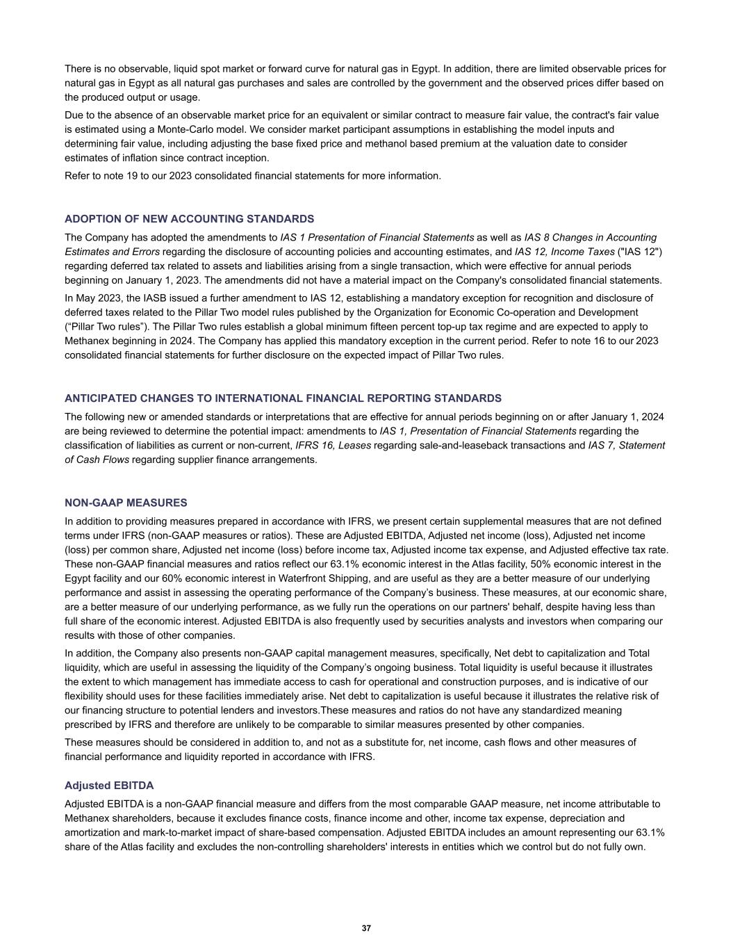 There is no observable, liquid spot market or forward curve for natural gas in Egypt. In addition, there are limited observable prices for natural gas in Egypt as all natural gas purchases and sales are controlled by the government and the observed prices differ based on the produced output or usage. Due to the absence of an observable market price for an equivalent or similar contract to measure fair value, the contract's fair value is estimated using a Monte-Carlo model. We consider market participant assumptions in establishing the model inputs and determining fair value, including adjusting the base fixed price and methanol based premium at the valuation date to consider estimates of inflation since contract inception. Refer to note 19 to our 2023 consolidated financial statements for more information. ADOPTION OF NEW ACCOUNTING STANDARDS The Company has adopted the amendments to IAS 1 Presentation of Financial Statements as well as IAS 8 Changes in Accounting Estimates and Errors regarding the disclosure of accounting policies and accounting estimates, and IAS 12, Income Taxes ("IAS 12") regarding deferred tax related to assets and liabilities arising from a single transaction, which were effective for annual periods beginning on January 1, 2023. The amendments did not have a material impact on the Company's consolidated financial statements. In May 2023, the IASB issued a further amendment to IAS 12, establishing a mandatory exception for recognition and disclosure of deferred taxes related to the Pillar Two model rules published by the Organization for Economic Co-operation and Development (“Pillar Two rules”). The Pillar Two rules establish a global minimum fifteen percent top-up tax regime and are expected to apply to Methanex beginning in 2024. The Company has applied this mandatory exception in the current period. Refer to note 16 to our 2023 consolidated financial statements for further disclosure on the expected impact of Pillar Two rules. ANTICIPATED CHANGES TO INTERNATIONAL FINANCIAL REPORTING STANDARDS The following new or amended standards or interpretations that are effective for annual periods beginning on or after January 1, 2024 are being reviewed to determine the potential impact: amendments to IAS 1, Presentation of Financial Statements regarding the classification of liabilities as current or non-current, IFRS 16, Leases regarding sale-and-leaseback transactions and IAS 7, Statement of Cash Flows regarding supplier finance arrangements. NON-GAAP MEASURES In addition to providing measures prepared in accordance with IFRS, we present certain supplemental measures that are not defined terms under IFRS (non-GAAP measures or ratios). These are Adjusted EBITDA, Adjusted net income (loss), Adjusted net income (loss) per common share, Adjusted net income (loss) before income tax, Adjusted income tax expense, and Adjusted effective tax rate. These non-GAAP financial measures and ratios reflect our 63.1% economic interest in the Atlas facility, 50% economic interest in the Egypt facility and our 60% economic interest in Waterfront Shipping, and are useful as they are a better measure of our underlying performance and assist in assessing the operating performance of the Company’s business. These measures, at our economic share, are a better measure of our underlying performance, as we fully run the operations on our partners' behalf, despite having less than full share of the economic interest. Adjusted EBITDA is also frequently used by securities analysts and investors when comparing our results with those of other companies. In addition, the Company also presents non-GAAP capital management measures, specifically, Net debt to capitalization and Total liquidity, which are useful in assessing the liquidity of the Company’s ongoing business. Total liquidity is useful because it illustrates the extent to which management has immediate access to cash for operational and construction purposes, and is indicative of our flexibility should uses for these facilities immediately arise. Net debt to capitalization is useful because it illustrates the relative risk of our financing structure to potential lenders and investors.These measures and ratios do not have any standardized meaning prescribed by IFRS and therefore are unlikely to be comparable to similar measures presented by other companies. These measures should be considered in addition to, and not as a substitute for, net income, cash flows and other measures of financial performance and liquidity reported in accordance with IFRS. Adjusted EBITDA Adjusted EBITDA is a non-GAAP financial measure and differs from the most comparable GAAP measure, net income attributable to Methanex shareholders, because it excludes finance costs, finance income and other, income tax expense, depreciation and amortization and mark-to-market impact of share-based compensation. Adjusted EBITDA includes an amount representing our 63.1% share of the Atlas facility and excludes the non-controlling shareholders' interests in entities which we control but do not fully own. 37