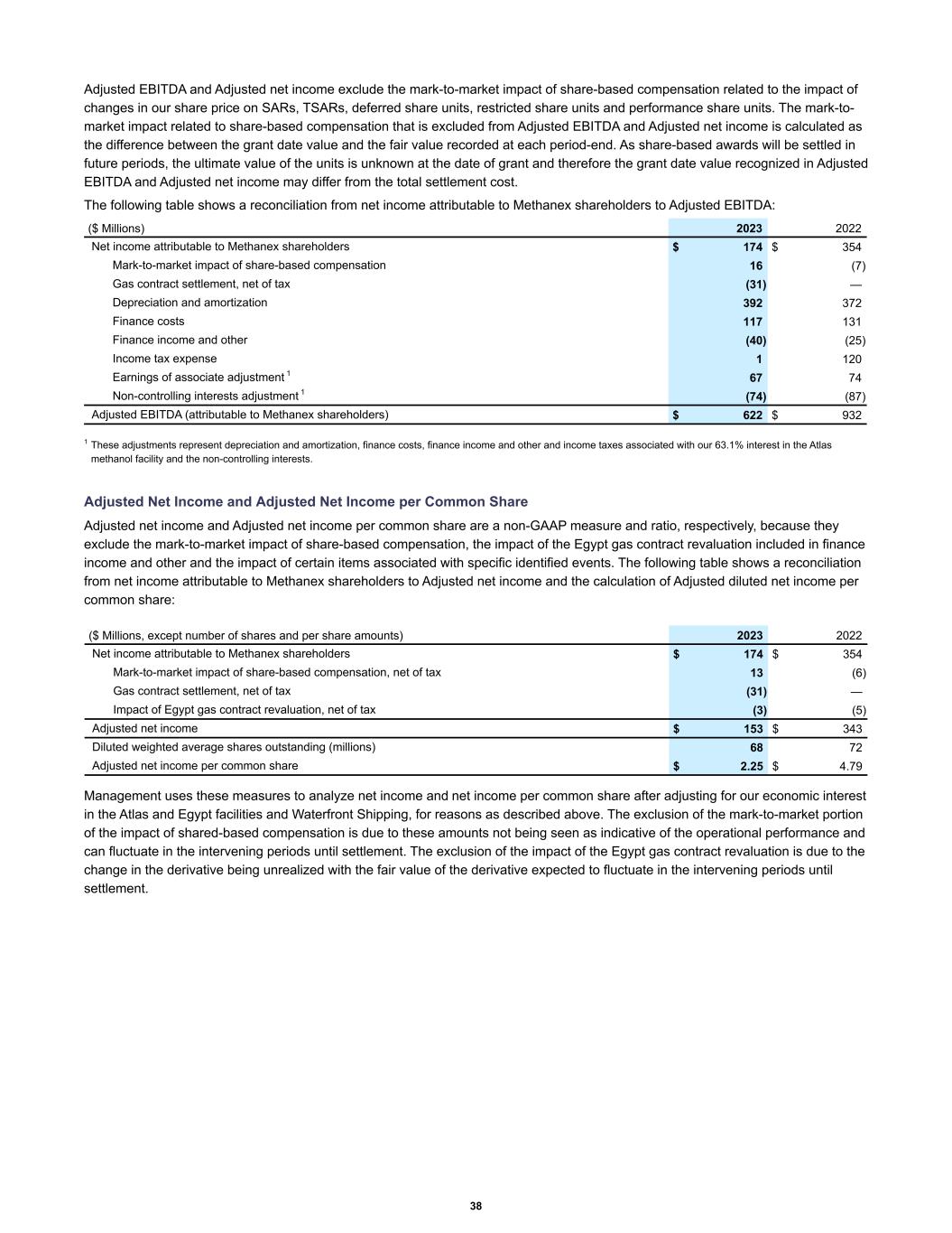 Adjusted EBITDA and Adjusted net income exclude the mark-to-market impact of share-based compensation related to the impact of changes in our share price on SARs, TSARs, deferred share units, restricted share units and performance share units. The mark-to- market impact related to share-based compensation that is excluded from Adjusted EBITDA and Adjusted net income is calculated as the difference between the grant date value and the fair value recorded at each period-end. As share-based awards will be settled in future periods, the ultimate value of the units is unknown at the date of grant and therefore the grant date value recognized in Adjusted EBITDA and Adjusted net income may differ from the total settlement cost. The following table shows a reconciliation from net income attributable to Methanex shareholders to Adjusted EBITDA: Net income attributable to Methanex shareholders $ 174 $ 354 Mark-to-market impact of share-based compensation 16 (7) Gas contract settlement, net of tax (31) — Depreciation and amortization 392 372 Finance costs 117 131 Finance income and other (40) (25) Income tax expense 1 120 Earnings of associate adjustment 1 67 74 Non-controlling interests adjustment 1 (74) (87) Adjusted EBITDA (attributable to Methanex shareholders) $ 622 $ 932 ($ Millions) 2023 2022 1 These adjustments represent depreciation and amortization, finance costs, finance income and other and income taxes associated with our 63.1% interest in the Atlas methanol facility and the non-controlling interests. Adjusted Net Income and Adjusted Net Income per Common Share Adjusted net income and Adjusted net income per common share are a non-GAAP measure and ratio, respectively, because they exclude the mark-to-market impact of share-based compensation, the impact of the Egypt gas contract revaluation included in finance income and other and the impact of certain items associated with specific identified events. The following table shows a reconciliation from net income attributable to Methanex shareholders to Adjusted net income and the calculation of Adjusted diluted net income per common share: Net income attributable to Methanex shareholders $ 174 $ 354 Mark-to-market impact of share-based compensation, net of tax 13 (6) Gas contract settlement, net of tax (31) — Impact of Egypt gas contract revaluation, net of tax (3) (5) Adjusted net income $ 153 $ 343 Diluted weighted average shares outstanding (millions) 68 72 Adjusted net income per common share $ 2.25 $ 4.79 ($ Millions, except number of shares and per share amounts) 2023 2022 Management uses these measures to analyze net income and net income per common share after adjusting for our economic interest in the Atlas and Egypt facilities and Waterfront Shipping, for reasons as described above. The exclusion of the mark-to-market portion of the impact of shared-based compensation is due to these amounts not being seen as indicative of the operational performance and can fluctuate in the intervening periods until settlement. The exclusion of the impact of the Egypt gas contract revaluation is due to the change in the derivative being unrealized with the fair value of the derivative expected to fluctuate in the intervening periods until settlement. 38