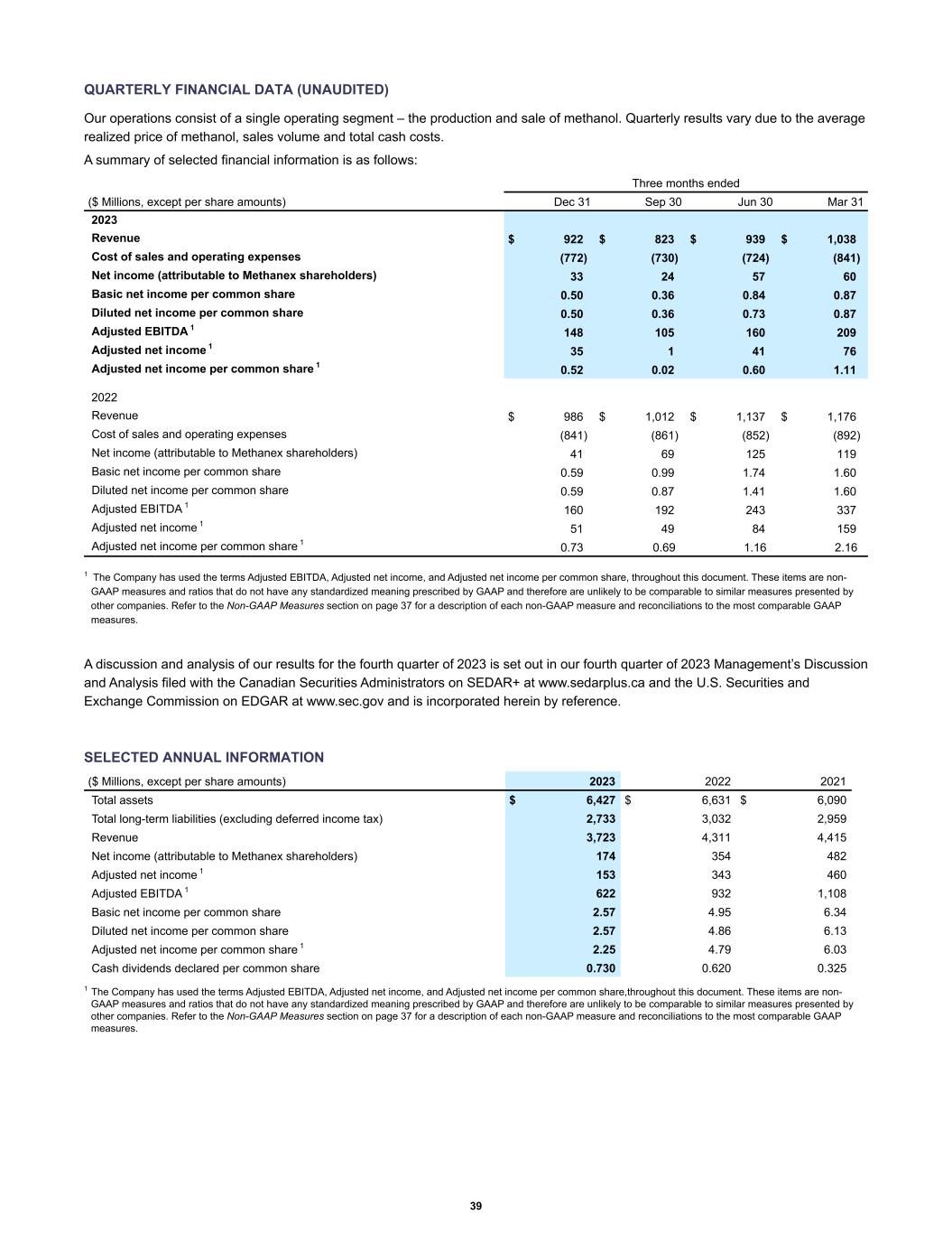 QUARTERLY FINANCIAL DATA (UNAUDITED) Our operations consist of a single operating segment – the production and sale of methanol. Quarterly results vary due to the average realized price of methanol, sales volume and total cash costs. A summary of selected financial information is as follows: ($ Millions, except per share amounts) Dec 31 Sep 30 Jun 30 Mar 31 2023 Revenue $ 922 $ 823 $ 939 $ 1,038 Cost of sales and operating expenses (772) (730) (724) (841) Net income (attributable to Methanex shareholders) 33 24 57 60 Basic net income per common share 0.50 0.36 0.84 0.87 Diluted net income per common share 0.50 0.36 0.73 0.87 Adjusted EBITDA 1 148 105 160 209 Adjusted net income 1 35 1 41 76 Adjusted net income per common share 1 0.52 0.02 0.60 1.11 2022 Revenue $ 986 $ 1,012 $ 1,137 $ 1,176 Cost of sales and operating expenses (841) (861) (852) (892) Net income (attributable to Methanex shareholders) 41 69 125 119 Basic net income per common share 0.59 0.99 1.74 1.60 Diluted net income per common share 0.59 0.87 1.41 1.60 Adjusted EBITDA 1 160 192 243 337 Adjusted net income 1 51 49 84 159 Adjusted net income per common share 1 0.73 0.69 1.16 2.16 Three months ended 1 The Company has used the terms Adjusted EBITDA, Adjusted net income, and Adjusted net income per common share, throughout this document. These items are non- GAAP measures and ratios that do not have any standardized meaning prescribed by GAAP and therefore are unlikely to be comparable to similar measures presented by other companies. Refer to the Non-GAAP Measures section on page 37 for a description of each non-GAAP measure and reconciliations to the most comparable GAAP measures. A discussion and analysis of our results for the fourth quarter of 2023 is set out in our fourth quarter of 2023 Management’s Discussion and Analysis filed with the Canadian Securities Administrators on SEDAR+ at www.sedarplus.ca and the U.S. Securities and Exchange Commission on EDGAR at www.sec.gov and is incorporated herein by reference. SELECTED ANNUAL INFORMATION Total assets $ 6,427 $ 6,631 $ 6,090 Total long-term liabilities (excluding deferred income tax) 2,733 3,032 2,959 Revenue 3,723 4,311 4,415 Net income (attributable to Methanex shareholders) 174 354 482 Adjusted net income 1 153 343 460 Adjusted EBITDA 1 622 932 1,108 Basic net income per common share 2.57 4.95 6.34 Diluted net income per common share 2.57 4.86 6.13 Adjusted net income per common share 1 2.25 4.79 6.03 Cash dividends declared per common share 0.730 0.620 0.325 ($ Millions, except per share amounts) 2023 2022 2021 1 The Company has used the terms Adjusted EBITDA, Adjusted net income, and Adjusted net income per common share,throughout this document. These items are non- GAAP measures and ratios that do not have any standardized meaning prescribed by GAAP and therefore are unlikely to be comparable to similar measures presented by other companies. Refer to the Non-GAAP Measures section on page 37 for a description of each non-GAAP measure and reconciliations to the most comparable GAAP measures. 39