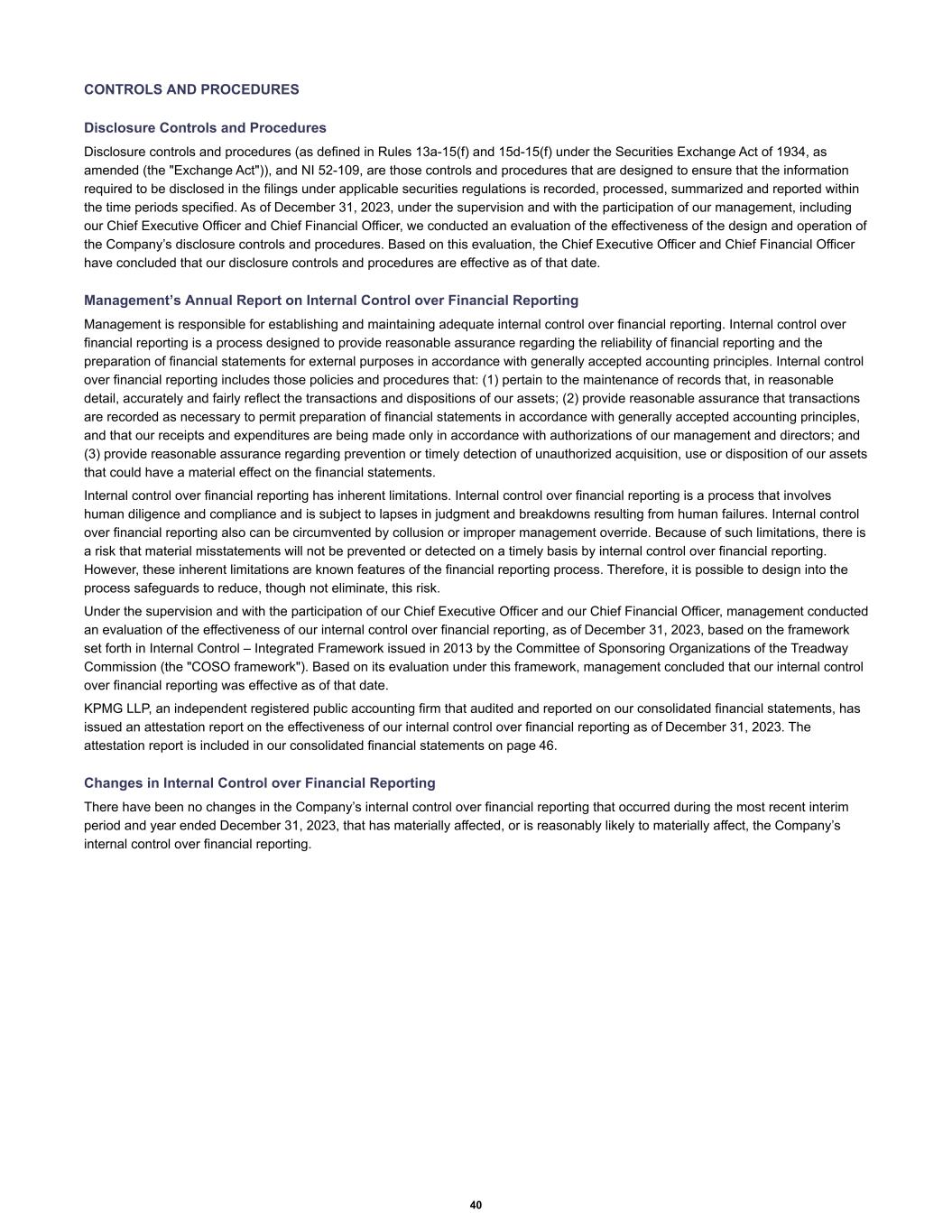 CONTROLS AND PROCEDURES Disclosure Controls and Procedures Disclosure controls and procedures (as defined in Rules 13a-15(f) and 15d-15(f) under the Securities Exchange Act of 1934, as amended (the "Exchange Act")), and NI 52-109, are those controls and procedures that are designed to ensure that the information required to be disclosed in the filings under applicable securities regulations is recorded, processed, summarized and reported within the time periods specified. As of December 31, 2023, under the supervision and with the participation of our management, including our Chief Executive Officer and Chief Financial Officer, we conducted an evaluation of the effectiveness of the design and operation of the Company’s disclosure controls and procedures. Based on this evaluation, the Chief Executive Officer and Chief Financial Officer have concluded that our disclosure controls and procedures are effective as of that date. Management’s Annual Report on Internal Control over Financial Reporting Management is responsible for establishing and maintaining adequate internal control over financial reporting. Internal control over financial reporting is a process designed to provide reasonable assurance regarding the reliability of financial reporting and the preparation of financial statements for external purposes in accordance with generally accepted accounting principles. Internal control over financial reporting includes those policies and procedures that: (1) pertain to the maintenance of records that, in reasonable detail, accurately and fairly reflect the transactions and dispositions of our assets; (2) provide reasonable assurance that transactions are recorded as necessary to permit preparation of financial statements in accordance with generally accepted accounting principles, and that our receipts and expenditures are being made only in accordance with authorizations of our management and directors; and (3) provide reasonable assurance regarding prevention or timely detection of unauthorized acquisition, use or disposition of our assets that could have a material effect on the financial statements. Internal control over financial reporting has inherent limitations. Internal control over financial reporting is a process that involves human diligence and compliance and is subject to lapses in judgment and breakdowns resulting from human failures. Internal control over financial reporting also can be circumvented by collusion or improper management override. Because of such limitations, there is a risk that material misstatements will not be prevented or detected on a timely basis by internal control over financial reporting. However, these inherent limitations are known features of the financial reporting process. Therefore, it is possible to design into the process safeguards to reduce, though not eliminate, this risk. Under the supervision and with the participation of our Chief Executive Officer and our Chief Financial Officer, management conducted an evaluation of the effectiveness of our internal control over financial reporting, as of December 31, 2023, based on the framework set forth in Internal Control – Integrated Framework issued in 2013 by the Committee of Sponsoring Organizations of the Treadway Commission (the "COSO framework"). Based on its evaluation under this framework, management concluded that our internal control over financial reporting was effective as of that date. KPMG LLP, an independent registered public accounting firm that audited and reported on our consolidated financial statements, has issued an attestation report on the effectiveness of our internal control over financial reporting as of December 31, 2023. The attestation report is included in our consolidated financial statements on page 46. Changes in Internal Control over Financial Reporting There have been no changes in the Company’s internal control over financial reporting that occurred during the most recent interim period and year ended December 31, 2023, that has materially affected, or is reasonably likely to materially affect, the Company’s internal control over financial reporting. 40
