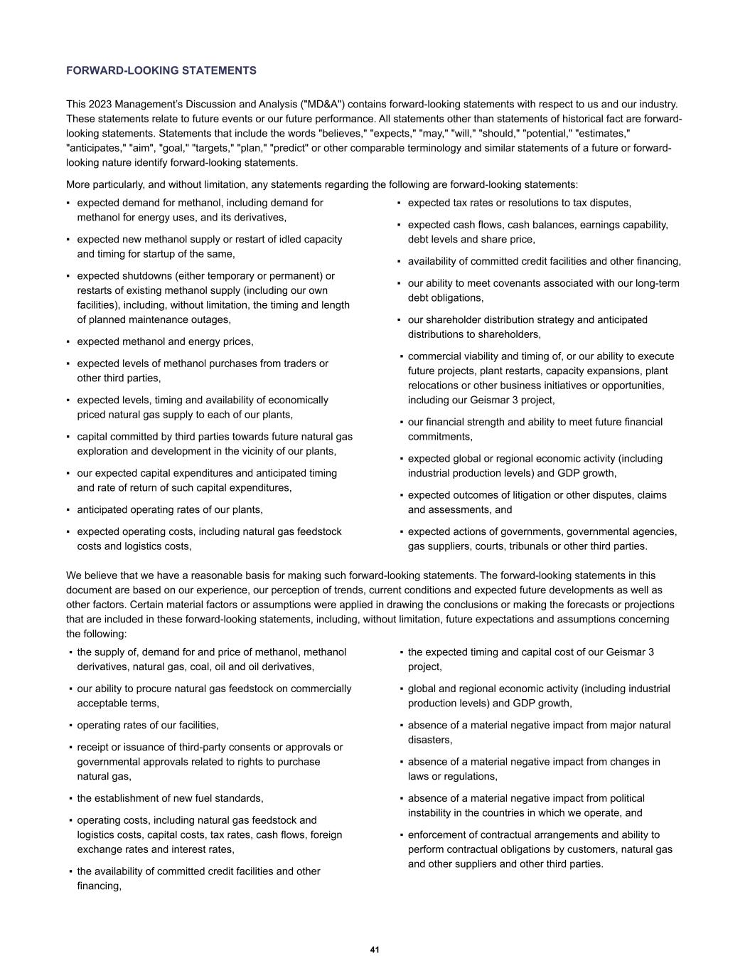 FORWARD-LOOKING STATEMENTS This 2023 Management’s Discussion and Analysis ("MD&A") contains forward-looking statements with respect to us and our industry. These statements relate to future events or our future performance. All statements other than statements of historical fact are forward- looking statements. Statements that include the words "believes," "expects," "may," "will," "should," "potential," "estimates," "anticipates," "aim", "goal," "targets," "plan," "predict" or other comparable terminology and similar statements of a future or forward- looking nature identify forward-looking statements. More particularly, and without limitation, any statements regarding the following are forward-looking statements: ▪ expected demand for methanol, including demand for methanol for energy uses, and its derivatives, ▪ expected new methanol supply or restart of idled capacity and timing for startup of the same, ▪ expected shutdowns (either temporary or permanent) or restarts of existing methanol supply (including our own facilities), including, without limitation, the timing and length of planned maintenance outages, ▪ expected methanol and energy prices, ▪ expected levels of methanol purchases from traders or other third parties, ▪ expected levels, timing and availability of economically priced natural gas supply to each of our plants, ▪ capital committed by third parties towards future natural gas exploration and development in the vicinity of our plants, ▪ our expected capital expenditures and anticipated timing and rate of return of such capital expenditures, ▪ anticipated operating rates of our plants, ▪ expected operating costs, including natural gas feedstock costs and logistics costs, ▪ expected tax rates or resolutions to tax disputes, ▪ expected cash flows, cash balances, earnings capability, debt levels and share price, ▪ availability of committed credit facilities and other financing, ▪ our ability to meet covenants associated with our long-term debt obligations, ▪ our shareholder distribution strategy and anticipated distributions to shareholders, ▪ commercial viability and timing of, or our ability to execute future projects, plant restarts, capacity expansions, plant relocations or other business initiatives or opportunities, including our Geismar 3 project, ▪ our financial strength and ability to meet future financial commitments, ▪ expected global or regional economic activity (including industrial production levels) and GDP growth, ▪ expected outcomes of litigation or other disputes, claims and assessments, and ▪ expected actions of governments, governmental agencies, gas suppliers, courts, tribunals or other third parties. We believe that we have a reasonable basis for making such forward-looking statements. The forward-looking statements in this document are based on our experience, our perception of trends, current conditions and expected future developments as well as other factors. Certain material factors or assumptions were applied in drawing the conclusions or making the forecasts or projections that are included in these forward-looking statements, including, without limitation, future expectations and assumptions concerning the following: ▪ the supply of, demand for and price of methanol, methanol derivatives, natural gas, coal, oil and oil derivatives, ▪ our ability to procure natural gas feedstock on commercially acceptable terms, ▪ operating rates of our facilities, ▪ receipt or issuance of third-party consents or approvals or governmental approvals related to rights to purchase natural gas, ▪ the establishment of new fuel standards, ▪ operating costs, including natural gas feedstock and logistics costs, capital costs, tax rates, cash flows, foreign exchange rates and interest rates, ▪ the availability of committed credit facilities and other financing, ▪ the expected timing and capital cost of our Geismar 3 project, ▪ global and regional economic activity (including industrial production levels) and GDP growth, ▪ absence of a material negative impact from major natural disasters, ▪ absence of a material negative impact from changes in laws or regulations, ▪ absence of a material negative impact from political instability in the countries in which we operate, and ▪ enforcement of contractual arrangements and ability to perform contractual obligations by customers, natural gas and other suppliers and other third parties. 41