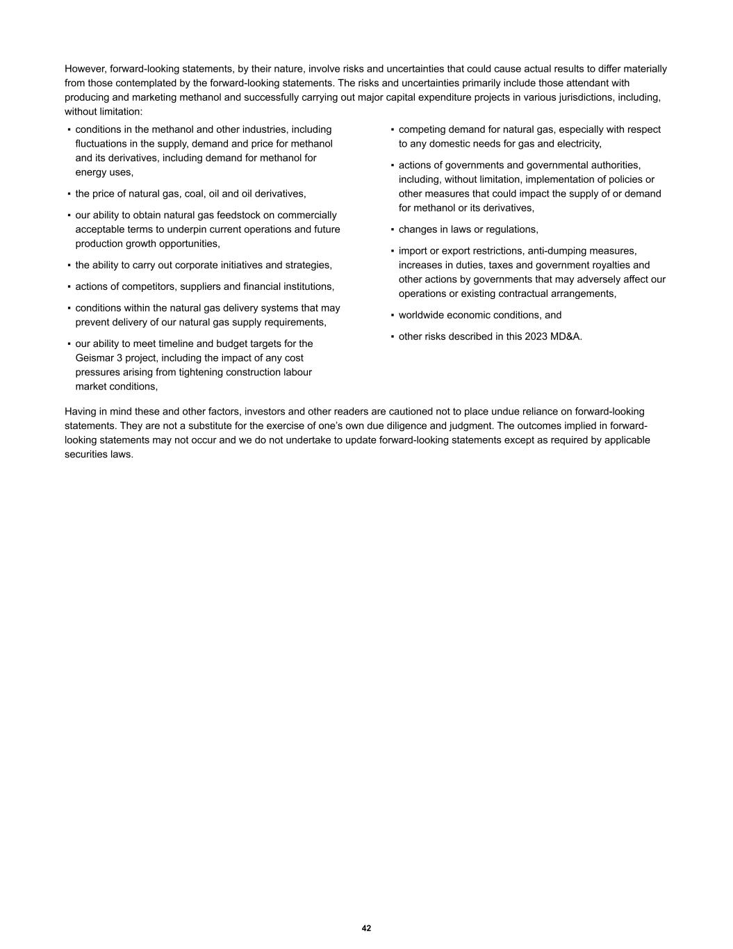 However, forward-looking statements, by their nature, involve risks and uncertainties that could cause actual results to differ materially from those contemplated by the forward-looking statements. The risks and uncertainties primarily include those attendant with producing and marketing methanol and successfully carrying out major capital expenditure projects in various jurisdictions, including, without limitation: ▪ conditions in the methanol and other industries, including fluctuations in the supply, demand and price for methanol and its derivatives, including demand for methanol for energy uses, ▪ the price of natural gas, coal, oil and oil derivatives, ▪ our ability to obtain natural gas feedstock on commercially acceptable terms to underpin current operations and future production growth opportunities, ▪ the ability to carry out corporate initiatives and strategies, ▪ actions of competitors, suppliers and financial institutions, ▪ conditions within the natural gas delivery systems that may prevent delivery of our natural gas supply requirements, ▪ our ability to meet timeline and budget targets for the Geismar 3 project, including the impact of any cost pressures arising from tightening construction labour market conditions, ▪ competing demand for natural gas, especially with respect to any domestic needs for gas and electricity, ▪ actions of governments and governmental authorities, including, without limitation, implementation of policies or other measures that could impact the supply of or demand for methanol or its derivatives, ▪ changes in laws or regulations, ▪ import or export restrictions, anti-dumping measures, increases in duties, taxes and government royalties and other actions by governments that may adversely affect our operations or existing contractual arrangements, ▪ worldwide economic conditions, and ▪ other risks described in this 2023 MD&A. Having in mind these and other factors, investors and other readers are cautioned not to place undue reliance on forward-looking statements. They are not a substitute for the exercise of one’s own due diligence and judgment. The outcomes implied in forward- looking statements may not occur and we do not undertake to update forward-looking statements except as required by applicable securities laws. 42
