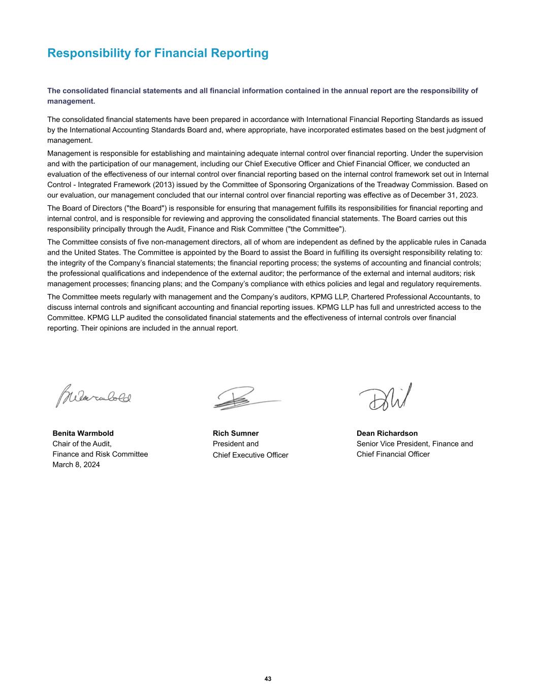 Responsibility for Financial Reporting The consolidated financial statements and all financial information contained in the annual report are the responsibility of management. The consolidated financial statements have been prepared in accordance with International Financial Reporting Standards as issued by the International Accounting Standards Board and, where appropriate, have incorporated estimates based on the best judgment of management. Management is responsible for establishing and maintaining adequate internal control over financial reporting. Under the supervision and with the participation of our management, including our Chief Executive Officer and Chief Financial Officer, we conducted an evaluation of the effectiveness of our internal control over financial reporting based on the internal control framework set out in Internal Control - Integrated Framework (2013) issued by the Committee of Sponsoring Organizations of the Treadway Commission. Based on our evaluation, our management concluded that our internal control over financial reporting was effective as of December 31, 2023. The Board of Directors ("the Board") is responsible for ensuring that management fulfills its responsibilities for financial reporting and internal control, and is responsible for reviewing and approving the consolidated financial statements. The Board carries out this responsibility principally through the Audit, Finance and Risk Committee ("the Committee"). The Committee consists of five non-management directors, all of whom are independent as defined by the applicable rules in Canada and the United States. The Committee is appointed by the Board to assist the Board in fulfilling its oversight responsibility relating to: the integrity of the Company’s financial statements; the financial reporting process; the systems of accounting and financial controls; the professional qualifications and independence of the external auditor; the performance of the external and internal auditors; risk management processes; financing plans; and the Company’s compliance with ethics policies and legal and regulatory requirements. The Committee meets regularly with management and the Company’s auditors, KPMG LLP, Chartered Professional Accountants, to discuss internal controls and significant accounting and financial reporting issues. KPMG LLP has full and unrestricted access to the Committee. KPMG LLP audited the consolidated financial statements and the effectiveness of internal controls over financial reporting. Their opinions are included in the annual report. Benita Warmbold Chair of the Audit, Finance and Risk Committee March 8, 2024 Rich Sumner President and Chief Executive Officer Dean Richardson Senior Vice President, Finance and Chief Financial Officer 43