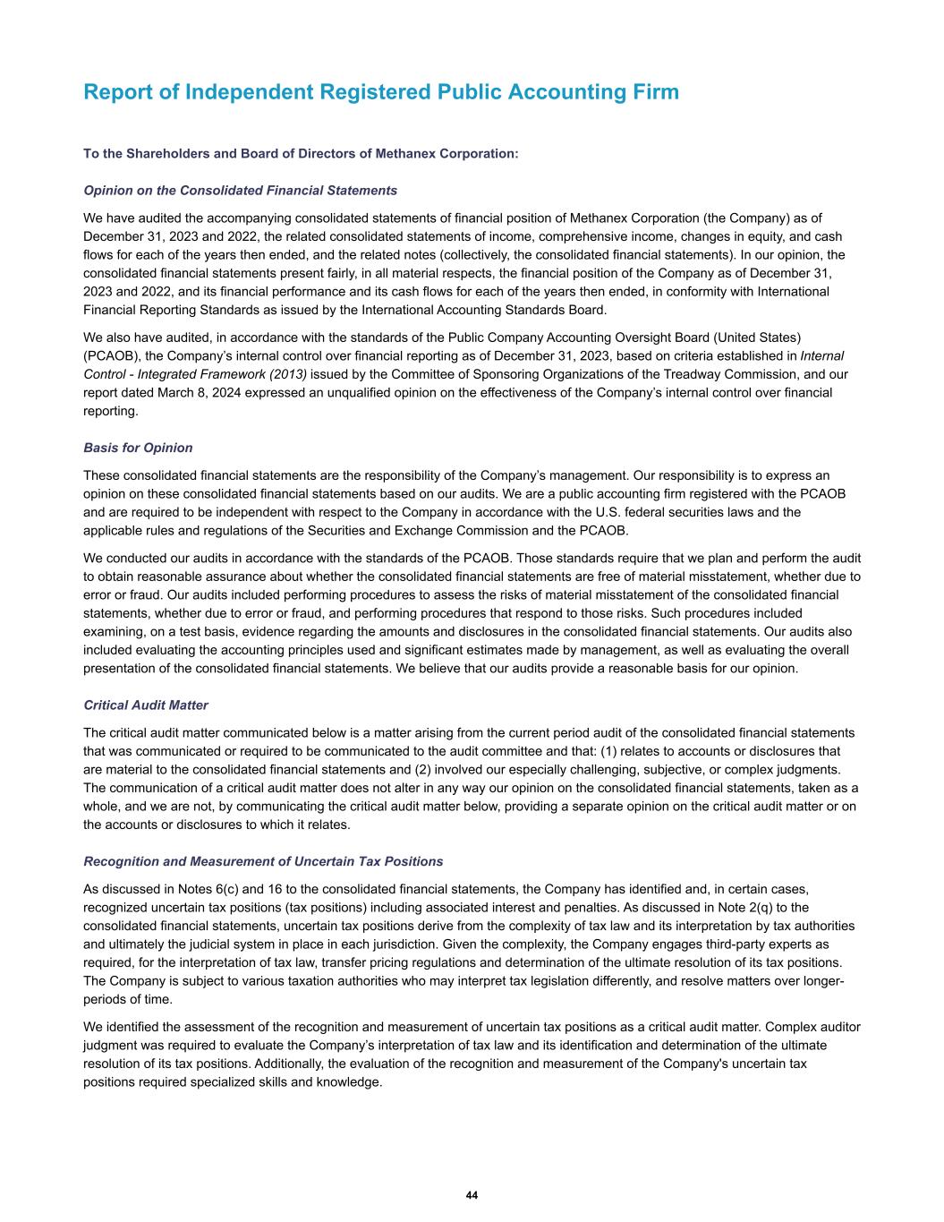 Report of Independent Registered Public Accounting Firm To the Shareholders and Board of Directors of Methanex Corporation: Opinion on the Consolidated Financial Statements We have audited the accompanying consolidated statements of financial position of Methanex Corporation (the Company) as of December 31, 2023 and 2022, the related consolidated statements of income, comprehensive income, changes in equity, and cash flows for each of the years then ended, and the related notes (collectively, the consolidated financial statements). In our opinion, the consolidated financial statements present fairly, in all material respects, the financial position of the Company as of December 31, 2023 and 2022, and its financial performance and its cash flows for each of the years then ended, in conformity with International Financial Reporting Standards as issued by the International Accounting Standards Board. We also have audited, in accordance with the standards of the Public Company Accounting Oversight Board (United States) (PCAOB), the Company’s internal control over financial reporting as of December 31, 2023, based on criteria established in Internal Control - Integrated Framework (2013) issued by the Committee of Sponsoring Organizations of the Treadway Commission, and our report dated March 8, 2024 expressed an unqualified opinion on the effectiveness of the Company’s internal control over financial reporting. Basis for Opinion These consolidated financial statements are the responsibility of the Company’s management. Our responsibility is to express an opinion on these consolidated financial statements based on our audits. We are a public accounting firm registered with the PCAOB and are required to be independent with respect to the Company in accordance with the U.S. federal securities laws and the applicable rules and regulations of the Securities and Exchange Commission and the PCAOB. We conducted our audits in accordance with the standards of the PCAOB. Those standards require that we plan and perform the audit to obtain reasonable assurance about whether the consolidated financial statements are free of material misstatement, whether due to error or fraud. Our audits included performing procedures to assess the risks of material misstatement of the consolidated financial statements, whether due to error or fraud, and performing procedures that respond to those risks. Such procedures included examining, on a test basis, evidence regarding the amounts and disclosures in the consolidated financial statements. Our audits also included evaluating the accounting principles used and significant estimates made by management, as well as evaluating the overall presentation of the consolidated financial statements. We believe that our audits provide a reasonable basis for our opinion. Critical Audit Matter The critical audit matter communicated below is a matter arising from the current period audit of the consolidated financial statements that was communicated or required to be communicated to the audit committee and that: (1) relates to accounts or disclosures that are material to the consolidated financial statements and (2) involved our especially challenging, subjective, or complex judgments. The communication of a critical audit matter does not alter in any way our opinion on the consolidated financial statements, taken as a whole, and we are not, by communicating the critical audit matter below, providing a separate opinion on the critical audit matter or on the accounts or disclosures to which it relates. Recognition and Measurement of Uncertain Tax Positions As discussed in Notes 6(c) and 16 to the consolidated financial statements, the Company has identified and, in certain cases, recognized uncertain tax positions (tax positions) including associated interest and penalties. As discussed in Note 2(q) to the consolidated financial statements, uncertain tax positions derive from the complexity of tax law and its interpretation by tax authorities and ultimately the judicial system in place in each jurisdiction. Given the complexity, the Company engages third-party experts as required, for the interpretation of tax law, transfer pricing regulations and determination of the ultimate resolution of its tax positions. The Company is subject to various taxation authorities who may interpret tax legislation differently, and resolve matters over longer- periods of time. We identified the assessment of the recognition and measurement of uncertain tax positions as a critical audit matter. Complex auditor judgment was required to evaluate the Company’s interpretation of tax law and its identification and determination of the ultimate resolution of its tax positions. Additionally, the evaluation of the recognition and measurement of the Company's uncertain tax positions required specialized skills and knowledge. 44