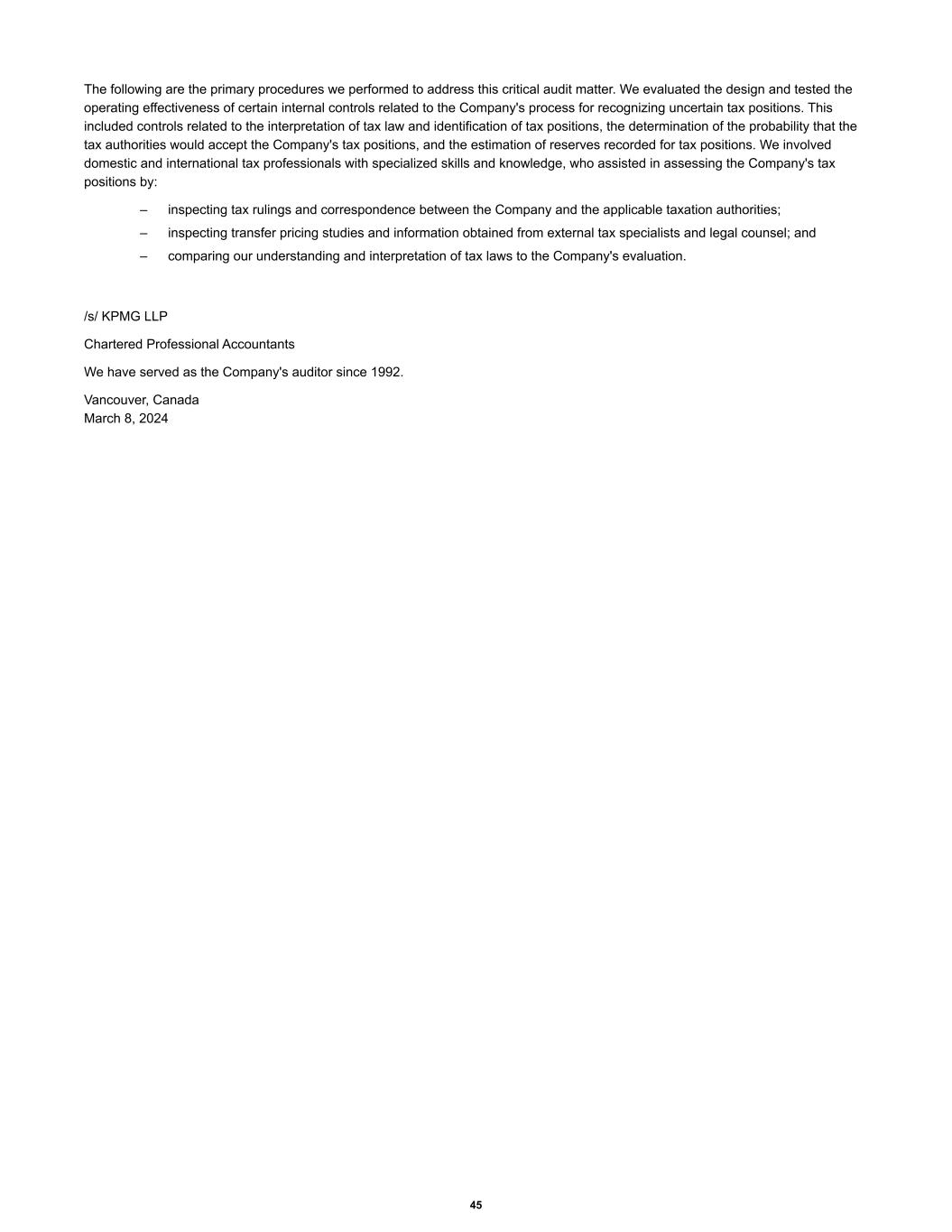 The following are the primary procedures we performed to address this critical audit matter. We evaluated the design and tested the operating effectiveness of certain internal controls related to the Company's process for recognizing uncertain tax positions. This included controls related to the interpretation of tax law and identification of tax positions, the determination of the probability that the tax authorities would accept the Company's tax positions, and the estimation of reserves recorded for tax positions. We involved domestic and international tax professionals with specialized skills and knowledge, who assisted in assessing the Company's tax positions by: – inspecting tax rulings and correspondence between the Company and the applicable taxation authorities; – inspecting transfer pricing studies and information obtained from external tax specialists and legal counsel; and – comparing our understanding and interpretation of tax laws to the Company's evaluation. /s/ KPMG LLP Chartered Professional Accountants We have served as the Company's auditor since 1992. Vancouver, Canada March 8, 2024 45